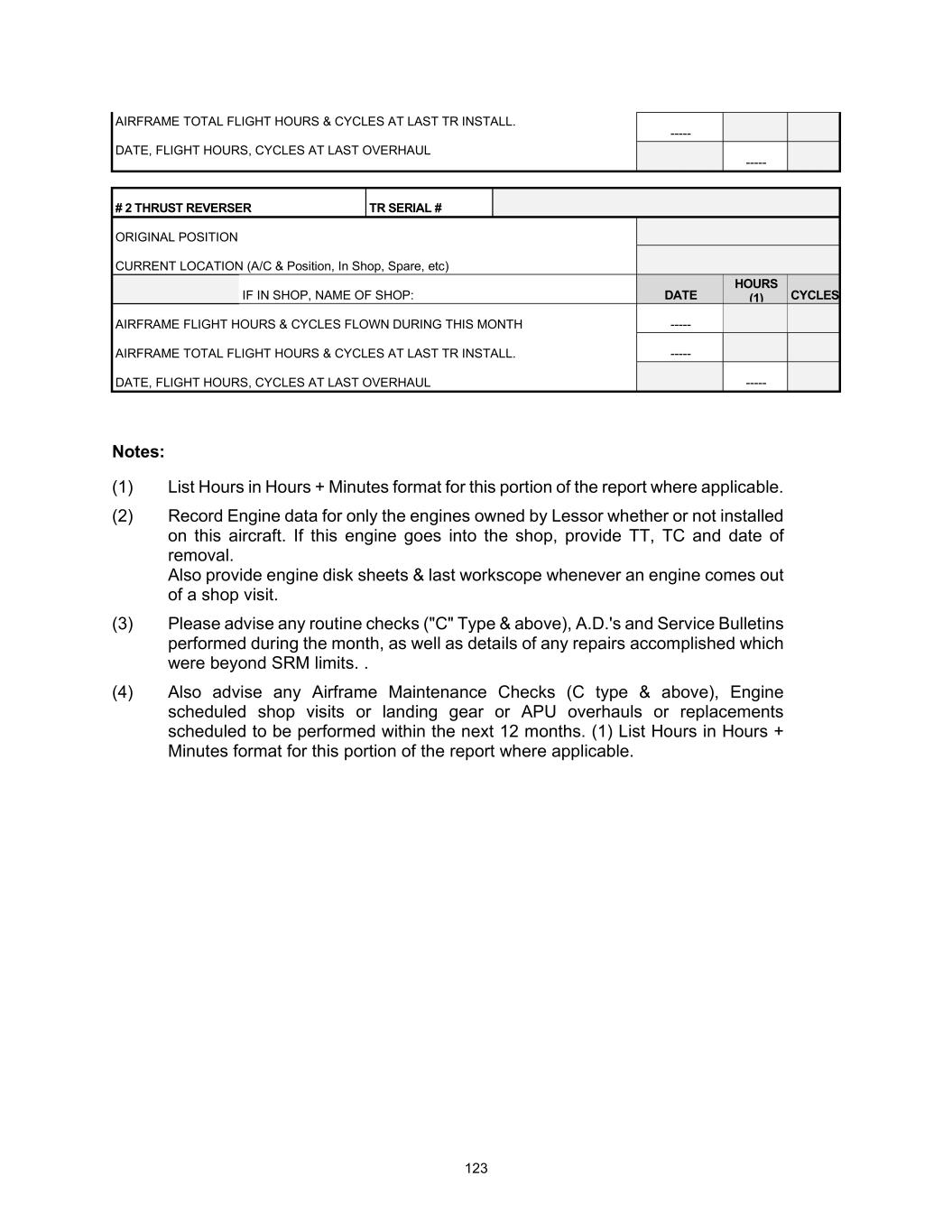 123 AIRFRAME TOTAL FLIGHT HOURS & CYCLES AT LAST TR INSTALL. ----- DATE, FLIGHT HOURS, CYCLES AT LAST OVERHAUL ----- # 2 THRUST REVERSER TR SERIAL # ORIGINAL POSITION CURRENT LOCATION (A/C & Position, In Shop, Spare, etc) IF IN SHOP, NAME OF SHOP: DATE HOURS (1) CYCLES AIRFRAME FLIGHT HOURS & CYCLES FLOWN DURING THIS MONTH ----- AIRFRAME TOTAL FLIGHT HOURS & CYCLES AT LAST TR INSTALL. ----- DATE, FLIGHT HOURS, CYCLES AT LAST OVERHAUL ----- Notes: (1) List Hours in Hours + Minutes format for this portion of the report where applicable. (2) Record Engine data for only the engines owned by Lessor whether or not installed on this aircraft. If this engine goes into the shop, provide TT, TC and date of removal. Also provide engine disk sheets & last workscope whenever an engine comes out of a shop visit. (3) Please advise any routine checks ("C" Type & above), A.D.'s and Service Bulletins performed during the month, as well as details of any repairs accomplished which were beyond SRM limits. . (4) Also advise any Airframe Maintenance Checks (C type & above), Engine scheduled shop visits or landing gear or APU overhauls or replacements scheduled to be performed within the next 12 months. (1) List Hours in Hours + Minutes format for this portion of the report where applicable.