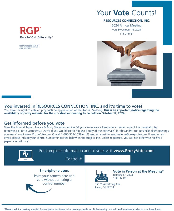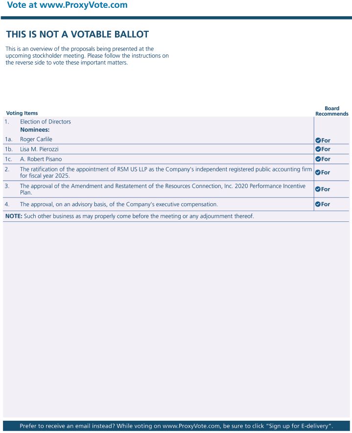 and 4. The ratification of the appointment of RSM US LLP as the Company's independent registered public accounting firm for fiscal year 2025. The approval of the Amendment and Restatement of the Resources Connection, Inc. 2020 Performance