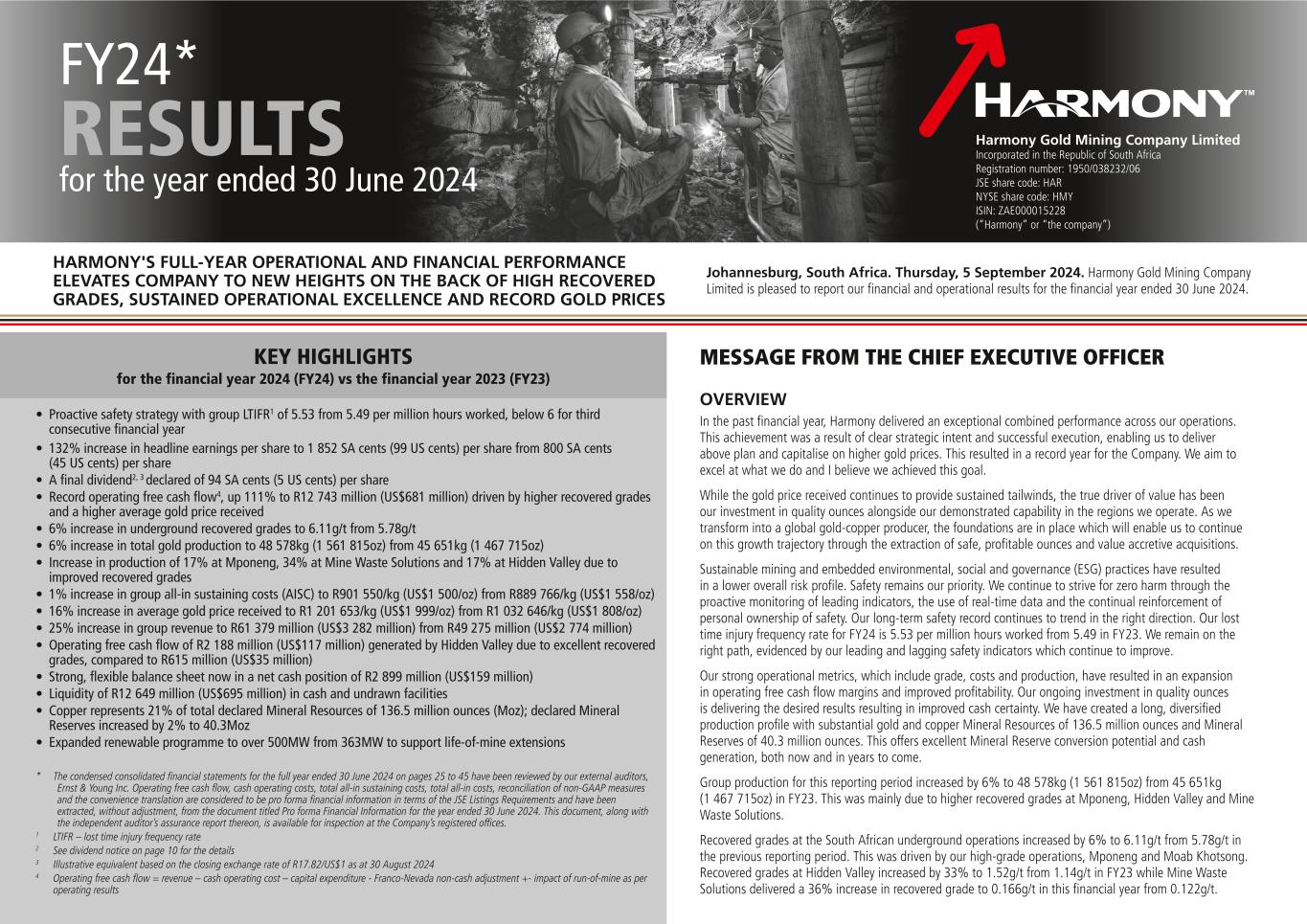 1 HARMONY GOLD MINING COMPANY LIMITED FY24 RESULTS FOR THE YEAR ENDED 30 JUNE 2024 • Proactive safety strategy with group LTIFR1 of 5.53 from 5.49 per million hours worked, below 6 for third consecutive financial year • 132% increase in headline earnings per share to 1 852 SA cents (99 US cents) per share from 800 SA cents (45 US cents) per share • A final dividend2, 3 declared of 94 SA cents (5 US cents) per share • Record operating free cash flow4, up 111% to R12 743 million (US$681 million) driven by higher recovered grades and a higher average gold price received • 6% increase in underground recovered grades to 6.11g/t from 5.78g/t • 6% increase in total gold production to 48 578kg (1 561 815oz) from 45 651kg (1 467 715oz) • Increase in production of 17% at Mponeng, 34% at Mine Waste Solutions and 17% at Hidden Valley due to improved recovered grades • 1% increase in group all-in sustaining costs (AISC) to R901 550/kg (US$1 500/oz) from R889 766/kg (US$1 558/oz) • 16% increase in average gold price received to R1 201 653/kg (US$1 999/oz) from R1 032 646/kg (US$1 808/oz) • 25% increase in group revenue to R61 379 million (US$3 282 million) from R49 275 million (US$2 774 million) • Operating free cash flow of R2 188 million (US$117 million) generated by Hidden Valley due to excellent recovered grades, compared to R615 million (US$35 million) • Strong, flexible balance sheet now in a net cash position of R2 899 million (US$159 million) • Liquidity of R12 649 million (US$695 million) in cash and undrawn facilities • Copper represents 21% of total declared Mineral Resources of 136.5 million ounces (Moz); declared Mineral Reserves increased by 2% to 40.3Moz • Expanded renewable programme to over 500MW from 363MW to support life-of-mine extensions MESSAGE FROM THE CHIEF EXECUTIVE OFFICER OVERVIEW In the past financial year, Harmony delivered an exceptional combined performance across our operations. This achievement was a result of clear strategic intent and successful execution, enabling us to deliver above plan and capitalise on higher gold prices. This resulted in a record year for the Company. We aim to excel at what we do and I believe we achieved this goal. While the gold price received continues to provide sustained tailwinds, the true driver of value has been our investment in quality ounces alongside our demonstrated capability in the regions we operate. As we transform into a global gold-copper producer, the foundations are in place which will enable us to continue on this growth trajectory through the extraction of safe, profitable ounces and value accretive acquisitions. Sustainable mining and embedded environmental, social and governance (ESG) practices have resulted in a lower overall risk profile. Safety remains our priority. We continue to strive for zero harm through the proactive monitoring of leading indicators, the use of real-time data and the continual reinforcement of personal ownership of safety. Our long-term safety record continues to trend in the right direction. Our lost time injury frequency rate for FY24 is 5.53 per million hours worked from 5.49 in FY23. We remain on the right path, evidenced by our leading and lagging safety indicators which continue to improve. Our strong operational metrics, which include grade, costs and production, have resulted in an expansion in operating free cash flow margins and improved profitability. Our ongoing investment in quality ounces is delivering the desired results resulting in improved cash certainty. We have created a long, diversified production profile with substantial gold and copper Mineral Resources of 136.5 million ounces and Mineral Reserves of 40.3 million ounces. This offers excellent Mineral Reserve conversion potential and cash generation, both now and in years to come. Group production for this reporting period increased by 6% to 48 578kg (1 561 815oz) from 45 651kg (1 467 715oz) in FY23. This was mainly due to higher recovered grades at Mponeng, Hidden Valley and Mine Waste Solutions. Recovered grades at the South African underground operations increased by 6% to 6.11g/t from 5.78g/t in the previous reporting period. This was driven by our high-grade operations, Mponeng and Moab Khotsong. Recovered grades at Hidden Valley increased by 33% to 1.52g/t from 1.14g/t in FY23 while Mine Waste Solutions delivered a 36% increase in recovered grade to 0.166g/t in this financial year from 0.122g/t. KEY HIGHLIGHTS for the financial year 2024 (FY24) vs the financial year 2023 (FY23) Harmony Gold Mining Company Limited Incorporated in the Republic of South Africa Registration number: 1950/038232/06 JSE share code: HAR NYSE share code: HMY ISIN: ZAE000015228 (“Harmony” or “the company”) FY24* RESULTS for the year ended 30 June 2024 HARMONY'S FULL-YEAR OPERATIONAL AND FINANCIAL PERFORMANCE ELEVATES COMPANY TO NEW HEIGHTS ON THE BACK OF HIGH RECOVERED GRADES, SUSTAINED OPERATIONAL EXCELLENCE AND RECORD GOLD PRICES * The condensed consolidated financial statements for the full year ended 30 June 2024 on pages 25 to 45 have been reviewed by our external auditors, Ernst & Young Inc. Operating free cash flow, cash operating costs, total all-in sustaining costs, total all-in costs, reconciliation of non-GAAP measures and the convenience translation are considered to be pro forma financial information in terms of the JSE Listings Requirements and have been extracted, without adjustment, from the document titled Pro forma Financial Information for the year ended 30 June 2024. This document, along with the independent auditor’s assurance report thereon, is available for inspection at the Company’s registered offices. 1 LTIFR – lost time injury frequency rate 2 See dividend notice on page 10 for the details 3 Illustrative equivalent based on the closing exchange rate of R17.82/US$1 as at 30 August 2024 4 Operating free cash flow = revenue – cash operating cost – capital expenditure - F