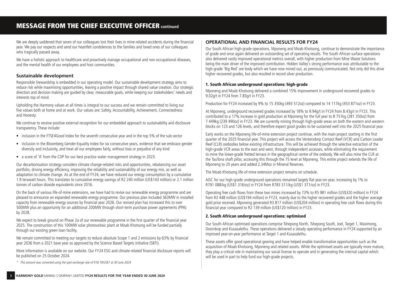 3 HARMONY GOLD MINING COMPANY LIMITED FY24 RESULTS FOR THE YEAR ENDED 30 JUNE 2024 We are deeply saddened that seven of our colleagues lost their lives in mine-related accidents during the financial year. We pay our respects and send our heartfelt condolences to the families and loved ones of our colleagues who tragically passed away. We have a holistic approach to healthcare and proactively manage occupational and non-occupational diseases, and the mental health of our employees and host communities. Sustainable development Responsible Stewardship is embedded in our operating model. Our sustainable development strategy aims to reduce risk while maximising opportunities, leaving a positive impact through shared value creation. Our strategic direction and decision making are guided by clear, measurable goals, while keeping our stakeholders’ needs and interests top of mind. Upholding the Harmony values at all times is integral to our success and we remain committed to living our five values both at home and at work. Our values are: Safety, Accountability, Achievement, Connectedness and Honesty. We continue to receive positive external recognition for our embedded approach to sustainability and disclosure transparency. These include: • inclusion in the FTSE4Good Index for the seventh consecutive year and in the top 5% of the sub-sector • inclusion in the Bloomberg Gender-Equality Index for six consecutive years, evidence that we embrace gender diversity and inclusivity, and treat all our employees fairly, without bias or prejudice of any kind • a score of ‘A’ from the CDP for our best practice water management strategy in 2023. Our decarbonisation strategy considers climate change-related risks and opportunities, rebalancing our asset portfolio, driving energy efficiency, improving the reliability and sustainability of our energy mix, as well as adaptation to climate change. As at the end of FY24, we have reduced our energy consumption by a cumulative 1.9 terawatt hours. This translates to cumulative energy savings of R2 240 million (US$143 million) or 2.1 million tonnes of carbon dioxide equivalents since 2016. On the back of various life-of-mine extensions, we have had to revise our renewable energy programme and are pleased to announce an expanded renewable energy programme. Our previous plan included 363MW in installed capacity from renewable energy sources by financial year 2026. Our revised plan has increased this to over 500MW plus an opportunity for an additional 200MW through short-term purchase power agreements (PPA) by 2028. We expect to break ground on Phase 2a of our renewable programme in the first quarter of the financial year 2025. The construction of this 100MW solar photovoltaic plant at Moab Khotsong will be funded partially through our existing green loan facility. We remain committed to meeting our targets to reduce absolute Scope 1 and 2 emissions by 63% by financial year 2036 from a 2021 base year as approved by the Science Based Targets initiative (SBTi). More information is available on our website. Our FY24 ESG and climate-related financial disclosure reports will be published on 25 October 2024. * This amount was converted using the spot exchange rate of R18.19/US$1 at 30 June 2024. OPERATIONAL AND FINANCIAL RESULTS FOR FY24 Our South African high-grade operations, Mponeng and Moab Khotsong, continue to demonstrate the importance of grade and once again delivered an outstanding set of operating results. The South African surface operations also delivered vastly improved operational metrics overall, with higher production from Mine Waste Solutions being the main driver of the improved contribution. Hidden Valley's strong performance was attributable to the high-grade 'Big Red' ore body which we have now mined out, as previously communicated. Not only did this drive higher recovered grades, but also resulted in record silver production. 1. South African underground operations: high-grade Mponeng and Moab Khotsong delivered a combined 15% improvement in underground recovered grades to 9.02g/t in FY24 from 7.83g/t in FY23. Production for FY24 increased by 9% to 15 350kg (493 512oz) compared to 14 117kg (453 871oz) in FY23. At Mponeng, underground recovered grades increased by 18% to 9.94g/t in FY24 from 8.43g/t in FY23. This contributed to a 17% increase in gold production at Mponeng for the full year to 8 751kg (281 350oz) from 7 449kg (239 490oz) in FY23. We are currently mining through high-grade areas on both the eastern and western blocks on 123 and 126 levels, and therefore expect good grades to be sustained well into the 2025 financial year. Early works on the Mponeng life-of-mine extension project continue, with the main project starting in the first quarter of the 2025 financial year. This project will access the Ventersdorp Contact Reef (VCR) and Carbon Leader Reef (CLR) orebodies below existing infrastructure. This will be achieved through the selective extraction of the high-grade VCR areas to the east and west, through independent accesses, while eliminating the requirement to mine the lower-grade fretted terrace in the geographical centre of the orebody. We will also mine the CLR at the TauTona shaft pillar, accessing this through the 75 level at Mponeng. This entire project extends the life of Mponeng to 20 years and added 2.34Moz in Mineral Reserves. The Moab Khotsong life-of-mine extension project remains on schedule. AISC for our high-grade underground operations remained largely flat year-on-year, increasing by 1% to R791 088/kg (US$1 316/oz) in FY24 from R783 311/kg (US$1 371/oz) in FY23. Operating free cash flows from these two mines increased by 73% to R5 981 million (US$320 million) in FY24 from R3 448 million (US$194 million) in FY23, mainly due to the higher recovered grades and the higher average gold price received. Mponeng generated R3 817 million (US$204 million) in operating free cash flows during this financial year compared 