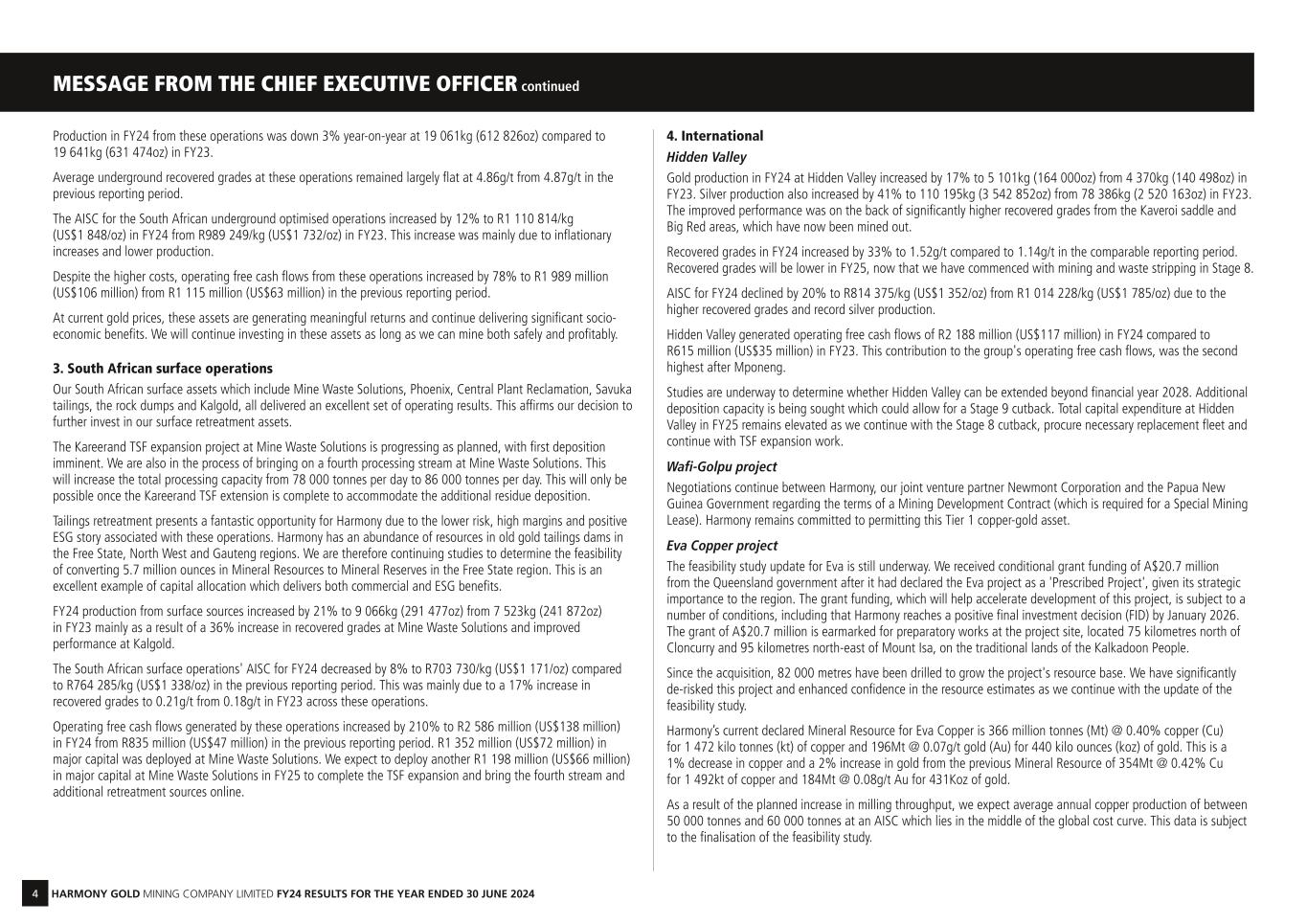 4 HARMONY GOLD MINING COMPANY LIMITED FY24 RESULTS FOR THE YEAR ENDED 30 JUNE 2024 MESSAGE FROM THE CHIEF EXECUTIVE OFFICER continued Production in FY24 from these operations was down 3% year-on-year at 19 061kg (612 826oz) compared to 19 641kg (631 474oz) in FY23. Average underground recovered grades at these operations remained largely flat at 4.86g/t from 4.87g/t in the previous reporting period. The AISC for the South African underground optimised operations increased by 12% to R1 110 814/kg (US$1 848/oz) in FY24 from R989 249/kg (US$1 732/oz) in FY23. This increase was mainly due to inflationary increases and lower production. Despite the higher costs, operating free cash flows from these operations increased by 78% to R1 989 million (US$106 million) from R1 115 million (US$63 million) in the previous reporting period. At current gold prices, these assets are generating meaningful returns and continue delivering significant socio- economic benefits. We will continue investing in these assets as long as we can mine both safely and profitably. 3. South African surface operations Our South African surface assets which include Mine Waste Solutions, Phoenix, Central Plant Reclamation, Savuka tailings, the rock dumps and Kalgold, all delivered an excellent set of operating results. This affirms our decision to further invest in our surface retreatment assets. The Kareerand TSF expansion project at Mine Waste Solutions is progressing as planned, with first deposition imminent. We are also in the process of bringing on a fourth processing stream at Mine Waste Solutions. This will increase the total processing capacity from 78 000 tonnes per day to 86 000 tonnes per day. This will only be possible once the Kareerand TSF extension is complete to accommodate the additional residue deposition. Tailings retreatment presents a fantastic opportunity for Harmony due to the lower risk, high margins and positive ESG story associated with these operations. Harmony has an abundance of resources in old gold tailings dams in the Free State, North West and Gauteng regions. We are therefore continuing studies to determine the feasibility of converting 5.7 million ounces in Mineral Resources to Mineral Reserves in the Free State region. This is an excellent example of capital allocation which delivers both commercial and ESG benefits. FY24 production from surface sources increased by 21% to 9 066kg (291 477oz) from 7 523kg (241 872oz) in FY23 mainly as a result of a 36% increase in recovered grades at Mine Waste Solutions and improved performance at Kalgold. The South African surface operations' AISC for FY24 decreased by 8% to R703 730/kg (US$1 171/oz) compared to R764 285/kg (US$1 338/oz) in the previous reporting period. This was mainly due to a 17% increase in recovered grades to 0.21g/t from 0.18g/t in FY23 across these operations. Operating free cash flows generated by these operations increased by 210% to R2 586 million (US$138 million) in FY24 from R835 million (US$47 million) in the previous reporting period. R1 352 million (US$72 million) in major capital was deployed at Mine Waste Solutions. We expect to deploy another R1 198 million (US$66 million) in major capital at Mine Waste Solutions in FY25 to complete the TSF expansion and bring the fourth stream and additional retreatment sources online. 4. International Hidden Valley Gold production in FY24 at Hidden Valley increased by 17% to 5 101kg (164 000oz) from 4 370kg (140 498oz) in FY23. Silver production also increased by 41% to 110 195kg (3 542 852oz) from 78 386kg (2 520 163oz) in FY23. The improved performance was on the back of significantly higher recovered grades from the Kaveroi saddle and Big Red areas, which have now been mined out. Recovered grades in FY24 increased by 33% to 1.52g/t compared to 1.14g/t in the comparable reporting period. Recovered grades will be lower in FY25, now that we have commenced with mining and waste stripping in Stage 8. AISC for FY24 declined by 20% to R814 375/kg (US$1 352/oz) from R1 014 228/kg (US$1 785/oz) due to the higher recovered grades and record silver production. Hidden Valley generated operating free cash flows of R2 188 million (US$117 million) in FY24 compared to R615 million (US$35 million) in FY23. This contribution to the group's operating free cash flows, was the second highest after Mponeng. Studies are underway to determine whether Hidden Valley can be extended beyond financial year 2028. Additional deposition capacity is being sought which could allow for a Stage 9 cutback. Total capital expenditure at Hidden Valley in FY25 remains elevated as we continue with the Stage 8 cutback, procure necessary replacement fleet and continue with TSF expansion work. Wafi-Golpu project Negotiations continue between Harmony, our joint venture partner Newmont Corporation and the Papua New Guinea Government regarding the terms of a Mining Development Contract (which is required for a Special Mining Lease). Harmony remains committed to permitting this Tier 1 copper-gold asset. Eva Copper project The feasibility study update for Eva is still underway. We received conditional grant funding of A$20.7 million from the Queensland government after it had declared the Eva project as a 'Prescribed Project', given its strategic importance to the region. The grant funding, which will help accelerate development of this project, is subject to a number of conditions, including that Harmony reaches a positive final investment decision (FID) by January 2026. The grant of A$20.7 million is earmarked for preparatory works at the project site, located 75 kilometres north of Cloncurry and 95 kilometres north-east of Mount Isa, on the traditional lands of the Kalkadoon People. Since the acquisition, 82 000 metres have been drilled to grow the project's resource base. We have significantly de-risked this project and enhanced confidence in the resource estimates as we continue with the update of the feasibility study. Harmo