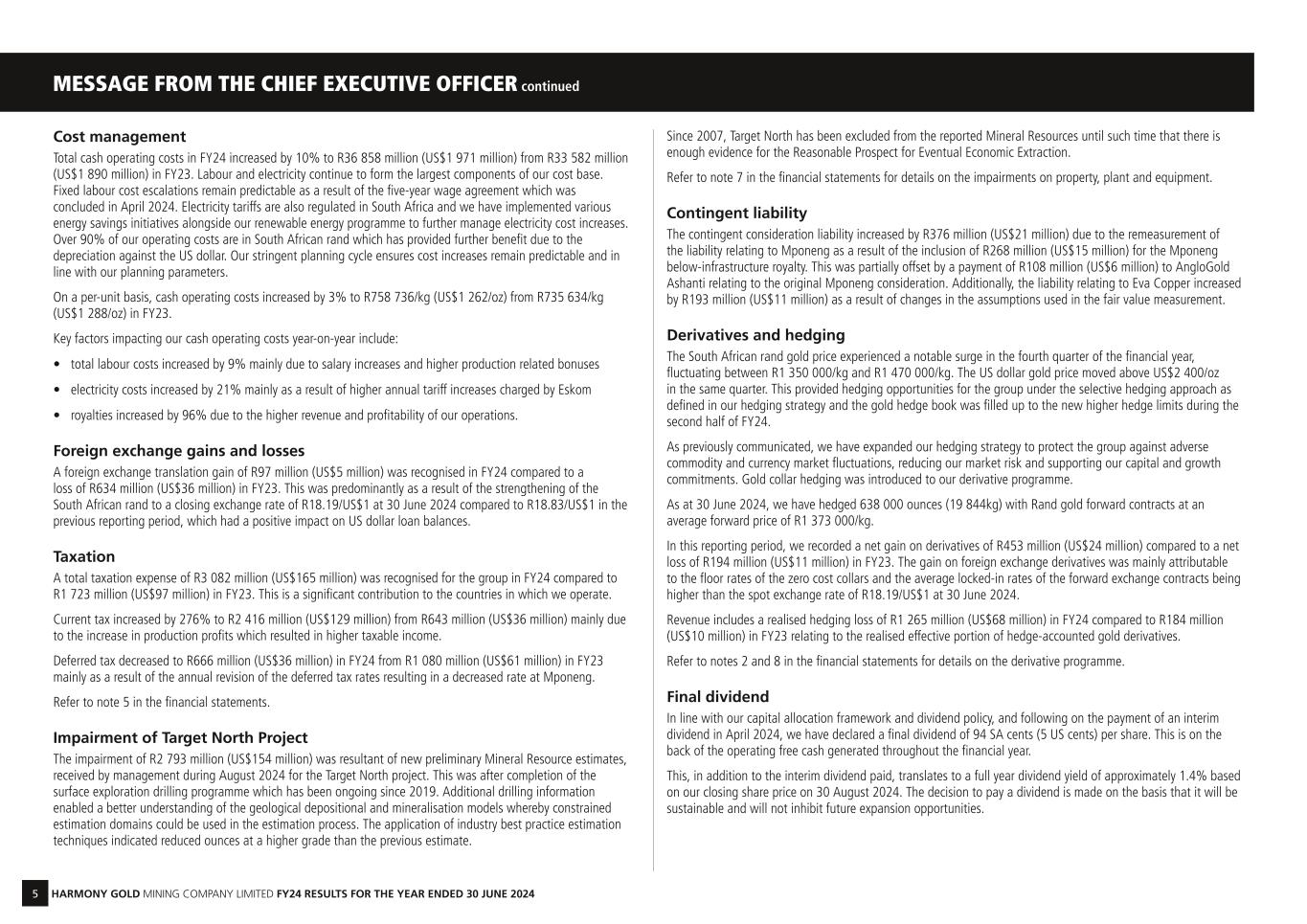 5 HARMONY GOLD MINING COMPANY LIMITED FY24 RESULTS FOR THE YEAR ENDED 30 JUNE 2024 Cost management Total cash operating costs in FY24 increased by 10% to R36 858 million (US$1 971 million) from R33 582 million (US$1 890 million) in FY23. Labour and electricity continue to form the largest components of our cost base. Fixed labour cost escalations remain predictable as a result of the five-year wage agreement which was concluded in April 2024. Electricity tariffs are also regulated in South Africa and we have implemented various energy savings initiatives alongside our renewable energy programme to further manage electricity cost increases. Over 90% of our operating costs are in South African rand which has provided further benefit due to the depreciation against the US dollar. Our stringent planning cycle ensures cost increases remain predictable and in line with our planning parameters. On a per-unit basis, cash operating costs increased by 3% to R758 736/kg (US$1 262/oz) from R735 634/kg (US$1 288/oz) in FY23. Key factors impacting our cash operating costs year-on-year include: • total labour costs increased by 9% mainly due to salary increases and higher production related bonuses • electricity costs increased by 21% mainly as a result of higher annual tariff increases charged by Eskom • royalties increased by 96% due to the higher revenue and profitability of our operations. Foreign exchange gains and losses A foreign exchange translation gain of R97 million (US$5 million) was recognised in FY24 compared to a loss of R634 million (US$36 million) in FY23. This was predominantly as a result of the strengthening of the South African rand to a closing exchange rate of R18.19/US$1 at 30 June 2024 compared to R18.83/US$1 in the previous reporting period, which had a positive impact on US dollar loan balances. Taxation A total taxation expense of R3 082 million (US$165 million) was recognised for the group in FY24 compared to R1 723 million (US$97 million) in FY23. This is a significant contribution to the countries in which we operate. Current tax increased by 276% to R2 416 million (US$129 million) from R643 million (US$36 million) mainly due to the increase in production profits which resulted in higher taxable income. Deferred tax decreased to R666 million (US$36 million) in FY24 from R1 080 million (US$61 million) in FY23 mainly as a result of the annual revision of the deferred tax rates resulting in a decreased rate at Mponeng. Refer to note 5 in the financial statements. Impairment of Target North Project The impairment of R2 793 million (US$154 million) was resultant of new preliminary Mineral Resource estimates, received by management during August 2024 for the Target North project. This was after completion of the surface exploration drilling programme which has been ongoing since 2019. Additional drilling information enabled a better understanding of the geological depositional and mineralisation models whereby constrained estimation domains could be used in the estimation process. The application of industry best practice estimation techniques indicated reduced ounces at a higher grade than the previous estimate. MESSAGE FROM THE CHIEF EXECUTIVE OFFICER continued Since 2007, Target North has been excluded from the reported Mineral Resources until such time that there is enough evidence for the Reasonable Prospect for Eventual Economic Extraction. Refer to note 7 in the financial statements for details on the impairments on property, plant and equipment. Contingent liability The contingent consideration liability increased by R376 million (US$21 million) due to the remeasurement of the liability relating to Mponeng as a result of the inclusion of R268 million (US$15 million) for the Mponeng below-infrastructure royalty. This was partially offset by a payment of R108 million (US$6 million) to AngloGold Ashanti relating to the original Mponeng consideration. Additionally, the liability relating to Eva Copper increased by R193 million (US$11 million) as a result of changes in the assumptions used in the fair value measurement. Derivatives and hedging The South African rand gold price experienced a notable surge in the fourth quarter of the financial year, fluctuating between R1 350 000/kg and R1 470 000/kg. The US dollar gold price moved above US$2 400/oz in the same quarter. This provided hedging opportunities for the group under the selective hedging approach as defined in our hedging strategy and the gold hedge book was filled up to the new higher hedge limits during the second half of FY24. As previously communicated, we have expanded our hedging strategy to protect the group against adverse commodity and currency market fluctuations, reducing our market risk and supporting our capital and growth commitments. Gold collar hedging was introduced to our derivative programme. As at 30 June 2024, we have hedged 638 000 ounces (19 844kg) with Rand gold forward contracts at an average forward price of R1 373 000/kg. In this reporting period, we recorded a net gain on derivatives of R453 million (US$24 million) compared to a net loss of R194 million (US$11 million) in FY23. The gain on foreign exchange derivatives was mainly attributable to the floor rates of the zero cost collars and the average locked-in rates of the forward exchange contracts being higher than the spot exchange rate of R18.19/US$1 at 30 June 2024. Revenue includes a realised hedging loss of R1 265 million (US$68 million) in FY24 compared to R184 million (US$10 million) in FY23 relating to the realised effective portion of hedge-accounted gold derivatives. Refer to notes 2 and 8 in the financial statements for details on the derivative programme. Final dividend In line with our capital allocation framework and dividend policy, and following on the payment of an interim dividend in April 2024, we have declared a final dividend of 94 SA cents (5 US cents) per share. This is on the back of the operating free cash 