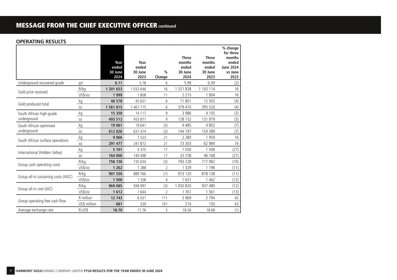 7 HARMONY GOLD MINING COMPANY LIMITED FY24 RESULTS FOR THE YEAR ENDED 30 JUNE 2024 MESSAGE FROM THE CHIEF EXECUTIVE OFFICER continued OPERATING RESULTS Year ended 30 June 2024 Year ended 30 June 2023 % Change Three months ended 30 June 2024 Three months ended 30 June 2023 % change for three months ended June 2024 vs June 2023 Underground recovered grade g/t 6.11 5.78 6 5.99 6.09 (2) Gold price received R/kg 1 201 653 1 032 646 16 1 321 838 1 143 114 16 US$/oz 1 999 1 808 11 2 215 1 904 16 Gold produced total kg 48 578 45 651 6 11 801 12 302 (4) oz 1 561 815 1 467 715 6 379 410 395 520 (4) South African high-grade underground kg 15 350 14 117 9 3 986 4 105 (3) oz 493 512 453 871 9 128 152 131 979 (3) South African optimised underground kg 19 061 19 641 (3) 4 485 4 802 (7) oz 612 826 631 474 (3) 144 197 154 389 (7) South African surface operations kg 9 066 7 523 21 2 280 1 959 16 oz 291 477 241 872 21 73 303 62 984 16 International (Hidden Valley) kg 5 101 4 370 17 1 050 1 436 (27) oz 164 000 140 498 17 33 758 46 168 (27) Group cash operating costs R/kg 758 736 735 634 (3) 793 228 717 982 (10) US$/oz 1 262 1 288 2 1 329 1 196 (11) Group all-in sustaining costs (AISC) R/kg 901 550 889 766 (1) 973 120 878 138 (11) US$/oz 1 500 1 558 4 1 631 1 462 (12) Group all-in cost (AIC) R/kg 969 085 938 997 (3) 1 050 820 937 480 (12) US$/oz 1 612 1 644 2 1 761 1 561 (13) Group operating free cash flow R million 12 743 6 031 111 3 969 2 794 42 US$ million 681 339 101 214 150 43 Average exchange rate R:US$ 18.70 17.76 5 18.56 18.68 (1)