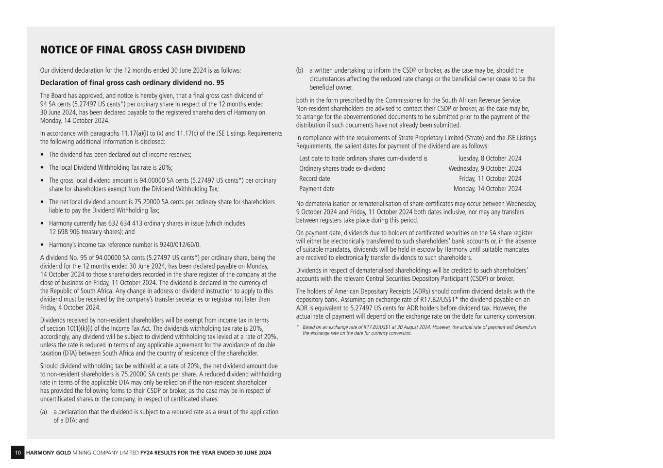 10 HARMONY GOLD MINING COMPANY LIMITED FY24 RESULTS FOR THE YEAR ENDED 30 JUNE 2024 NOTICE OF FINAL GROSS CASH DIVIDEND Our dividend declaration for the 12 months ended 30 June 2024 is as follows: Declaration of final gross cash ordinary dividend no. 95 The Board has approved, and notice is hereby given, that a final gross cash dividend of 94 SA cents (5.27497 US cents*) per ordinary share in respect of the 12 months ended 30 June 2024, has been declared payable to the registered shareholders of Harmony on Monday, 14 October 2024. In accordance with paragraphs 11.17(a)(i) to (x) and 11.17(c) of the JSE Listings Requirements the following additional information is disclosed: • The dividend has been declared out of income reserves; • The local Dividend Withholding Tax rate is 20%; • The gross local dividend amount is 94.00000 SA cents (5.27497 US cents*) per ordinary share for shareholders exempt from the Dividend Withholding Tax; • The net local dividend amount is 75.20000 SA cents per ordinary share for shareholders liable to pay the Dividend Withholding Tax; • Harmony currently has 632 634 413 ordinary shares in issue (which includes 12 698 906 treasury shares); and • Harmony’s income tax reference number is 9240/012/60/0. A dividend No. 95 of 94.00000 SA cents (5.27497 US cents*) per ordinary share, being the dividend for the 12 months ended 30 June 2024, has been declared payable on Monday, 14 October 2024 to those shareholders recorded in the share register of the company at the close of business on Friday, 11 October 2024. The dividend is declared in the currency of the Republic of South Africa. Any change in address or dividend instruction to apply to this dividend must be received by the company’s transfer secretaries or registrar not later than Friday, 4 October 2024. Dividends received by non-resident shareholders will be exempt from income tax in terms of section 10(1)(k)(i) of the Income Tax Act. The dividends withholding tax rate is 20%, accordingly, any dividend will be subject to dividend withholding tax levied at a rate of 20%, unless the rate is reduced in terms of any applicable agreement for the avoidance of double taxation (DTA) between South Africa and the country of residence of the shareholder. Should dividend withholding tax be withheld at a rate of 20%, the net dividend amount due to non-resident shareholders is 75.20000 SA cents per share. A reduced dividend withholding rate in terms of the applicable DTA may only be relied on if the non-resident shareholder has provided the following forms to their CSDP or broker, as the case may be in respect of uncertificated shares or the company, in respect of certificated shares: (a) a declaration that the dividend is subject to a reduced rate as a result of the application of a DTA; and (b) a written undertaking to inform the CSDP or broker, as the case may be, should the circumstances affecting the reduced rate change or the beneficial owner cease to be the beneficial owner, both in the form prescribed by the Commissioner for the South African Revenue Service. Non-resident shareholders are advised to contact their CSDP or broker, as the case may be, to arrange for the abovementioned documents to be submitted prior to the payment of the distribution if such documents have not already been submitted. In compliance with the requirements of Strate Proprietary Limited (Strate) and the JSE Listings Requirements, the salient dates for payment of the dividend are as follows: Last date to trade ordinary shares cum-dividend is Tuesday, 8 October 2024 Ordinary shares trade ex-dividend Wednesday, 9 October 2024 Record date Friday, 11 October 2024 Payment date Monday, 14 October 2024 No dematerialisation or rematerialisation of share certificates may occur between Wednesday, 9 October 2024 and Friday, 11 October 2024 both dates inclusive, nor may any transfers between registers take place during this period. On payment date, dividends due to holders of certificated securities on the SA share register will either be electronically transferred to such shareholders' bank accounts or, in the absence of suitable mandates, dividends will be held in escrow by Harmony until suitable mandates are received to electronically transfer dividends to such shareholders. Dividends in respect of dematerialised shareholdings will be credited to such shareholders' accounts with the relevant Central Securities Depository Participant (CSDP) or broker. The holders of American Depositary Receipts (ADRs) should confirm dividend details with the depository bank. Assuming an exchange rate of R17.82/US$1* the dividend payable on an ADR is equivalent to 5.27497 US cents for ADR holders before dividend tax. However, the actual rate of payment will depend on the exchange rate on the date for currency conversion. * Based on an exchange rate of R17.82/US$1 at 30 August 2024. However, the actual rate of payment will depend on the exchange rate on the date for currency conversion.