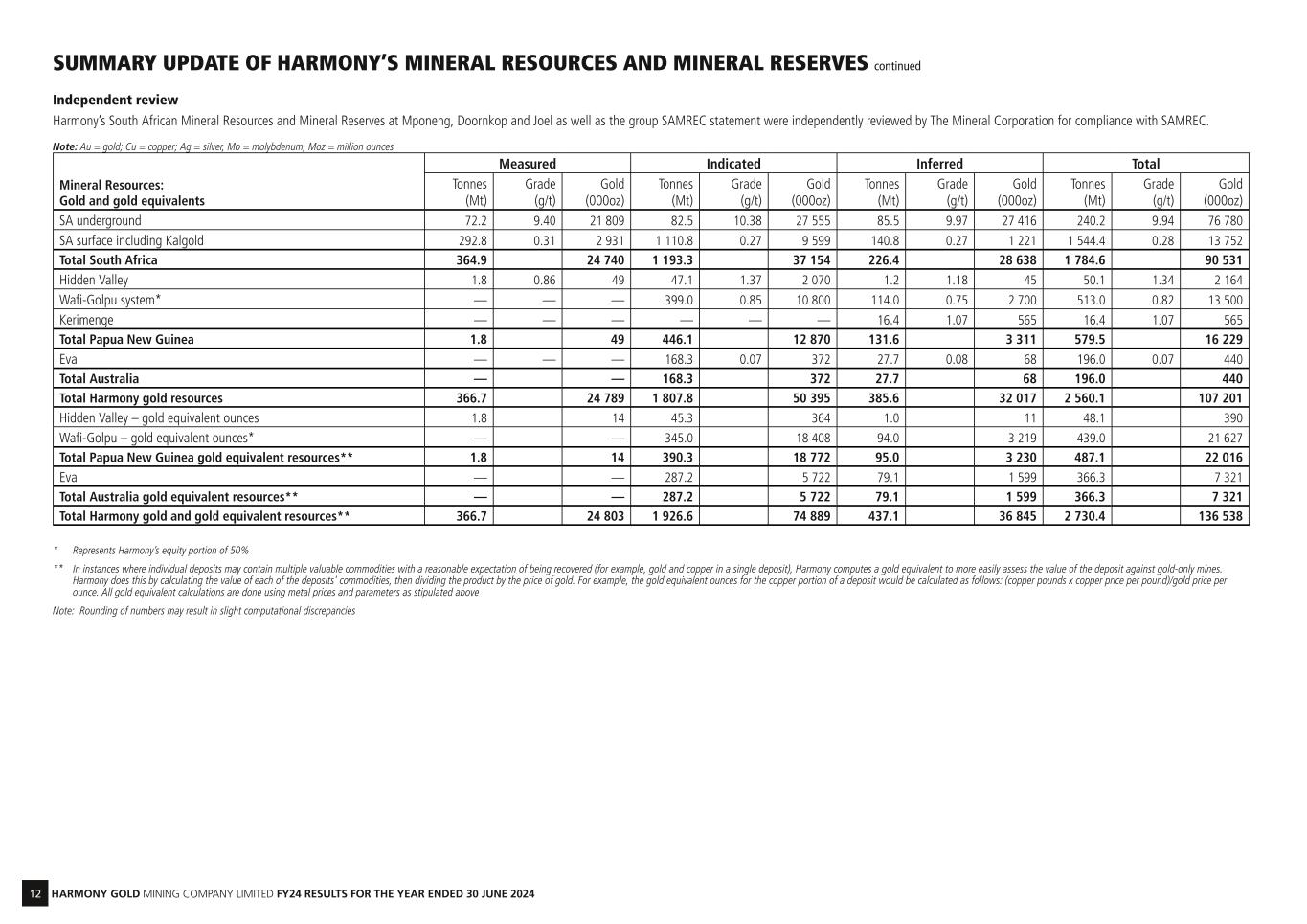 11 HARMONY GOLD MINING COMPANY LIMITED FY24 RESULTS FOR THE YEAR ENDED 30 JUNE 2024 Harmony’s statement of Mineral Resources and Mineral Reserves as at 30 June 2024 is produced in accordance with the South African Code for the Reporting of Exploration Results, Mineral Resources and Mineral Reserves (SAMREC), section 12.13 of the JSE Listings Requirements (as updated from time to time) and the requirements of the United States Securities and Exchange Commission (SEC) regulation S-K Subpart 1300. It should be noted that the Mineral Resources are reported inclusive of the Mineral Reserves. In our Form 20-F the Mineral Resources are reported exclusive of reserves. United States investors are urged to consider the disclosure in this regard in our Form 20-F which will be available on our website at www.harmony.co.za/invest/annual-reports on 31 October 2024. This report provides a summary of the update, while the detailed statement of the Mineral Resources and Mineral Reserves will be published in the Integrated Annual Report on 25 October 2024, which will be available at www.harmony.co.za/invest. Refer to the website (www.harmony.co.za) for the updated reserves and resources tables as at 30 June 2024. INTRODUCTION Harmony’s strategy is to produce safe, profitable ounces and increase margins. This includes delivering safely on our operational plans, reducing costs and improving productivity. Harmony’s growth journey entails acquiring quality assets. In FY17, Harmony invested in the life-of-mine extension at Hidden Valley and in FY18 acquired and integrated the higher-grade Moab Khotsong operations. In FY21, Harmony acquired the remainder of the AngloGold Ashanti South African assets – Mponeng and related assets. In FY22, Harmony invested in the life-of-mine extension of the Moab Khotsong operation. In FY23, Harmony acquired the low-risk Eva Copper Project and surrounding exploration tenements from Copper Mountain Mining Corporation. In FY24, Harmony approved the investment in the life-of-mine extension of the Mponeng operation. HARMONY – TOTAL The company’s attributable gold and gold equivalent Mineral Resources are declared as 136.5Moz as at 30 June 2024, a 1% decrease year-on-year from the 137.8Moz declared as at 30 June 2023. The total gold contained in the Mineral Resources at the South African operations represents 66% of the company total, with the Papua New Guinea operations representing 28% and Australian operations 6% of Harmony’s total gold and gold equivalent Mineral Resources as at 30 June 2024. Harmony’s attributable gold and gold equivalent Mineral Reserves amount to 40.3Moz, a 2% increase from the 39.3Moz declared at 30 June 2023. The gold reserve ounces in South Africa represent 56%, while the Papua New Guinea gold and gold equivalent ounces represent 44% of Harmony’s total Mineral Reserves as at 30 June 2024. The Australian gold and gold equivalent ounces will be declared once the feasibility study is concluded. South Africa South African underground operations The company’s Mineral Resources at the South African underground operations as at 30 June 2024 are 76.8Moz (240.2Mt at 9.94g/t), an increase of 0.5% year-on-year from the 76.4Moz (237.4Mt at 10.01g/t) declared as at 30 June 2023. This increase is mainly due to an increase in Mineral Resources at the Tshepong North, Mponeng and Doornkop operations as result of geological model changes. The company’s Mineral Reserves at the South African underground operations as at 30 June 2024 are 12.9Moz (59.6Mt at 6.72g/t), an increase of 23% year-on-year from the 10.4Moz (50.0Mt at 6.50g/t) declared as at 30 June 2023. The increase in ounces is mainly as a result of the Mponeng extension project. South African surface operations, including Kalgold The company’s Mineral Resources at the South African surface operations as at 30 June 2024 are 13.7Moz (1 544.4Mt at 0.28g/t), a decrease of 2% mainly due to normal depletion that was partially offset by the increase of Mineral Resources at the Kalgold operation. The company’s Mineral Reserves at the South African surface operations as at 30 June 2024 are 9.6Moz (1 143.2Mt at 0.26g/t) a decrease of 1% mainly due to normal depletion that was partially offset by the increase of Mineral Resources at the Kalgold operation as result of the change in the life-of-mine strategy. Papua New Guinea The company’s attributable gold and gold equivalent Mineral Resources at the Papua New Guinea operations as at 30 June 2024 are 38.2Moz, a decrease of 3% year-on-year from the 39.3Moz declared as at 30 June 2023. This decrease is mainly due to normal depletion and a decrease in gold equivalents due to commodity price changes. The company’s gold and gold equivalent Mineral Reserves at the Papua New Guinea operations as at 30 June 2024 are 17.7Moz, a decrease of 8% year-on-year from the 19.2Moz declared as at 30 June 2023. The decrease is mainly due to normal depletion, geological model changes and a decrease in gold equivalents due to commodity price changes. Australia The company’s gold and gold equivalent Mineral Resources at the Australian operations as at 30 June 2024 are 7.8Moz, a decrease of 4% year on year from the 8.1Moz declared as at 30 June 2023. The decrease is mainly due to geological model changes and a decrease in gold equivalents due to commodity price changes. The company’s gold and gold equivalent Mineral Reserves at the Australian operations will be declared once the feasibility study is concluded. ASSUMPTIONS In converting the Mineral Resources to Mineral Reserves, the following commodity prices and exchange rates were applied: • A gold price of US$1 772/oz • An exchange rate of R18.26/US$ • The above parameters resulted in a Rand/kg gold price of R1 040 000/kg for the South African assets • The Hidden Valley mine and the Wafi-Golpu project used commodity prices of US$1 772/oz Au, US$23.00/oz Ag and US$4.00/lb Cu at an exchange rate of AUD1.42 per 