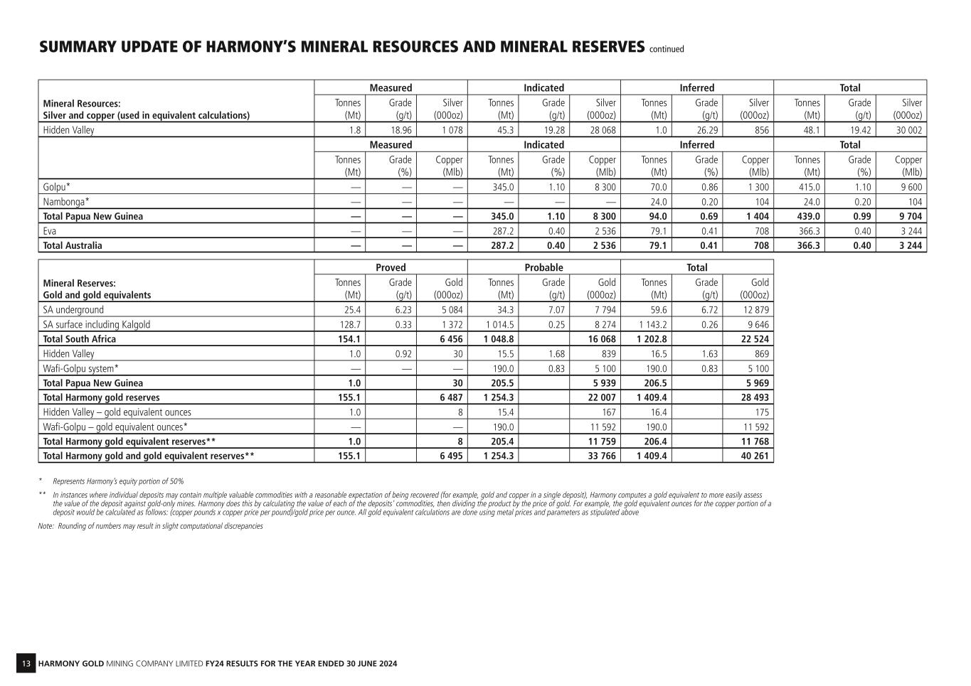 12 HARMONY GOLD MINING COMPANY LIMITED FY24 RESULTS FOR THE YEAR ENDED 30 JUNE 2024 SUMMARY UPDATE OF HARMONY’S MINERAL RESOURCES AND MINERAL RESERVES continued Independent review Harmony’s South African Mineral Resources and Mineral Reserves at Mponeng, Doornkop and Joel as well as the group SAMREC statement were independently reviewed by The Mineral Corporation for compliance with SAMREC. Note: Au = gold; Cu = copper; Ag = silver, Mo = molybdenum, Moz = million ounces Mineral Resources: Gold and gold equivalents Measured Indicated Inferred Total Tonnes (Mt) Grade (g/t) Gold (000oz) Tonnes (Mt) Grade (g/t) Gold (000oz) Tonnes (Mt) Grade (g/t) Gold (000oz) Tonnes (Mt) Grade (g/t) Gold (000oz) SA underground 72.2 9.40 21 809 82.5 10.38 27 555 85.5 9.97 27 416 240.2 9.94 76 780 SA surface including Kalgold 292.8 0.31 2 931 1 110.8 0.27 9 599 140.8 0.27 1 221 1 544.4 0.28 13 752 Total South Africa 364.9 24 740 1 193.3 37 154 226.4 28 638 1 784.6 90 531 Hidden Valley 1.8 0.86 49 47.1 1.37 2 070 1.2 1.18 45 50.1 1.34 2 164 Wafi-Golpu system* — — — 399.0 0.85 10 800 114.0 0.75 2 700 513.0 0.82 13 500 Kerimenge — — — — — — 16.4 1.07 565 16.4 1.07 565 Total Papua New Guinea 1.8 49 446.1 12 870 131.6 3 311 579.5 16 229 Eva — — — 168.3 0.07 372 27.7 0.08 68 196.0 0.07 440 Total Australia — — 168.3 372 27.7 68 196.0 440 Total Harmony gold resources 366.7 24 789 1 807.8 50 395 385.6 32 017 2 560.1 107 201 Hidden Valley – gold equivalent ounces 1.8 14 45.3 364 1.0 11 48.1 390 Wafi-Golpu – gold equivalent ounces* — — 345.0 18 408 94.0 3 219 439.0 21 627 Total Papua New Guinea gold equivalent resources** 1.8 14 390.3 18 772 95.0 3 230 487.1 22 016 Eva — — 287.2 5 722 79.1 1 599 366.3 7 321 Total Australia gold equivalent resources** — — 287.2 5 722 79.1 1 599 366.3 7 321 Total Harmony gold and gold equivalent resources** 366.7 24 803 1 926.6 74 889 437.1 36 845 2 730.4 136 538 * Represents Harmony’s equity portion of 50% ** In instances where individual deposits may contain multiple valuable commodities with a reasonable expectation of being recovered (for example, gold and copper in a single deposit), Harmony computes a gold equivalent to more easily assess the value of the deposit against gold-only mines. Harmony does this by calculating the value of each of the deposits' commodities, then dividing the product by the price of gold. For example, the gold equivalent ounces for the copper portion of a deposit would be calculated as follows: (copper pounds x copper price per pound)/gold price per ounce. All gold equivalent calculations are done using metal prices and parameters as stipulated above Note: Rounding of numbers may result in slight computational discrepancies