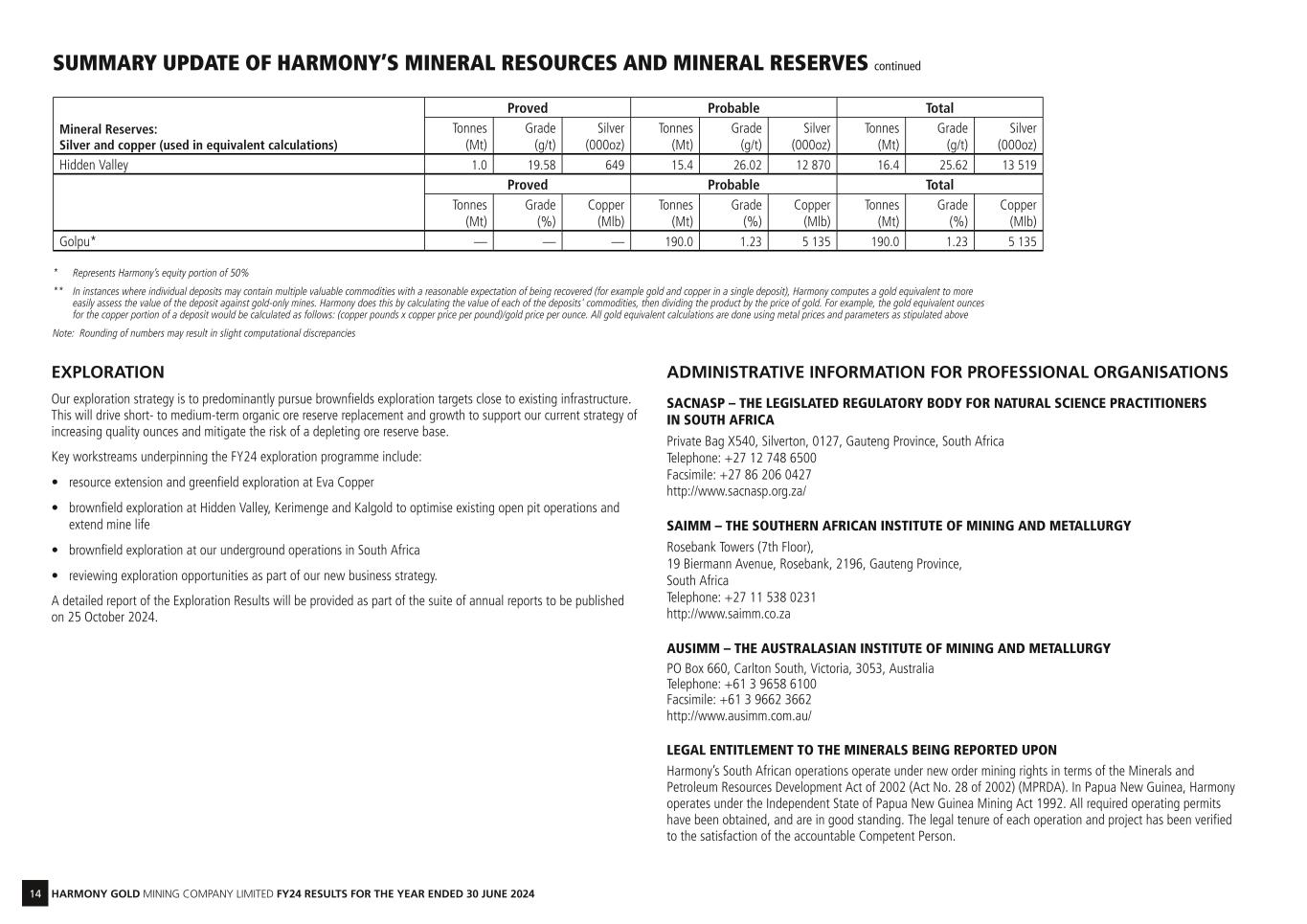14 HARMONY GOLD MINING COMPANY LIMITED FY24 RESULTS FOR THE YEAR ENDED 30 JUNE 2024 Mineral Reserves: Silver and copper (used in equivalent calculations) Proved Probable Total Tonnes (Mt) Grade (g/t) Silver (000oz) Tonnes (Mt) Grade (g/t) Silver (000oz) Tonnes (Mt) Grade (g/t) Silver (000oz) Hidden Valley 1.0 19.58 649 15.4 26.02 12 870 16.4 25.62 13 519 Proved Probable Total Tonnes (Mt) Grade (%) Copper (Mlb) Tonnes (Mt) Grade (%) Copper (Mlb) Tonnes (Mt) Grade (%) Copper (Mlb) Golpu* — — — 190.0 1.23 5 135 190.0 1.23 5 135 * Represents Harmony’s equity portion of 50% ** In instances where individual deposits may contain multiple valuable commodities with a reasonable expectation of being recovered (for example gold and copper in a single deposit), Harmony computes a gold equivalent to more easily assess the value of the deposit against gold-only mines. Harmony does this by calculating the value of each of the deposits' commodities, then dividing the product by the price of gold. For example, the gold equivalent ounces for the copper portion of a deposit would be calculated as follows: (copper pounds x copper price per pound)/gold price per ounce. All gold equivalent calculations are done using metal prices and parameters as stipulated above Note: Rounding of numbers may result in slight computational discrepancies EXPLORATION Our exploration strategy is to predominantly pursue brownfields exploration targets close to existing infrastructure. This will drive short- to medium-term organic ore reserve replacement and growth to support our current strategy of increasing quality ounces and mitigate the risk of a depleting ore reserve base. Key workstreams underpinning the FY24 exploration programme include: • resource extension and greenfield exploration at Eva Copper • brownfield exploration at Hidden Valley, Kerimenge and Kalgold to optimise existing open pit operations and extend mine life • brownfield exploration at our underground operations in South Africa • reviewing exploration opportunities as part of our new business strategy. A detailed report of the Exploration Results will be provided as part of the suite of annual reports to be published on 25 October 2024. ADMINISTRATIVE INFORMATION FOR PROFESSIONAL ORGANISATIONS SACNASP – THE LEGISLATED REGULATORY BODY FOR NATURAL SCIENCE PRACTITIONERS IN SOUTH AFRICA Private Bag X540, Silverton, 0127, Gauteng Province, South Africa Telephone: +27 12 748 6500 Facsimile: +27 86 206 0427 http://www.sacnasp.org.za/ SAIMM – THE SOUTHERN AFRICAN INSTITUTE OF MINING AND METALLURGY Rosebank Towers (7th Floor), 19 Biermann Avenue, Rosebank, 2196, Gauteng Province, South Africa Telephone: +27 11 538 0231 http://www.saimm.co.za AUSIMM – THE AUSTRALASIAN INSTITUTE OF MINING AND METALLURGY PO Box 660, Carlton South, Victoria, 3053, Australia Telephone: +61 3 9658 6100 Facsimile: +61 3 9662 3662 http://www.ausimm.com.au/ LEGAL ENTITLEMENT TO THE MINERALS BEING REPORTED UPON Harmony’s South African operations operate under new order mining rights in terms of the Minerals and Petroleum Resources Development Act of 2002 (Act No. 28 of 2002) (MPRDA). In Papua New Guinea, Harmony operates under the Independent State of Papua New Guinea Mining Act 1992. All required operating permits have been obtained, and are in good standing. The legal tenure of each operation and project has been verified to the satisfaction of the accountable Competent Person. SUMMARY UPDATE OF HARMONY’S MINERAL RESOURCES AND MINERAL RESERVES continued