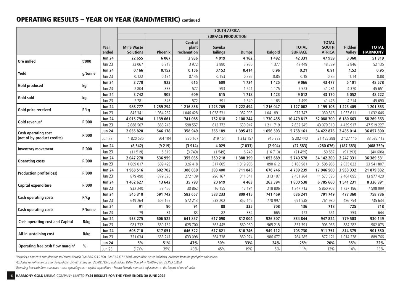 15 HARMONY GOLD MINING COMPANY LIMITED FY24 RESULTS FOR THE YEAR ENDED 30 JUNE 2024 Year ended SOUTH AFRICA UNDERGROUND PRODUCTION Moab Khotsong Mponeng Tshepong North Tshepong South Doornkop Joel Target 1 Kusasalethu Masimong Bambanani* TOTAL UNDER- GROUND Ore milled t'000 Jun 24 822 880 726 465 815 401 462 584 473 — 5 628 Jun 23 920 884 795 506 898 435 365 567 470 — 5 840 Yield g/tonne Jun 24 8.03 9.94 4.47 6.73 4.26 4.32 4.02 6.58 3.76 — 6.11 Jun 23 7.25 8.43 4.22 6.78 4.69 4.48 3.49 6.10 4.17 — 5.78 Gold produced kg Jun 24 6 599 8 751 3 248 3 129 3 470 1 733 1 859 3 842 1 780 — 34 411 Jun 23 6 668 7 449 3 354 3 431 4 213 1 947 1 275 3 460 1 961 — 33 758 Gold sold kg Jun 24 6 650 8 648 3 196 3 082 3 469 1 708 1 854 3 795 1 756 — 34 158 Jun 23 6 715 7 480 3 391 3 458 4 233 1 964 1 256 3 481 1 980 19 33 977 Gold price received R/kg Jun 24 1 219 199 1 223 096 1 213 187 1 211 447 1 210 252 1 216 923 1 219 817 1 222 101 1 216 723 — 1 218 130 Jun 23 1 047 845 1 048 824 1 041 078 1 043 180 1 035 665 1 040 581 1 041 564 1 040 274 1 036 670 962 579 1 043 266 Gold revenue¹ R'000 Jun 24 8 107 672 10 577 333 3 877 346 3 733 681 4 198 365 2 078 505 2 261 541 4 637 874 2 136 566 — 41 608 883 Jun 23 7 036 281 7 845 205 3 530 297 3 607 317 4 383 969 2 043 701 1 308 205 3 621 194 2 052 607 18 289 35 447 065 Cash operating cost (net of by-product credits) R'000 Jun 24 4 614 681 5 870 265 2 872 740 2 607 418 3 054 393 1 690 228 2 354 399 3 708 620 1 881 971 — 28 654 715 Jun 23 4 560 877 5 001 813 2 673 369 2 373 995 2 986 630 1 602 948 2 033 193 3 311 005 1 709 028 — 26 252 858 Inventory movement R'000 Jun 24 23 257 (75 230) (45 833) (43 046) (13 591) (27 671) (2 859) (38 272) (29 848) — (253 093) Jun 23 (46 125) (4 754) 27 824 20 855 22 374 13 388 (24 109) 32 340 14 625 15 728 72 146 Operating costs R'000 Jun 24 4 637 938 5 795 035 2 826 907 2 564 372 3 040 802 1 662 557 2 351 540 3 670 348 1 852 123 — 28 401 622 Jun 23 4 514 752 4 997 059 2 701 193 2 394 850 3 009 004 1 616 336 2 009 084 3 343 345 1 723 653 15 728 26 325 004 Production profit/(loss) R'000 Jun 24 3 469 734 4 782 298 1 050 439 1 169 309 1 157 563 415 948 (89 999) 967 526 284 443 — 13 207 261 Jun 23 2 521 529 2 848 146 829 104 1 212 467 1 374 965 427 365 (700 879) 277 849 328 954 2 561 9 122 061 Capital expenditure R'000 Jun 24 1 329 790 889 748 558 915 527 444 686 533 235 533 487 551 225 737 43 871 — 4 985 122 Jun 23 1 166 662 704 411 553 485 514 377 715 686 230 659 427 913 253 094 46 903 — 4 613 190 Cash operating costs R/kg Jun 24 699 300 670 811 884 464 833 307 880 229 975 319 1 266 487 965 284 1 057 287 — 832 720 Jun 23 683 995 671 474 797 069 691 925 708 908 823 291 1 594 661 956 938 871 508 — 777 678 Cash operating costs R/tonne Jun 24 5 614 6 671 3 957 5 607 3 748 4 215 5 096 6 350 3 979 — 5 091 Jun 23 4 957 5 658 3 363 4 692 3 326 3 685 5 570 5 840 3 636 — 4 495 Cash operating cost and Capital R/kg Jun 24 900 814 772 485 1 056 544 1 001 873 1 078 077 1 111 230 1 528 752 1 024 039 1 081 934 — 977 590 Jun 23 858 959 766 039 962 091 841 846 878 784 941 760 1 930 279 1 030 086 895 426 — 914 333 All-in sustaining cost R/kg Jun 24 798 866 785 108 1 078 897 1 002 141 1 031 845 1 145 064 1 558 946 1 058 639 1 121 951 — 967 622 Jun 23 782 441 784 093 975 498 841 983 831 553 950 713 1 903 111 1 068 851 925 703 827 789 903 121 Operating free cash flow margin² % Jun 24 27% 36% 11% 16% 11% 7% (26)% 15% 10% —% 19% Jun 23 19% 27% 9% 20% 16% 10% (88)% 2% 14% 100% 13% OPERATING RESULTS – YEAR ON YEAR (RAND/METRIC) *The Bambanani operation closed in June 2022. The transactions in the prior year relate to the inventory at 30 June 2022.