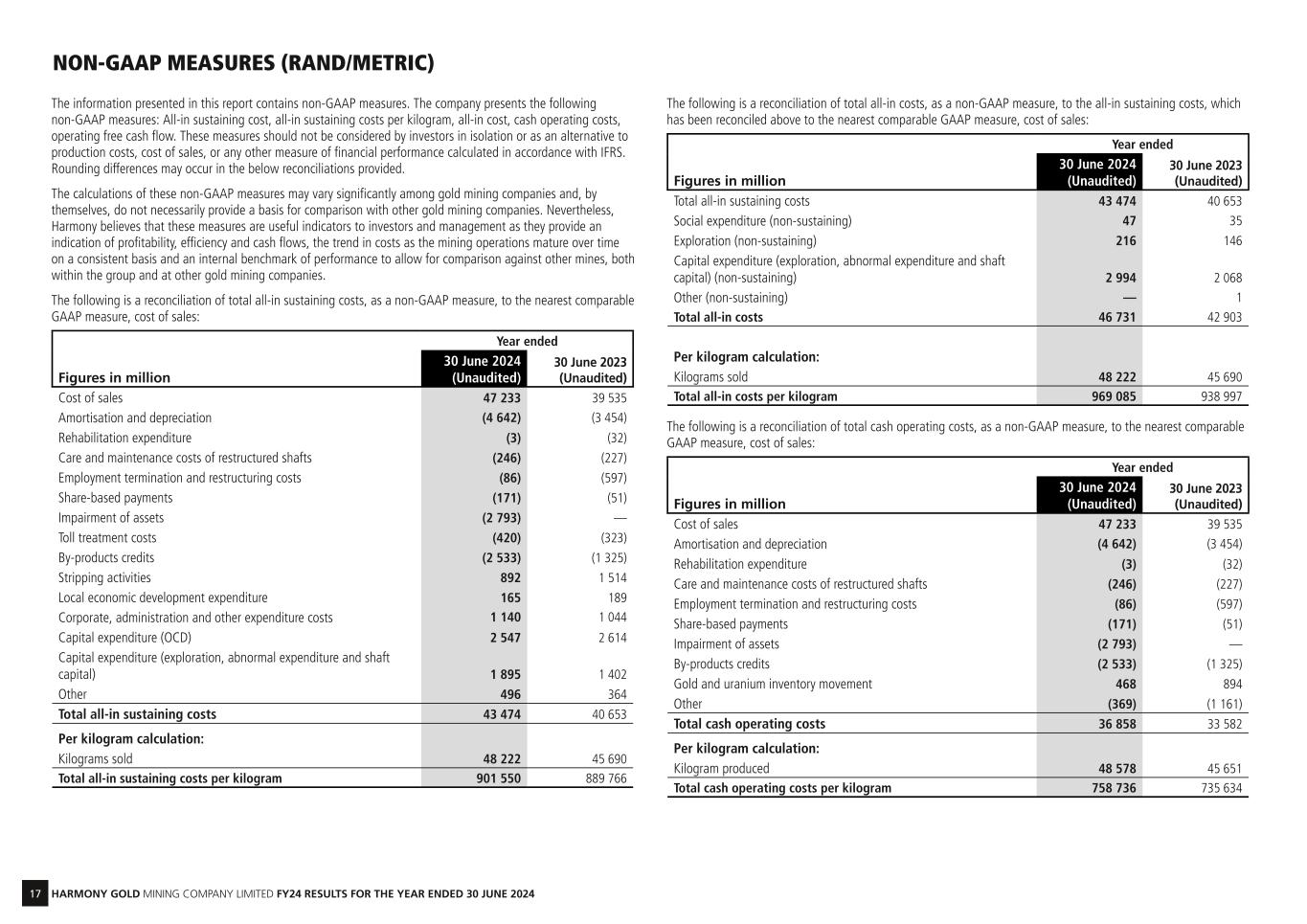 17 HARMONY GOLD MINING COMPANY LIMITED FY24 RESULTS FOR THE YEAR ENDED 30 JUNE 2024 The information presented in this report contains non-GAAP measures. The company presents the following non-GAAP measures: All-in sustaining cost, all-in sustaining costs per kilogram, all-in cost, cash operating costs, operating free cash flow. These measures should not be considered by investors in isolation or as an alternative to production costs, cost of sales, or any other measure of financial performance calculated in accordance with IFRS. Rounding differences may occur in the below reconciliations provided. The calculations of these non-GAAP measures may vary significantly among gold mining companies and, by themselves, do not necessarily provide a basis for comparison with other gold mining companies. Nevertheless, Harmony believes that these measures are useful indicators to investors and management as they provide an indication of profitability, efficiency and cash flows, the trend in costs as the mining operations mature over time on a consistent basis and an internal benchmark of performance to allow for comparison against other mines, both within the group and at other gold mining companies. The following is a reconciliation of total all-in sustaining costs, as a non-GAAP measure, to the nearest comparable GAAP measure, cost of sales: Year ended Figures in million 30 June 2024 (Unaudited) 30 June 2023 (Unaudited) Cost of sales 47 233 39 535 Amortisation and depreciation (4 642) (3 454) Rehabilitation expenditure (3) (32) Care and maintenance costs of restructured shafts (246) (227) Employment termination and restructuring costs (86) (597) Share-based payments (171) (51) Impairment of assets (2 793) — Toll treatment costs (420) (323) By-products credits (2 533) (1 325) Stripping activities 892 1 514 Local economic development expenditure 165 189 Corporate, administration and other expenditure costs 1 140 1 044 Capital expenditure (OCD) 2 547 2 614 Capital expenditure (exploration, abnormal expenditure and shaft capital) 1 895 1 402 Other 496 364 Total all-in sustaining costs 43 474 40 653 Per kilogram calculation: Kilograms sold 48 222 45 690 Total all-in sustaining costs per kilogram 901 550 889 766 The following is a reconciliation of total all-in costs, as a non-GAAP measure, to the all-in sustaining costs, which has been reconciled above to the nearest comparable GAAP measure, cost of sales: Year ended Figures in million 30 June 2024 (Unaudited) 30 June 2023 (Unaudited) Total all-in sustaining costs 43 474 40 653 Social expenditure (non-sustaining) 47 35 Exploration (non-sustaining) 216 146 Capital expenditure (exploration, abnormal expenditure and shaft capital) (non-sustaining) 2 994 2 068 Other (non-sustaining) — 1 Total all-in costs 46 731 42 903 Per kilogram calculation: Kilograms sold 48 222 45 690 Total all-in costs per kilogram 969 085 938 997 The following is a reconciliation of total cash operating costs, as a non-GAAP measure, to the nearest comparable GAAP measure, cost of sales: Year ended Figures in million 30 June 2024 (Unaudited) 30 June 2023 (Unaudited) Cost of sales 47 233 39 535 Amortisation and depreciation (4 642) (3 454) Rehabilitation expenditure (3) (32) Care and maintenance costs of restructured shafts (246) (227) Employment termination and restructuring costs (86) (597) Share-based payments (171) (51) Impairment of assets (2 793) — By-products credits (2 533) (1 325) Gold and uranium inventory movement 468 894 Other (369) (1 161) Total cash operating costs 36 858 33 582 Per kilogram calculation: Kilogram produced 48 578 45 651 Total cash operating costs per kilogram 758 736 735 634 NON-GAAP MEASURES (RAND/METRIC)