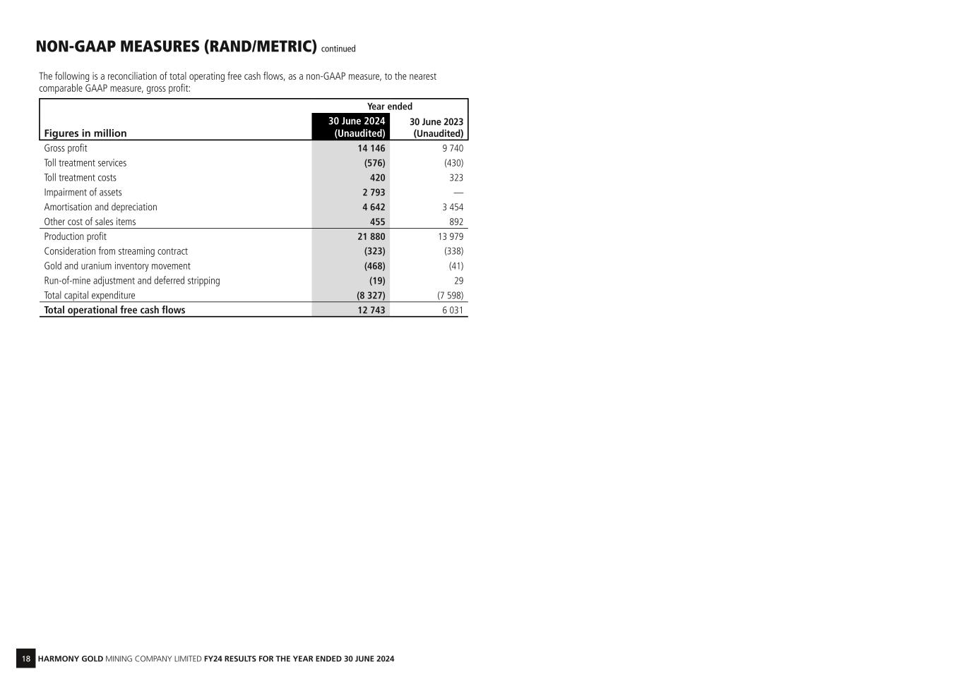 18 HARMONY GOLD MINING COMPANY LIMITED FY24 RESULTS FOR THE YEAR ENDED 30 JUNE 2024 The following is a reconciliation of total operating free cash flows, as a non-GAAP measure, to the nearest comparable GAAP measure, gross profit: Year ended Figures in million 30 June 2024 (Unaudited) 30 June 2023 (Unaudited) Gross profit 14 146 9 740 Toll treatment services (576) (430) Toll treatment costs 420 323 Impairment of assets 2 793 — Amortisation and depreciation 4 642 3 454 Other cost of sales items 455 892 Production profit 21 880 13 979 Consideration from streaming contract (323) (338) Gold and uranium inventory movement (468) (41) Run-of-mine adjustment and deferred stripping (19) 29 Total capital expenditure (8 327) (7 598) Total operational free cash flows 12 743 6 031 NON-GAAP MEASURES (RAND/METRIC) continued
