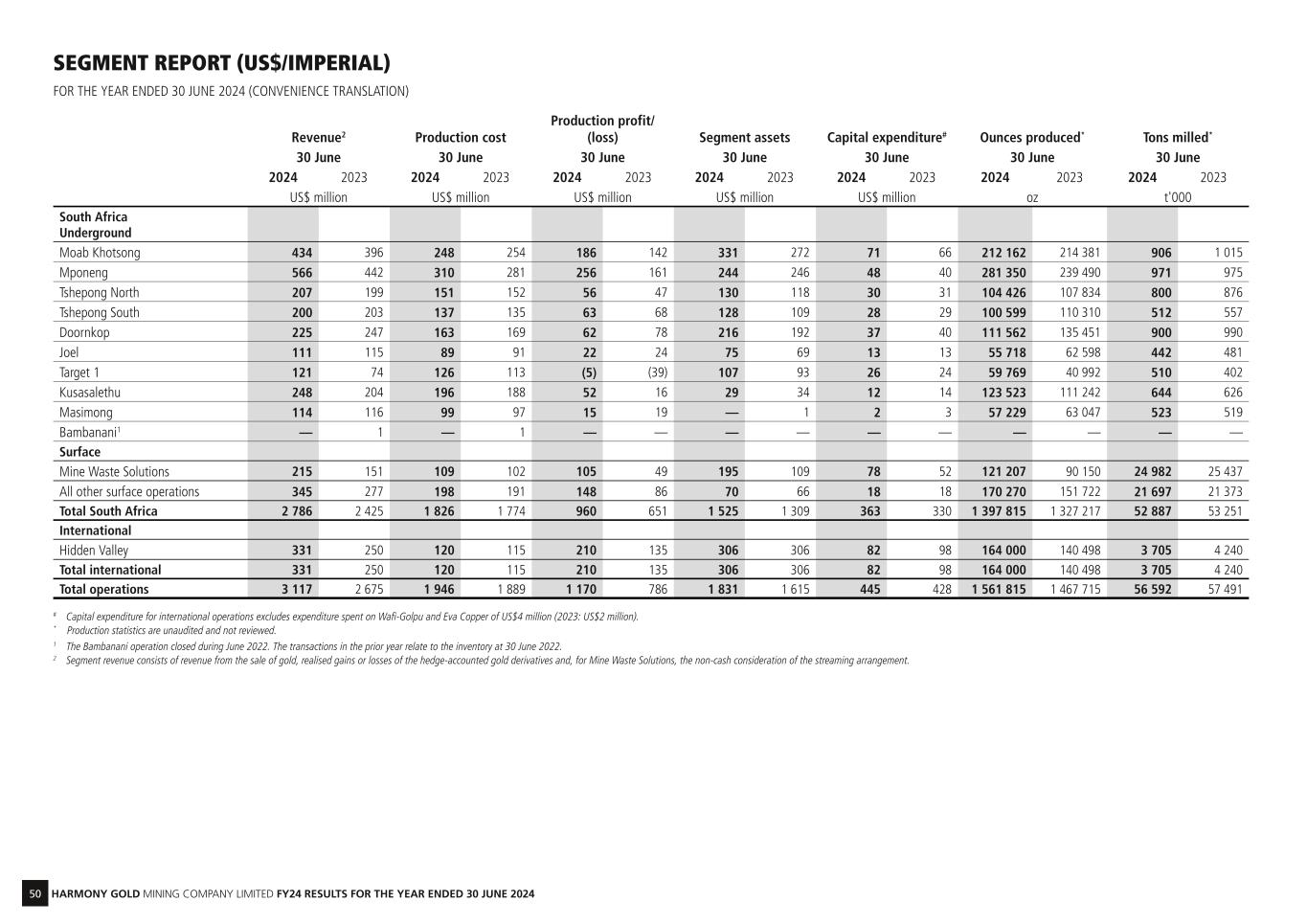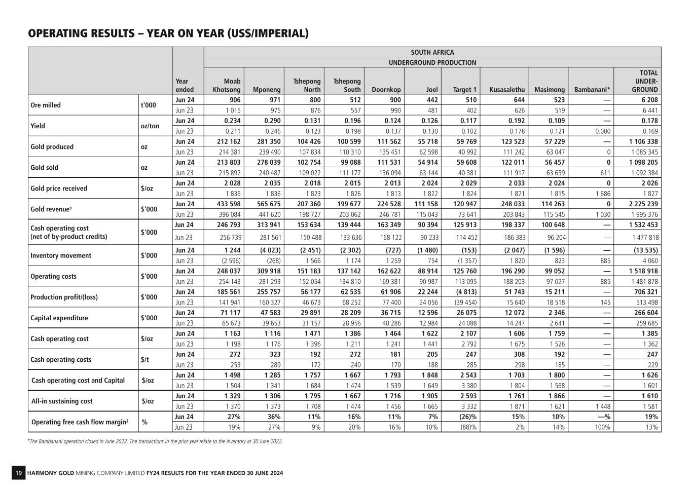 19 HARMONY GOLD MINING COMPANY LIMITED FY24 RESULTS FOR THE YEAR ENDED 30 JUNE 2024 Year ended SOUTH AFRICA UNDERGROUND PRODUCTION Moab Khotsong Mponeng Tshepong North Tshepong South Doornkop Joel Target 1 Kusasalethu Masimong Bambanani* TOTAL UNDER- GROUND Ore milled t'000 Jun 24 906 971 800 512 900 442 510 644 523 — 6 208 Jun 23 1 015 975 876 557 990 481 402 626 519 — 6 441 Yield oz/ton Jun 24 0.234 0.290 0.131 0.196 0.124 0.126 0.117 0.192 0.109 — 0.178 Jun 23 0.211 0.246 0.123 0.198 0.137 0.130 0.102 0.178 0.121 0.000 0.169 Gold produced oz Jun 24 212 162 281 350 104 426 100 599 111 562 55 718 59 769 123 523 57 229 — 1 106 338 Jun 23 214 381 239 490 107 834 110 310 135 451 62 598 40 992 111 242 63 047 0 1 085 345 Gold sold oz Jun 24 213 803 278 039 102 754 99 088 111 531 54 914 59 608 122 011 56 457 0 1 098 205 Jun 23 215 892 240 487 109 022 111 177 136 094 63 144 40 381 111 917 63 659 611 1 092 384 Gold price received $/oz Jun 24 2 028 2 035 2 018 2 015 2 013 2 024 2 029 2 033 2 024 0 2 026 Jun 23 1 835 1 836 1 823 1 826 1 813 1 822 1 824 1 821 1 815 1 686 1 827 Gold revenue¹ $'000 Jun 24 433 598 565 675 207 360 199 677 224 528 111 158 120 947 248 033 114 263 0 2 225 239 Jun 23 396 084 441 620 198 727 203 062 246 781 115 043 73 641 203 843 115 545 1 030 1 995 376 Cash operating cost (net of by-product credits) $'000 Jun 24 246 793 313 941 153 634 139 444 163 349 90 394 125 913 198 337 100 648 — 1 532 453 Jun 23 256 739 281 561 150 488 133 636 168 122 90 233 114 452 186 383 96 204 — 1 477 818 Inventory movement $'000 Jun 24 1 244 (4 023) (2 451) (2 302) (727) (1 480) (153) (2 047) (1 596) — (13 535) Jun 23 (2 596) (268) 1 566 1 174 1 259 754 (1 357) 1 820 823 885 4 060 Operating costs $'000 Jun 24 248 037 309 918 151 183 137 142 162 622 88 914 125 760 196 290 99 052 — 1 518 918 Jun 23 254 143 281 293 152 054 134 810 169 381 90 987 113 095 188 203 97 027 885 1 481 878 Production profit/(loss) $'000 Jun 24 185 561 255 757 56 177 62 535 61 906 22 244 (4 813) 51 743 15 211 — 706 321 Jun 23 141 941 160 327 46 673 68 252 77 400 24 056 (39 454) 15 640 18 518 145 513 498 Capital expenditure $'000 Jun 24 71 117 47 583 29 891 28 209 36 715 12 596 26 075 12 072 2 346 — 266 604 Jun 23 65 673 39 653 31 157 28 956 40 286 12 984 24 088 14 247 2 641 — 259 685 Cash operating cost $/oz Jun 24 1 163 1 116 1 471 1 386 1 464 1 622 2 107 1 606 1 759 — 1 385 Jun 23 1 198 1 176 1 396 1 211 1 241 1 441 2 792 1 675 1 526 — 1 362 Cash operating costs $/t Jun 24 272 323 192 272 181 205 247 308 192 — 247 Jun 23 253 289 172 240 170 188 285 298 185 — 229 Cash operating cost and Capital $/oz Jun 24 1 498 1 285 1 757 1 667 1 793 1 848 2 543 1 703 1 800 — 1 626 Jun 23 1 504 1 341 1 684 1 474 1 539 1 649 3 380 1 804 1 568 — 1 601 All-in sustaining cost $/oz Jun 24 1 329 1 306 1 795 1 667 1 716 1 905 2 593 1 761 1 866 — 1 610 Jun 23 1 370 1 373 1 708 1 474 1 456 1 665 3 332 1 871 1 621 1 448 1 581 Operating free cash flow margin² % Jun 24 27% 36% 11% 16% 11% 7% (26)% 15% 10% —% 19% Jun 23 19% 27% 9% 20% 16% 10% (88)% 2% 14% 100% 13% OPERATING RESULTS – YEAR ON YEAR (US$/IMPERIAL) *The Bambanani operation closed in June 2022. The transactions in the prior year relate to the inventory at 30 June 2022.