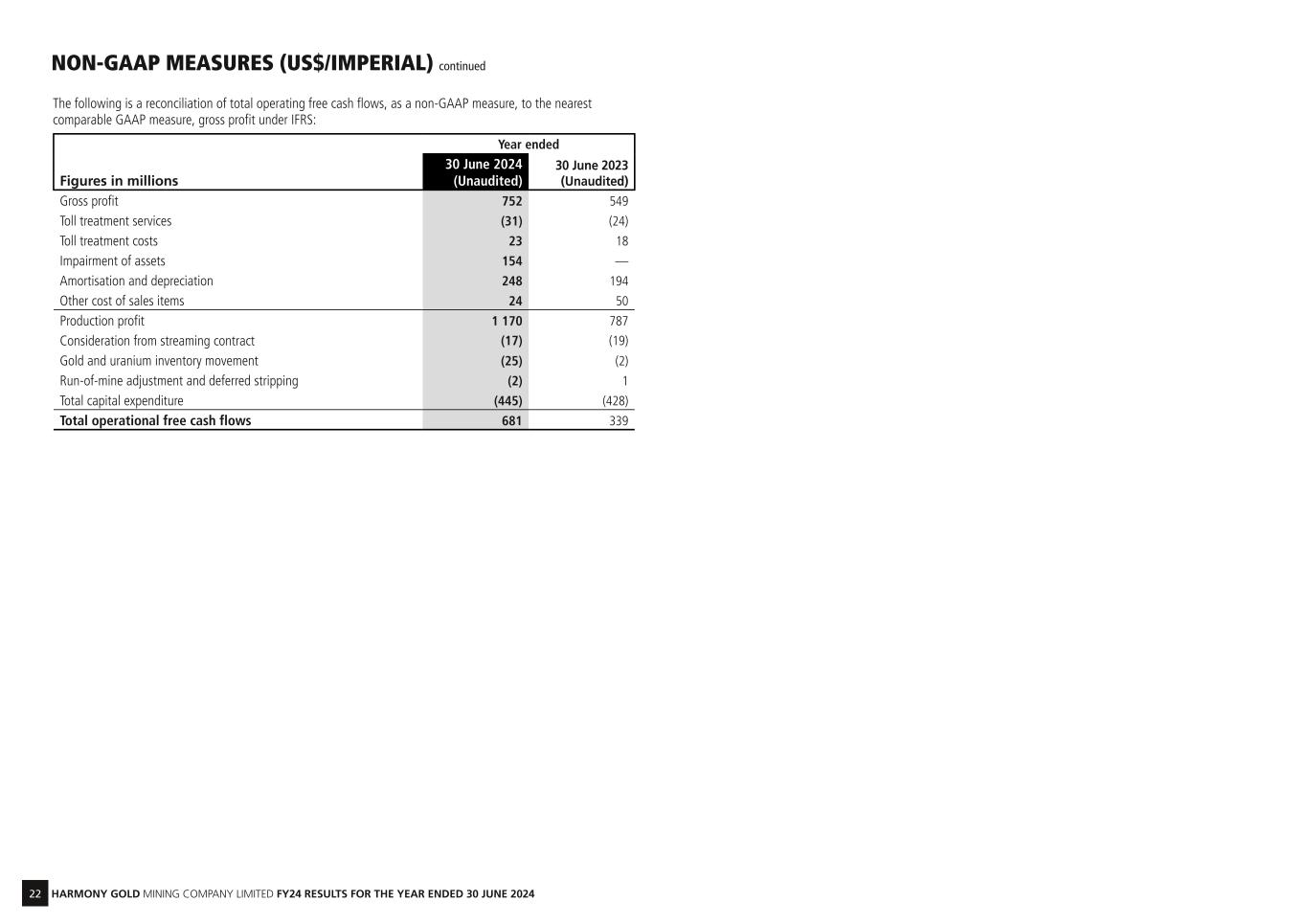 22 HARMONY GOLD MINING COMPANY LIMITED FY24 RESULTS FOR THE YEAR ENDED 30 JUNE 2024 The following is a reconciliation of total operating free cash flows, as a non-GAAP measure, to the nearest comparable GAAP measure, gross profit under IFRS: Year ended Figures in millions 30 June 2024 (Unaudited) 30 June 2023 (Unaudited) Gross profit 752 549 Toll treatment services (31) (24) Toll treatment costs 23 18 Impairment of assets 154 — Amortisation and depreciation 248 194 Other cost of sales items 24 50 Production profit 1 170 787 Consideration from streaming contract (17) (19) Gold and uranium inventory movement (25) (2) Run-of-mine adjustment and deferred stripping (2) 1 Total capital expenditure (445) (428) Total operational free cash flows 681 339 NON-GAAP MEASURES (US$/IMPERIAL) continued