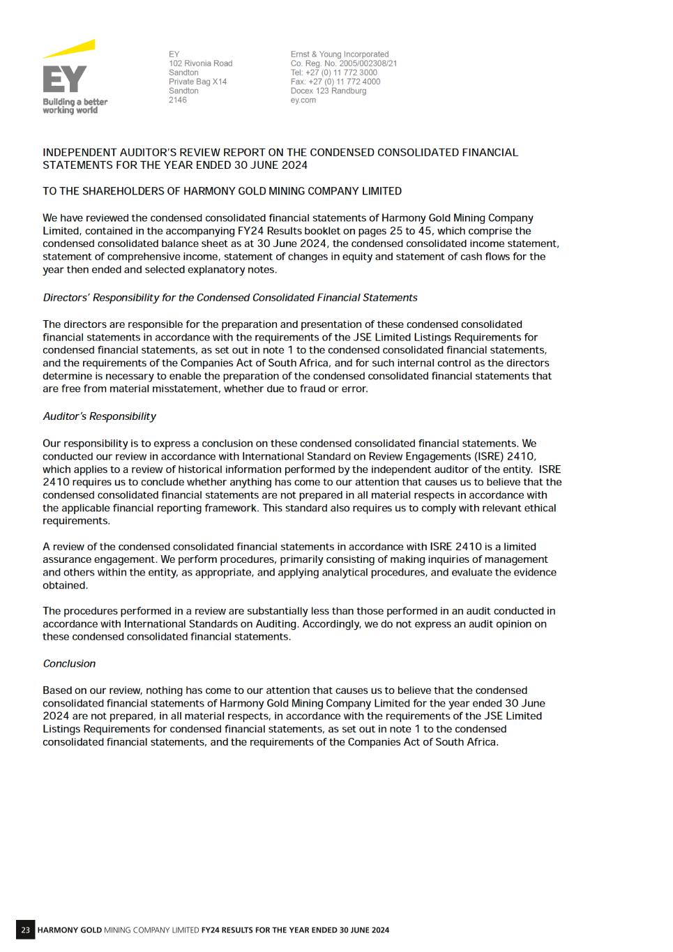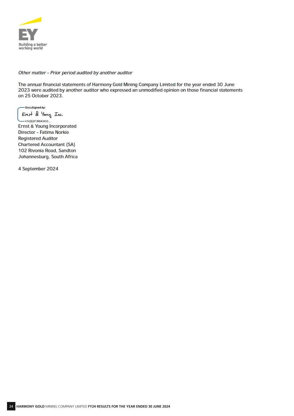 23 HARMONY GOLD MINING COMPANY LIMITED FY24 RESULTS FOR THE YEAR ENDED 30 JUNE 2024