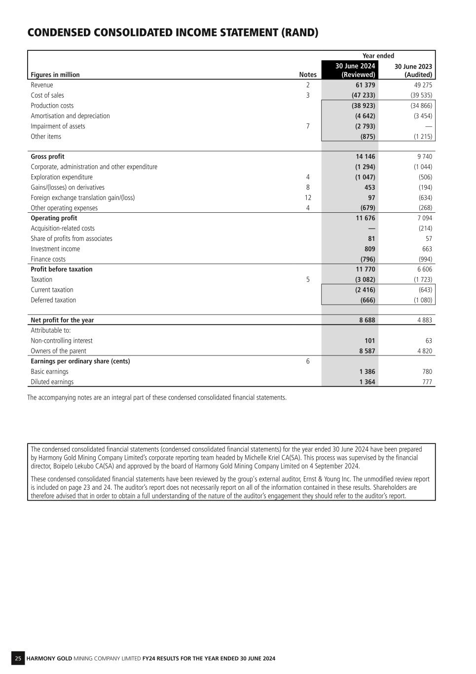 25 HARMONY GOLD MINING COMPANY LIMITED FY24 RESULTS FOR THE YEAR ENDED 30 JUNE 2024 Year ended Figures in million Notes 30 June 2024 (Reviewed) 30 June 2023 (Audited) Revenue 2 61 379 49 275 Cost of sales 3 (47 233) (39 535) Production costs (38 923) (34 866) Amortisation and depreciation (4 642) (3 454) Impairment of assets 7 (2 793) — Other items (875) (1 215) Gross profit 14 146 9 740 Corporate, administration and other expenditure (1 294) (1 044) Exploration expenditure 4 (1 047) (506) Gains/(losses) on derivatives 8 453 (194) Foreign exchange translation gain/(loss) 12 97 (634) Other operating expenses 4 (679) (268) Operating profit 11 676 7 094 Acquisition-related costs — (214) Share of profits from associates 81 57 Investment income 809 663 Finance costs (796) (994) Profit before taxation 11 770 6 606 Taxation 5 (3 082) (1 723) Current taxation (2 416) (643) Deferred taxation (666) (1 080) Net profit for the year 8 688 4 883 Attributable to: Non-controlling interest 101 63 Owners of the parent 8 587 4 820 Earnings per ordinary share (cents) 6 Basic earnings 1 386 780 Diluted earnings 1 364 777 The accompanying notes are an integral part of these condensed consolidated financial statements. The condensed consolidated financial statements (condensed consolidated financial statements) for the year ended 30 June 2024 have been prepared by Harmony Gold Mining Company Limited’s corporate reporting team headed by Michelle Kriel CA(SA). This process was supervised by the financial director, Boipelo Lekubo CA(SA) and approved by the board of Harmony Gold Mining Company Limited on 4 September 2024. These condensed consolidated financial statements have been reviewed by the group's external auditor, Ernst & Young Inc. The unmodified review report is included on page 23 and 24. The auditor’s report does not necessarily report on all of the information contained in these results. Shareholders are therefore advised that in order to obtain a full understanding of the nature of the auditor’s engagement they should refer to the auditor’s report. CONDENSED CONSOLIDATED INCOME STATEMENT (RAND)