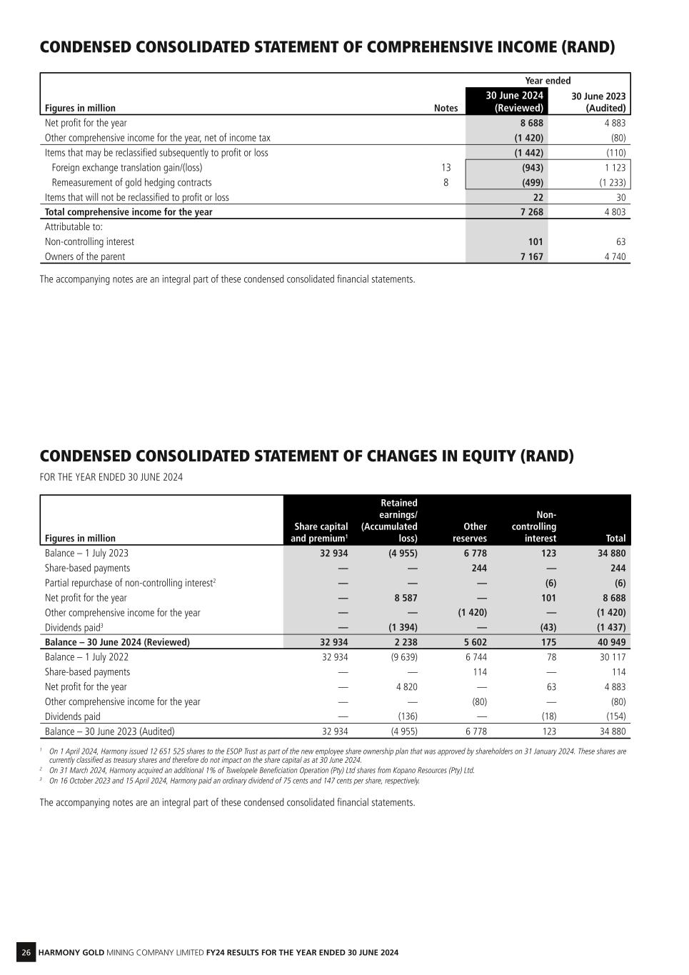 47 HARMONY GOLD MINING COMPANY LIMITED FY24 RESULTS FOR THE YEAR ENDED 30 JUNE 2024 Year ended Figures in million 30 June 2024 30 June 2023 Net profit for the year 459 275 Other comprehensive income for the year, net of income tax (76) (5) Items that may be reclassified subsequently to profit or loss (77) (6) Foreign exchange translation gain/(loss) (50) 63 Remeasurement of gold hedging contracts (27) (69) Items that will not be reclassified to profit or loss 1 1 Total comprehensive income for the year 383 270 Attributable to: Non-controlling interest 5 3 Owners of the parent 378 267 The convenience translation condensed consolidated statement of comprehensive income utilises the currency conversion average rate for the year ended 30 June 2024: US$1 = R18.70 (30 June 2023: US$1 = R17.76). Figures in million Share capital and premium Retained earnings/ (Accumulated loss) Other reserves Non- controlling interest Total Balance – 1 July 2023 1 811 (272) 373 6 1 918 Share-based payments — — 13 — 13 Net profit for the year — 472 — 6 478 Other comprehensive income for the year — — (78) — (78) Dividends paid — (77) — (2) (79) Balance – 30 June 2024 1 811 123 308 10 2 252 Balance – 1 July 2022 1 749 (512) 358 5 1 600 Share-based payments — — 6 — 6 Net profit for the year — 256 — 3 259 Other comprehensive income for the year — — (4) — (4) Dividends paid — (7) — (1) (8) Balance – 30 June 2023 1 749 (263) 360 7 1 853 The convenience translation condensed consolidated statement of changes in equity utilises the currency conversion closing rate for 30 June 2024: US$1 = R18.19 (30 June 2023: US$1 = R18.83). CONDENSED CONSOLIDATED STATEMENT OF COMPREHENSIVE INCOME (US$) (CONVENIENCE TRANSLATION) CONDENSED CONSOLIDATED STATEMENT OF CHANGES IN EQUITY (US$) FOR THE YEAR ENDED 30 JUNE 2024 (CONVENIENCE TRANSLATION)