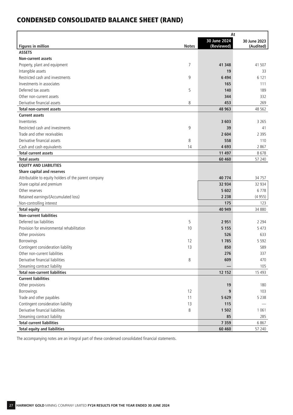 27 HARMONY GOLD MINING COMPANY LIMITED FY24 RESULTS FOR THE YEAR ENDED 30 JUNE 2024 At Figures in million Notes 30 June 2024 (Reviewed) 30 June 2023 (Audited) ASSETS Non-current assets Property, plant and equipment 7 41 348 41 507 Intangible assets 19 33 Restricted cash and investments 9 6 494 6 121 Investments in associates 165 111 Deferred tax assets 5 140 189 Other non-current assets 344 332 Derivative financial assets 8 453 269 Total non-current assets 48 963 48 562 Current assets Inventories 3 603 3 265 Restricted cash and investments 9 39 41 Trade and other receivables 2 604 2 395 Derivative financial assets 8 558 110 Cash and cash equivalents 14 4 693 2 867 Total current assets 11 497 8 678 Total assets 60 460 57 240 EQUITY AND LIABILITIES Share capital and reserves Attributable to equity holders of the parent company 40 774 34 757 Share capital and premium 32 934 32 934 Other reserves 5 602 6 778 Retained earnings/(Accumulated loss) 2 238 (4 955) Non-controlling interest 175 123 Total equity 40 949 34 880 Non-current liabilities Deferred tax liabilities 5 2 951 2 294 Provision for environmental rehabilitation 10 5 155 5 473 Other provisions 526 633 Borrowings 12 1 785 5 592 Contingent consideration liability 13 850 589 Other non-current liabilities 276 337 Derivative financial liabilities 8 609 470 Streaming contract liability — 105 Total non-current liabilities 12 152 15 493 Current liabilities Other provisions 19 180 Borrowings 12 9 103 Trade and other payables 11 5 629 5 238 Contingent consideration liability 13 115 — Derivative financial liabilities 8 1 502 1 061 Streaming contract liability 85 285 Total current liabilities 7 359 6 867 Total equity and liabilities 60 460 57 240 The accompanying notes are an integral part of these condensed consolidated financial statements. CONDENSED CONSOLIDATED BALANCE SHEET (RAND)