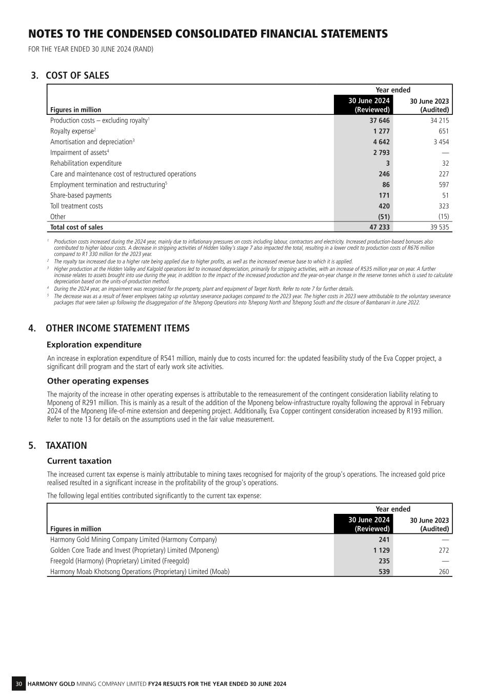 30 HARMONY GOLD MINING COMPANY LIMITED FY24 RESULTS FOR THE YEAR ENDED 30 JUNE 2024 NOTES TO THE CONDENSED CONSOLIDATED FINANCIAL STATEMENTS FOR THE YEAR ENDED 30 JUNE 2024 (RAND) 4. OTHER INCOME STATEMENT ITEMS Exploration expenditure An increase in exploration expenditure of R541 million, mainly due to costs incurred for: the updated feasibility study of the Eva Copper project, a significant drill program and the start of early work site activities. Other operating expenses The majority of the increase in other operating expenses is attributable to the remeasurement of the contingent consideration liability relating to Mponeng of R291 million. This is mainly as a result of the addition of the Mponeng below-infrastructure royalty following the approval in February 2024 of the Mponeng life-of-mine extension and deepening project. Additionally, Eva Copper contingent consideration increased by R193 million. Refer to note 13 for details on the assumptions used in the fair value measurement. 3. COST OF SALES Year ended Figures in million 30 June 2024 (Reviewed) 30 June 2023 (Audited) Production costs – excluding royalty1 37 646 34 215 Royalty expense2 1 277 651 Amortisation and depreciation3 4 642 3 454 Impairment of assets4 2 793 — Rehabilitation expenditure 3 32 Care and maintenance cost of restructured operations 246 227 Employment termination and restructuring5 86 597 Share-based payments 171 51 Toll treatment costs 420 323 Other (51) (15) Total cost of sales 47 233 39 535 1 Production costs increased during the 2024 year, mainly due to inflationary pressures on costs including labour, contractors and electricity. Increased production-based bonuses also contributed to higher labour costs. A decrease in stripping activities of Hidden Valley's stage 7 also impacted the total, resulting in a lower credit to production costs of R676 million compared to R1 330 million for the 2023 year. 2 The royalty tax increased due to a higher rate being applied due to higher profits, as well as the increased revenue base to which it is applied. 3 Higher production at the Hidden Valley and Kalgold operations led to increased depreciation, primarily for stripping activities, with an increase of R535 million year on year. A further increase relates to assets brought into use during the year, in addition to the impact of the increased production and the year-on-year change in the reserve tonnes which is used to calculate depreciation based on the units-of-production method. 4 During the 2024 year, an impairment was recognised for the property, plant and equipment of Target North. Refer to note 7 for further details. 5 The decrease was as a result of fewer employees taking up voluntary severance packages compared to the 2023 year. The higher costs in 2023 were attributable to the voluntary severance packages that were taken up following the disaggregation of the Tshepong Operations into Tshepong North and Tshepong South and the closure of Bambanani in June 2022. 5. TAXATION Current taxation The increased current tax expense is mainly attributable to mining taxes recognised for majority of the group's operations. The increased gold price realised resulted in a significant increase in the profitability of the group's operations. The following legal entities contributed significantly to the current tax expense: Year ended Figures in million 30 June 2024 (Reviewed) 30 June 2023 (Audited) Harmony Gold Mining Company Limited (Harmony Company) 241 — Golden Core Trade and Invest (Proprietary) Limited (Mponeng) 1 129 272 Freegold (Harmony) (Proprietary) Limited (Freegold) 235 — Harmony Moab Khotsong Operations (Proprietary) Limited (Moab) 539 260