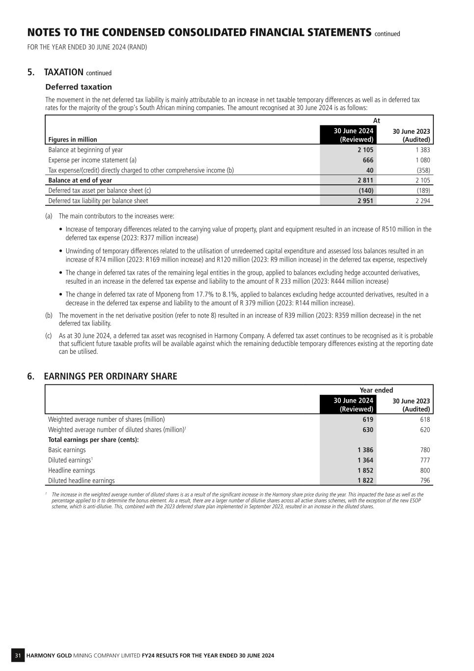 31 HARMONY GOLD MINING COMPANY LIMITED FY24 RESULTS FOR THE YEAR ENDED 30 JUNE 2024 6. EARNINGS PER ORDINARY SHARE Year ended 30 June 2024 (Reviewed) 30 June 2023 (Audited) Weighted average number of shares (million) 619 618 Weighted average number of diluted shares (million)1 630 620 Total earnings per share (cents): Basic earnings 1 386 780 Diluted earnings1 1 364 777 Headline earnings 1 852 800 Diluted headline earnings 1 822 796 1 The increase in the weighted average number of diluted shares is as a result of the significant increase in the Harmony share price during the year. This impacted the base as well as the percentage applied to it to determine the bonus element. As a result, there are a larger number of dilutive shares across all active shares schemes, with the exception of the new ESOP scheme, which is anti-dilutive. This, combined with the 2023 deferred share plan implemented in September 2023, resulted in an increase in the diluted shares. NOTES TO THE CONDENSED CONSOLIDATED FINANCIAL STATEMENTS continued FOR THE YEAR ENDED 30 JUNE 2024 (RAND) 5. TAXATION continued Deferred taxation The movement in the net deferred tax liability is mainly attributable to an increase in net taxable temporary differences as well as in deferred tax rates for the majority of the group's South African mining companies. The amount recognised at 30 June 2024 is as follows: At Figures in million 30 June 2024 (Reviewed) 30 June 2023 (Audited) Balance at beginning of year 2 105 1 383 Expense per income statement (a) 666 1 080 Tax expense/(credit) directly charged to other comprehensive income (b) 40 (358) Balance at end of year 2 811 2 105 Deferred tax asset per balance sheet (c) (140) (189) Deferred tax liability per balance sheet 2 951 2 294 (a) The main contributors to the increases were: • Increase of temporary differences related to the carrying value of property, plant and equipment resulted in an increase of R510 million in the deferred tax expense (2023: R377 million increase) • Unwinding of temporary differences related to the utilisation of unredeemed capital expenditure and assessed loss balances resulted in an increase of R74 million (2023: R169 million increase) and R120 million (2023: R9 million increase) in the deferred tax expense, respectively • The change in deferred tax rates of the remaining legal entities in the group, applied to balances excluding hedge accounted derivatives, resulted in an increase in the deferred tax expense and liability to the amount of R 233 million (2023: R444 million increase) • The change in deferred tax rate of Mponeng from 17.7% to 8.1%, applied to balances excluding hedge accounted derivatives, resulted in a decrease in the deferred tax expense and liability to the amount of R 379 million (2023: R144 million increase). (b) The movement in the net derivative position (refer to note 8) resulted in an increase of R39 million (2023: R359 million decrease) in the net deferred tax liability. (c) As at 30 June 2024, a deferred tax asset was recognised in Harmony Company. A deferred tax asset continues to be recognised as it is probable that sufficient future taxable profits will be available against which the remaining deductible temporary differences existing at the reporting date can be utilised.