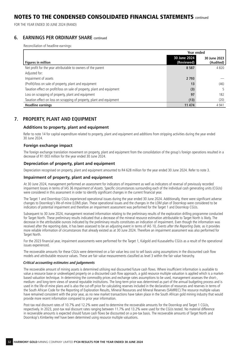 32 HARMONY GOLD MINING COMPANY LIMITED FY24 RESULTS FOR THE YEAR ENDED 30 JUNE 2024 NOTES TO THE CONDENSED CONSOLIDATED FINANCIAL STATEMENTS continued FOR THE YEAR ENDED 30 JUNE 2024 (RAND) 6. EARNINGS PER ORDINARY SHARE continued Reconciliation of headline earnings: Year ended Figures in million 30 June 2024 (Reviewed) 30 June 2023 (Audited) Net profit for the year attributable to owners of the parent 8 587 4 820 Adjusted for: Impairment of assets 2 793 — (Profit)/loss on sale of property, plant and equipment 13 (46) Taxation effect on profit/loss on sale of property, plant and equipment (3) 5 Loss on scrapping of property, plant and equipment 97 182 Taxation effect on loss on scrapping of property, plant and equipment (13) (20) Headline earnings 11 474 4 941 7. PROPERTY, PLANT AND EQUIPMENT Additions to property, plant and equipment Refer to note 14 for capital expenditure related to property, plant and equipment and additions from stripping activities during the year ended 30 June 2024. Foreign exchange impact The foreign exchange translation movement on property, plant and equipment from the consolidation of the group's foreign operations resulted in a decrease of R1 003 million for the year ended 30 June 2024. Depreciation of property, plant and equipment Depreciation recognised on property, plant and equipment amounted to R4 628 million for the year ended 30 June 2024. Refer to note 3. Impairment of property, plant and equipment At 30 June 2024, management performed an assessment for indicators of impairment as well as indicators of reversal of previously recorded impairment losses in terms of IAS 36 Impairment of Assets. Specific circumstances surrounding each of the individual cash generating units (CGUs) were considered in this assessment in order to identify significant changes in the current financial year. The Target 1 and Doornkop CGUs experienced operational issues during the year ended 30 June 2024. Additionally, there were significant adverse changes to Doornkop's life-of-mine (LOM) plan. These operational issues and the changes in the LOM plan of Doornkop were considered to be indicators of potential impairment and therefore an impairment assessment was performed for the Target 1 and Doornkop CGUs. Subsequent to 30 June 2024, management received information relating to the preliminary results of the exploration drilling programme conducted for Target North. These preliminary results indicated that a decrease of the mineral resource estimation attributable to Target North is likely. The decrease in the attributable ounces indicated by the preliminary results constitutes an indication of impairment. Even though the information was received after the reporting date, it has been assessed to be an adjusting event in terms of IAS 10, Events after the Reporting Date, as it provides more reliable information of circumstances that already existed as at 30 June 2024. Therefore an impairment assessment was also performed for Target North. For the 2023 financial year, impairment assessments were performed for the Target 1, Kalgold and Kusasalethu CGUs as a result of the operational issues experienced. The recoverable amounts for these CGUs were determined on a fair value less cost to sell basis using assumptions in the discounted cash flow models and attributable resource values. These are fair value measurements classified as level 3 within the fair value hierarchy. Critical accounting estimates and judgements The recoverable amount of mining assets is determined utilising real discounted future cash flows. Where insufficient information is available to value a resource base or undeveloped property on a discounted cash flow approach, a gold resource multiple valuation is applied which is a market- based valuation technique. In determining the commodity prices and exchange rates assumptions to be used, management assesses the short-, medium- and long-term views of several reputable institutions. The long-term price was determined as part of the annual budgeting process and is used in the life-of-mine plans and is also the cut-off price for calculating reserves included in the declaration of resources and reserves in terms of the South African Code for the Reporting of Exploration Results, Mineral Resources and Mineral Reserves (SAMREC).The resource multiple values have remained consistent with the prior year, as no new market transactions have taken place in the South African gold mining industry that would provide more recent information compared to prior year information. Post-tax real discount rates of 10.7% and 12.2% were used to determine the recoverable amounts for the Doornkop and Target 1 CGUs, respectively. In 2023, post-tax real discount rates ranging between 11.7% and 13.2% were used for the CGUs tested. No material difference in recoverable amounts is expected should future cash flows be discounted on a pre-tax basis. The recoverable amounts of Target North and Doornkop's Kimberley reef have been determined using resource multiple valuations.