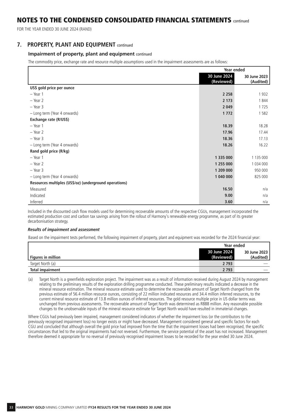 33 HARMONY GOLD MINING COMPANY LIMITED FY24 RESULTS FOR THE YEAR ENDED 30 JUNE 2024 NOTES TO THE CONDENSED CONSOLIDATED FINANCIAL STATEMENTS continued FOR THE YEAR ENDED 30 JUNE 2024 (RAND) 7. PROPERTY, PLANT AND EQUIPMENT continued Impairment of property, plant and equipment continued The commodity price, exchange rate and resource multiple assumptions used in the impairment assessments are as follows: Year ended 30 June 2024 (Reviewed) 30 June 2023 (Audited) US$ gold price per ounce – Year 1 2 258 1 932 – Year 2 2 173 1 844 – Year 3 2 049 1 725 – Long term (Year 4 onwards) 1 772 1 582 Exchange rate (R/US$) – Year 1 18.39 18.28 – Year 2 17.96 17.44 – Year 3 18.36 17.13 – Long term (Year 4 onwards) 18.26 16.22 Rand gold price (R/kg) – Year 1 1 335 000 1 135 000 – Year 2 1 255 000 1 034 000 – Year 3 1 209 000 950 000 – Long term (Year 4 onwards) 1 040 000 825 000 Resources multiples (US$/oz) (underground operations) Measured 16.50 n/a Indicated 9.00 n/a Inferred 3.60 n/a Included in the discounted cash flow models used for determining recoverable amounts of the respective CGUs, management incorporated the estimated production cost and carbon tax savings arising from the rollout of Harmony's renewable energy programme, as part of its greater decarbonisation strategy. Results of impairment and assessment Based on the impairment tests performed, the following impairment of property, plant and equipment was recorded for the 2024 financial year: Year ended Figures in million 30 June 2024 (Reviewed) 30 June 2023 (Audited) Target North (a) 2 793 — Total impairment 2 793 — (a) Target North is a greenfields exploration project. The impairment was as a result of information received during August 2024 by management relating to the preliminary results of the exploration drilling programme conducted. These preliminary results indicated a decrease in the mineral resource estimation. The mineral resource estimate used to determine the recoverable amount of Target North changed from the previous estimate of 56.4 million resource ounces, consisting of 22 million indicated resources and 34.4 million inferred resources, to the current mineral resource estimate of 13.8 million ounces of inferred resources. The gold resource multiple price in US dollar terms was unchanged from previous assessments. The recoverable amount of Target North was determined as R888 million. Any reasonable possible changes to the unobservable inputs of the mineral resource estimate for Target North would have resulted in immaterial changes. Where CGUs had previously been impaired, management considered indicators of whether the impairment loss (or the contributors to the previously recognised impairment loss) no longer exists or might have decreased. Management considered general and specific factors for each CGU and concluded that although overall the gold price had improved from the time that the impairment losses had been recognised, the specific circumstances that led to the original impairments had not reversed. Furthermore, the service potential of the asset has not increased. Management therefore deemed it appropriate for no reversal of previously recognised impairment losses to be recorded for the year ended 30 June 2024.