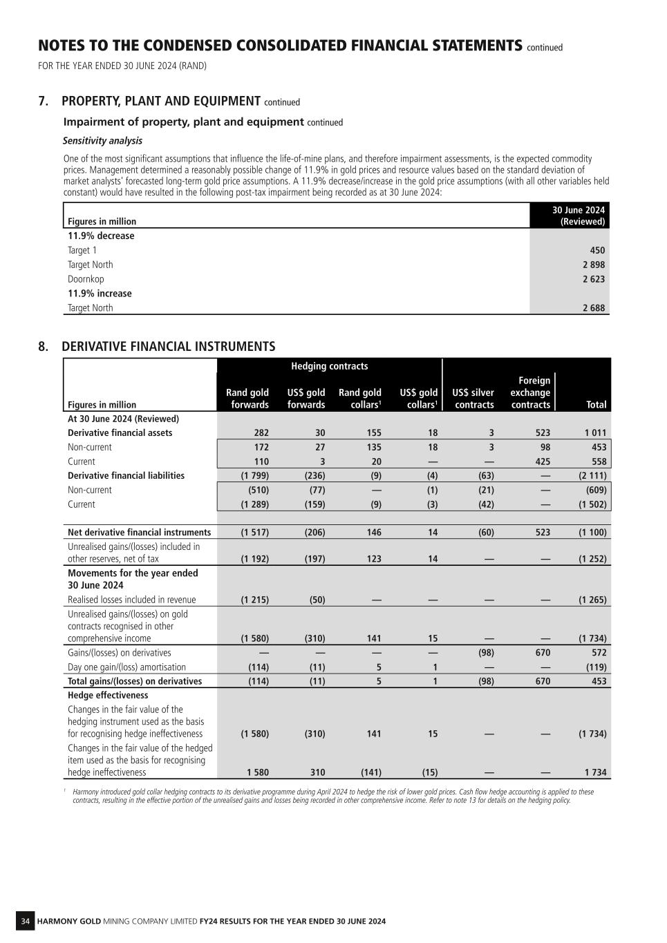 34 HARMONY GOLD MINING COMPANY LIMITED FY24 RESULTS FOR THE YEAR ENDED 30 JUNE 2024 NOTES TO THE CONDENSED CONSOLIDATED FINANCIAL STATEMENTS continued FOR THE YEAR ENDED 30 JUNE 2024 (RAND) 7. PROPERTY, PLANT AND EQUIPMENT continued Impairment of property, plant and equipment continued Sensitivity analysis One of the most significant assumptions that influence the life-of-mine plans, and therefore impairment assessments, is the expected commodity prices. Management determined a reasonably possible change of 11.9% in gold prices and resource values based on the standard deviation of market analysts' forecasted long-term gold price assumptions. A 11.9% decrease/increase in the gold price assumptions (with all other variables held constant) would have resulted in the following post-tax impairment being recorded as at 30 June 2024: Figures in million 30 June 2024 (Reviewed) 11.9% decrease Target 1 450 Target North 2 898 Doornkop 2 623 11.9% increase Target North 2 688 8. DERIVATIVE FINANCIAL INSTRUMENTS Figures in million Hedging contracts Total Rand gold forwards US$ gold forwards Rand gold collars1 US$ gold collars1 US$ silver contracts Foreign exchange contracts At 30 June 2024 (Reviewed) Derivative financial assets 282 30 155 18 3 523 1 011 Non-current 172 27 135 18 3 98 453 Current 110 3 20 — — 425 558 Derivative financial liabilities (1 799) (236) (9) (4) (63) — (2 111) Non-current (510) (77) — (1) (21) — (609) Current (1 289) (159) (9) (3) (42) — (1 502) Net derivative financial instruments (1 517) (206) 146 14 (60) 523 (1 100) Unrealised gains/(losses) included in other reserves, net of tax (1 192) (197) 123 14 — — (1 252) Movements for the year ended 30 June 2024 Realised losses included in revenue (1 215) (50) — — — — (1 265) Unrealised gains/(losses) on gold contracts recognised in other comprehensive income (1 580) (310) 141 15 — — (1 734) Gains/(losses) on derivatives — — — — (98) 670 572 Day one gain/(loss) amortisation (114) (11) 5 1 — — (119) Total gains/(losses) on derivatives (114) (11) 5 1 (98) 670 453 Hedge effectiveness Changes in the fair value of the hedging instrument used as the basis for recognising hedge ineffectiveness (1 580) (310) 141 15 — — (1 734) Changes in the fair value of the hedged item used as the basis for recognising hedge ineffectiveness 1 580 310 (141) (15) — — 1 734 1 Harmony introduced gold collar hedging contracts to its derivative programme during April 2024 to hedge the risk of lower gold prices. Cash flow hedge accounting is applied to these contracts, resulting in the effective portion of the unrealised gains and losses being recorded in other comprehensive income. Refer to note 13 for details on the hedging policy.