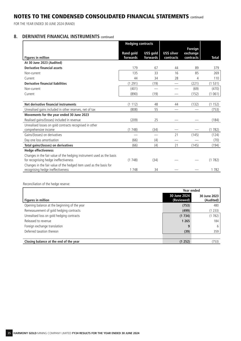 35 HARMONY GOLD MINING COMPANY LIMITED FY24 RESULTS FOR THE YEAR ENDED 30 JUNE 2024 NOTES TO THE CONDENSED CONSOLIDATED FINANCIAL STATEMENTS continued FOR THE YEAR ENDED 30 JUNE 2024 (RAND) 8. DERIVATIVE FINANCIAL INSTRUMENTS continued Figures in million Hedging contracts Rand gold forwards US$ gold forwards US$ silver contracts Foreign exchange contracts Total At 30 June 2023 (Audited) Derivative financial assets 179 67 44 89 379 Non-current 135 33 16 85 269 Current 44 34 28 4 110 Derivative financial liabilities (1 291) (19) — (221) (1 531) Non-current (401) — — (69) (470) Current (890) (19) — (152) (1 061) Net derivative financial instruments (1 112) 48 44 (132) (1 152) Unrealised gains included in other reserves, net of tax (808) 55 — — (753) Movements for the year ended 30 June 2023 Realised gains/(losses) included in revenue (209) 25 — — (184) Unrealised losses on gold contracts recognised in other comprehensive income (1 748) (34) — — (1 782) Gains/(losses) on derivatives — — 21 (145) (124) Day one loss amortisation (66) (4) — — (70) Total gains/(losses) on derivatives (66) (4) 21 (145) (194) Hedge effectiveness Changes in the fair value of the hedging instrument used as the basis for recognising hedge ineffectiveness (1 748) (34) — — (1 782) Changes in the fair value of the hedged item used as the basis for recognising hedge ineffectiveness 1 748 34 — — 1 782 Reconciliation of the hedge reserve: Year ended Figures in million 30 June 2024 (Reviewed) 30 June 2023 (Audited) Opening balance at the beginning of the year (753) 480 Remeasurement of gold hedging contracts (499) (1 233) Unrealised loss on gold hedging contracts (1 734) (1 782) Released to revenue 1 265 184 Foreign exchange translation 9 6 Deferred taxation thereon (39) 359 Closing balance at the end of the year (1 252) (753)
