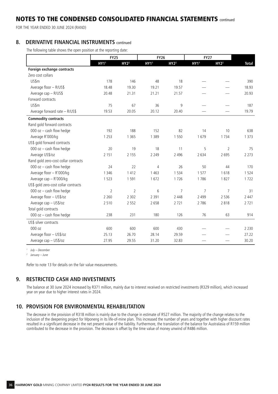 36 HARMONY GOLD MINING COMPANY LIMITED FY24 RESULTS FOR THE YEAR ENDED 30 JUNE 2024 NOTES TO THE CONDENSED CONSOLIDATED FINANCIAL STATEMENTS continued FOR THE YEAR ENDED 30 JUNE 2024 (RAND) 8. DERIVATIVE FINANCIAL INSTRUMENTS continued The following table shows the open position at the reporting date: FY25 FY26 FY27 TotalHY11 HY22 HY11 HY22 HY11 HY22 Foreign exchange contracts Zero cost collars US$m 178 146 48 18 — — 390 Average floor – R/US$ 18.48 19.30 19.21 19.57 — — 18.93 Average cap – R/US$ 20.48 21.31 21.21 21.57 — — 20.93 Forward contracts US$m 75 67 36 9 — — 187 Average forward rate – R/US$ 19.53 20.05 20.12 20.40 — — 19.79 Commodity contracts Rand gold forward contracts 000 oz – cash flow hedge 192 188 152 82 14 10 638 Average R'000/kg 1 253 1 365 1 389 1 550 1 679 1 734 1 373 US$ gold forward contracts 000 oz – cash flow hedge 20 19 18 11 5 2 75 Average US$/oz 2 151 2 155 2 249 2 496 2 634 2 695 2 273 Rand gold zero-cost collar contracts 000 oz – cash flow hedge 24 22 4 26 50 44 170 Average floor – R'000/kg 1 346 1 412 1 463 1 534 1 577 1 618 1 524 Average cap – R'000/kg 1 523 1 591 1 672 1 726 1 786 1 827 1 722 US$ gold zero-cost collar contracts 000 oz – cash flow hedge 2 2 6 7 7 7 31 Average floor – US$/oz 2 260 2 302 2 391 2 448 2 499 2 536 2 447 Average cap – US$/oz 2 510 2 552 2 658 2 721 2 786 2 818 2 721 Total gold contracts 000 oz – cash flow hedge 238 231 180 126 76 63 914 US$ silver contracts 000 oz 600 600 600 430 — — 2 230 Average floor – US$/oz 25.13 26.70 28.14 29.59 — — 27.22 Average cap – US$/oz 27.95 29.55 31.20 32.83 — — 30.20 1 July – December 2 January – June Refer to note 13 for details on the fair value measurements. 9. RESTRICTED CASH AND INVESTMENTS The balance at 30 June 2024 increased by R371 million, mainly due to interest received on restricted investments (R329 million), which increased year on year due to higher interest rates in 2024. 10. PROVISION FOR ENVIRONMENTAL REHABILITATION The decrease in the provision of R318 million is mainly due to the change in estimate of R527 million. The majority of the change relates to the inclusion of the deepening project for Mponeng in its life-of-mine plan. This increased the number of years and together with higher discount rates resulted in a significant decrease in the net present value of the liability. Furthermore, the translation of the balance for Australasia of R159 million contributed to the decrease in the provision. The decrease is offset by the time value of money unwind of R486 million.