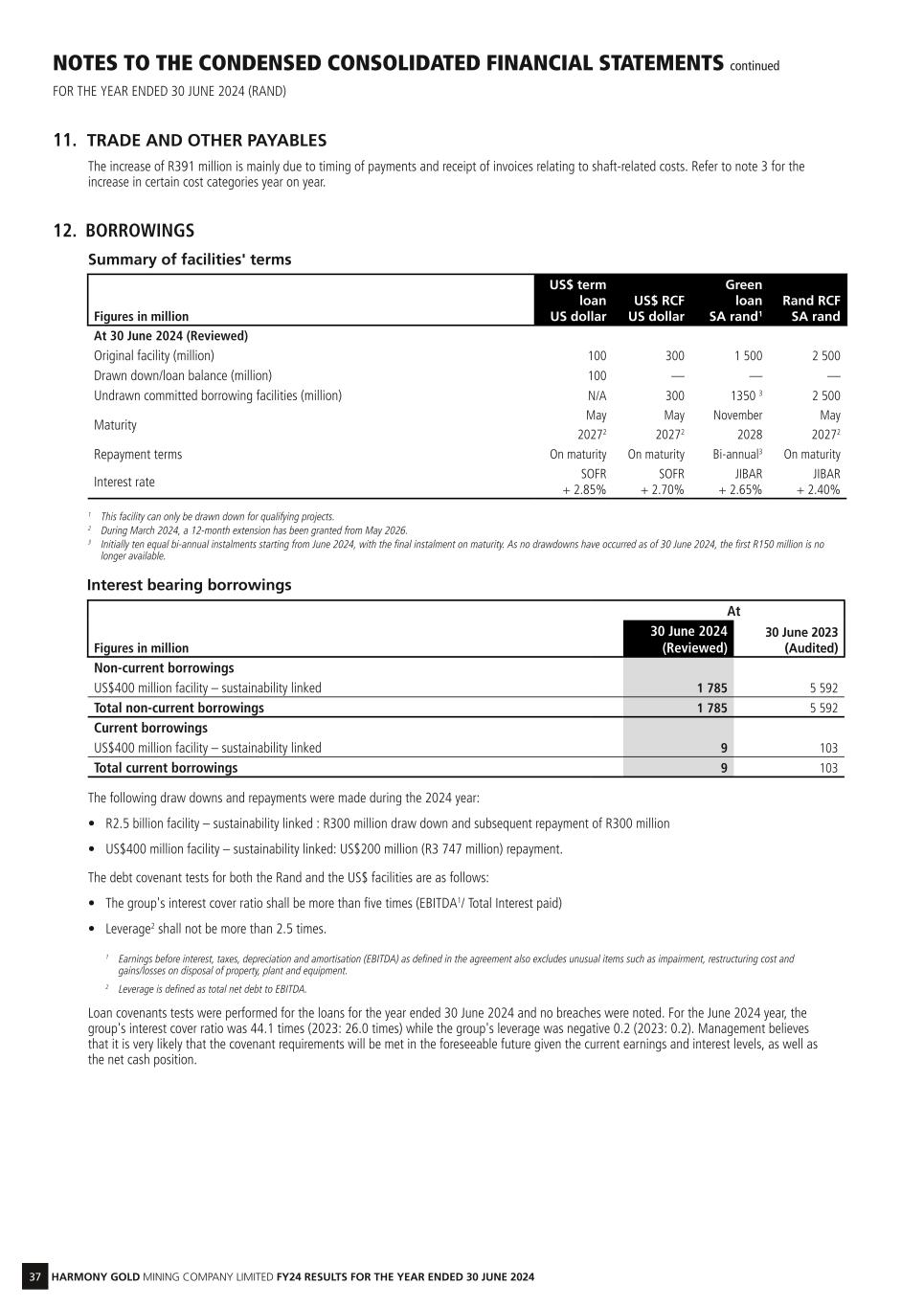37 HARMONY GOLD MINING COMPANY LIMITED FY24 RESULTS FOR THE YEAR ENDED 30 JUNE 2024 NOTES TO THE CONDENSED CONSOLIDATED FINANCIAL STATEMENTS continued FOR THE YEAR ENDED 30 JUNE 2024 (RAND) 11. TRADE AND OTHER PAYABLES The increase of R391 million is mainly due to timing of payments and receipt of invoices relating to shaft-related costs. Refer to note 3 for the increase in certain cost categories year on year. 12. BORROWINGS Summary of facilities' terms Figures in million US$ term loan US dollar US$ RCF US dollar Green loan SA rand1 Rand RCF SA rand At 30 June 2024 (Reviewed) Original facility (million) 100 300 1 500 2 500 Drawn down/loan balance (million) 100 — — — Undrawn committed borrowing facilities (million) N/A 300 1350 3 2 500 Maturity May May November May 20272 20272 2028 20272 Repayment terms On maturity On maturity Bi-annual3 On maturity Interest rate SOFR + 2.85% SOFR + 2.70% JIBAR + 2.65% JIBAR + 2.40% 1 This facility can only be drawn down for qualifying projects. 2 During March 2024, a 12-month extension has been granted from May 2026. 3 Initially ten equal bi-annual instalments starting from June 2024, with the final instalment on maturity. As no drawdowns have occurred as of 30 June 2024, the first R150 million is no longer available. Interest bearing borrowings At Figures in million 30 June 2024 (Reviewed) 30 June 2023 (Audited) Non-current borrowings US$400 million facility – sustainability linked 1 785 5 592 Total non-current borrowings 1 785 5 592 Current borrowings US$400 million facility – sustainability linked 9 103 Total current borrowings 9 103 The following draw downs and repayments were made during the 2024 year: • R2.5 billion facility – sustainability linked : R300 million draw down and subsequent repayment of R300 million • US$400 million facility – sustainability linked: US$200 million (R3 747 million) repayment. The debt covenant tests for both the Rand and the US$ facilities are as follows: • The group's interest cover ratio shall be more than five times (EBITDA1/ Total Interest paid) • Leverage2 shall not be more than 2.5 times. 1 Earnings before interest, taxes, depreciation and amortisation (EBITDA) as defined in the agreement also excludes unusual items such as impairment, restructuring cost and gains/losses on disposal of property, plant and equipment. 2 Leverage is defined as total net debt to EBITDA. Loan covenants tests were performed for the loans for the year ended 30 June 2024 and no breaches were noted. For the June 2024 year, the group's interest cover ratio was 44.1 times (2023: 26.0 times) while the group's leverage was negative 0.2 (2023: 0.2). Management believes that it is very likely that the covenant requirements will be met in the foreseeable future given the current earnings and interest levels, as well as the net cash position.