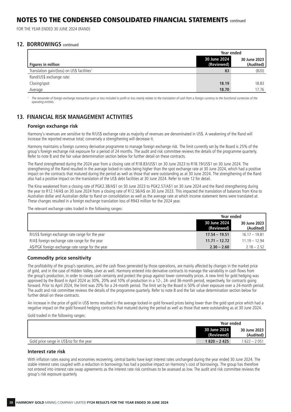 38 HARMONY GOLD MINING COMPANY LIMITED FY24 RESULTS FOR THE YEAR ENDED 30 JUNE 2024 NOTES TO THE CONDENSED CONSOLIDATED FINANCIAL STATEMENTS continued FOR THE YEAR ENDED 30 JUNE 2024 (RAND) 12. BORROWINGS continued Year ended Figures in million 30 June 2024 (Reviewed) 30 June 2023 (Audited) Translation gain/(loss) on US$ facilities1 83 (820) Rand/US$ exchange rate: Closing/spot 18.19 18.83 Average 18.70 17.76 1 The remainder of foreign exchange transaction gain or loss included in profit or loss mainly relates to the translation of cash from a foreign currency to the functional currencies of the operating entities. 13. FINANCIAL RISK MANAGEMENT ACTIVITIES Foreign exchange risk Harmony's revenues are sensitive to the R/US$ exchange rate as majority of revenues are denominated in US$. A weakening of the Rand will increase the reported revenue total; conversely a strengthening will decrease it. Harmony maintains a foreign currency derivative programme to manage foreign exchange risk. The limit currently set by the Board is 25% of the group's foreign exchange risk exposure for a period of 24 months. The audit and risk committee reviews the details of the programme quarterly. Refer to note 8 and the fair value determination section below for further detail on these contracts. The Rand strengthened during the 2024 year from a closing rate of R18.83/US$1 on 30 June 2023 to R18.19/US$1 on 30 June 2024. The strengthening of the Rand resulted in the average locked-in rates being higher than the spot exchange rate at 30 June 2024, which had a positive impact on the contracts that matured during the period as well as those that were outstanding as at 30 June 2024. The strengthening of the Rand also had a positive impact on the translation of the US$ debt facilities at 30 June 2024. Refer to note 12 for detail. The Kina weakened from a closing rate of PGK2.38/A$1 on 30 June 2023 to PGK2.57/A$1 on 30 June 2024 and the Rand strengthening during the year to R12.14/A$ on 30 June 2024 from a closing rate of R12.56/A$ on 30 June 2023. This impacted the translation of balances from Kina to Australian dollar and Australian dollar to Rand on consolidation as well as the average rate at which income statement items were translated at. These changes resulted in a foreign exchange translation loss of R943 million for the 2024 year. The relevant exchange rates traded in the following ranges: Year ended 30 June 2024 (Reviewed) 30 June 2023 (Audited) R/US$ foreign exchange rate range for the year 17.54 – 19.51 16.17 – 19.81 R/A$ foreign exchange rate range for the year 11.71 – 12.72 11.19 – 12.94 A$/PGK foreign exchange rate range for the year 2.30 – 2.60 2.18 – 2.52 Commodity price sensitivity The profitability of the group’s operations, and the cash flows generated by those operations, are mainly affected by changes in the market price of gold, and in the case of Hidden Valley, silver as well. Harmony entered into derivative contracts to manage the variability in cash flows from the group’s production, in order to create cash certainty and protect the group against lower commodity prices. A new limit for gold hedging was approved by the Board in April 2024 as 30%, 20% and 10% of production in a 12-, 24- and 36-month period, respectively, for contracts going forward. Prior to April 2024, the limit was 20% for a 24-month period. The limit set by the Board is 50% of silver exposure over a 24-month period. The audit and risk committee reviews the details of the programme quarterly. Refer to note 8 and the fair value determination section below for further detail on these contracts. An increase in the price of gold in US$ terms resulted in the average locked-in gold forward prices being lower than the gold spot price which had a negative impact on the gold forward hedging contracts that matured during the period as well as those that were outstanding as at 30 June 2024. Gold traded in the following ranges: Year ended 30 June 2024 (Reviewed) 30 June 2023 (Audited) Gold price range in US$/oz for the year 1 820 – 2 425 1 622 – 2 051 Interest rate risk With inflation rates easing and economies recovering, central banks have kept interest rates unchanged during the year ended 30 June 2024. The stable interest rates coupled with a reduction in borrowings has had a positive impact on Harmony's cost of borrowings. The group has therefore not entered into interest rate swap agreements as the interest rate risk continues to be assessed as low. The audit and risk committee reviews the group's risk exposure quarterly.