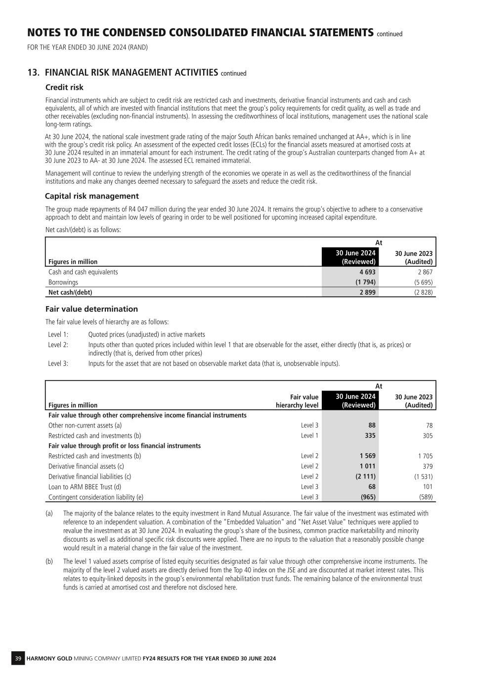 39 HARMONY GOLD MINING COMPANY LIMITED FY24 RESULTS FOR THE YEAR ENDED 30 JUNE 2024 NOTES TO THE CONDENSED CONSOLIDATED FINANCIAL STATEMENTS continued FOR THE YEAR ENDED 30 JUNE 2024 (RAND) 13. FINANCIAL RISK MANAGEMENT ACTIVITIES continued Credit risk Financial instruments which are subject to credit risk are restricted cash and investments, derivative financial instruments and cash and cash equivalents, all of which are invested with financial institutions that meet the group's policy requirements for credit quality, as well as trade and other receivables (excluding non-financial instruments). In assessing the creditworthiness of local institutions, management uses the national scale long-term ratings. At 30 June 2024, the national scale investment grade rating of the major South African banks remained unchanged at AA+, which is in line with the group's credit risk policy. An assessment of the expected credit losses (ECLs) for the financial assets measured at amortised costs at 30 June 2024 resulted in an immaterial amount for each instrument. The credit rating of the group's Australian counterparts changed from A+ at 30 June 2023 to AA- at 30 June 2024. The assessed ECL remained immaterial. Management will continue to review the underlying strength of the economies we operate in as well as the creditworthiness of the financial institutions and make any changes deemed necessary to safeguard the assets and reduce the credit risk. Capital risk management The group made repayments of R4 047 million during the year ended 30 June 2024. It remains the group's objective to adhere to a conservative approach to debt and maintain low levels of gearing in order to be well positioned for upcoming increased capital expenditure. Net cash/(debt) is as follows: At Figures in million 30 June 2024 (Reviewed) 30 June 2023 (Audited) Cash and cash equivalents 4 693 2 867 Borrowings (1 794) (5 695) Net cash/(debt) 2 899 (2 828) Fair value determination The fair value levels of hierarchy are as follows: Level 1: Quoted prices (unadjusted) in active markets Level 2: Inputs other than quoted prices included within level 1 that are observable for the asset, either directly (that is, as prices) or indirectly (that is, derived from other prices) Level 3: Inputs for the asset that are not based on observable market data (that is, unobservable inputs). At Figures in million Fair value hierarchy level 30 June 2024 (Reviewed) 30 June 2023 (Audited) Fair value through other comprehensive income financial instruments Other non-current assets (a) Level 3 88 78 Restricted cash and investments (b) Level 1 335 305 Fair value through profit or loss financial instruments Restricted cash and investments (b) Level 2 1 569 1 705 Derivative financial assets (c) Level 2 1 011 379 Derivative financial liabilities (c) Level 2 (2 111) (1 531) Loan to ARM BBEE Trust (d) Level 3 68 101 Contingent consideration liability (e) Level 3 (965) (589) (a) The majority of the balance relates to the equity investment in Rand Mutual Assurance. The fair value of the investment was estimated with reference to an independent valuation. A combination of the "Embedded Valuation" and "Net Asset Value" techniques were applied to revalue the investment as at 30 June 2024. In evaluating the group's share of the business, common practice marketability and minority discounts as well as additional specific risk discounts were applied. There are no inputs to the valuation that a reasonably possible change would result in a material change in the fair value of the investment. (b) The level 1 valued assets comprise of listed equity securities designated as fair value through other comprehensive income instruments. The majority of the level 2 valued assets are directly derived from the Top 40 index on the JSE and are discounted at market interest rates. This relates to equity-linked deposits in the group's environmental rehabilitation trust funds. The remaining balance of the environmental trust funds is carried at amortised cost and therefore not disclosed here.