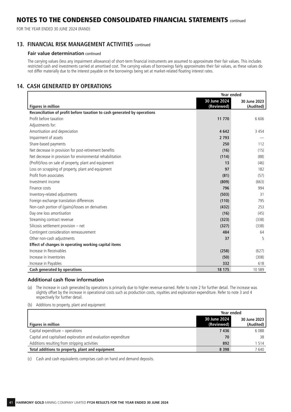 41 HARMONY GOLD MINING COMPANY LIMITED FY24 RESULTS FOR THE YEAR ENDED 30 JUNE 2024 NOTES TO THE CONDENSED CONSOLIDATED FINANCIAL STATEMENTS continued FOR THE YEAR ENDED 30 JUNE 2024 (RAND) 13. FINANCIAL RISK MANAGEMENT ACTIVITIES continued Fair value determination continued The carrying values (less any impairment allowance) of short-term financial instruments are assumed to approximate their fair values. This includes restricted cash and investments carried at amortised cost. The carrying values of borrowings fairly approximates their fair values, as these values do not differ materially due to the interest payable on the borrowings being set at market-related floating interest rates. 14. CASH GENERATED BY OPERATIONS Year ended Figures in million 30 June 2024 (Reviewed) 30 June 2023 (Audited) Reconciliation of profit before taxation to cash generated by operations Profit before taxation 11 770 6 606 Adjustments for: Amortisation and depreciation 4 642 3 454 Impairment of assets 2 793 — Share-based payments 250 112 Net decrease in provision for post-retirement benefits (16) (15) Net decrease in provision for environmental rehabilitation (114) (88) (Profit)/loss on sale of property, plant and equipment 13 (46) Loss on scrapping of property, plant and equipment 97 182 Profit from associates (81) (57) Investment income (809) (663) Finance costs 796 994 Inventory-related adjustments (503) 31 Foreign exchange translation differences (110) 795 Non-cash portion of (gains)/losses on derivatives (432) 253 Day one loss amortisation (16) (45) Streaming contract revenue (323) (338) Silicosis settlement provision – net (327) (338) Contingent consideration remeasurement 484 64 Other non-cash adjustments 37 5 Effect of changes in operating working capital items Increase in Receivables (258) (627) Increase in Inventories (50) (308) Increase in Payables 332 618 Cash generated by operations 18 175 10 589 Additional cash flow information (a) The increase in cash generated by operations is primarily due to higher revenue earned. Refer to note 2 for further detail. The increase was slightly offset by the increase in operational costs such as production costs, royalties and exploration expenditure. Refer to note 3 and 4 respectively for further detail. (b) Additions to property, plant and equipment: Year ended Figures in million 30 June 2024 (Reviewed) 30 June 2023 (Audited) Capital expenditure – operations 7 436 6 088 Capital and capitalised exploration and evaluation expenditure 70 38 Additions resulting from stripping activities 892 1 514 Total additions to property, plant and equipment 8 398 7 640 (c) Cash and cash equivalents comprises cash on hand and demand deposits.