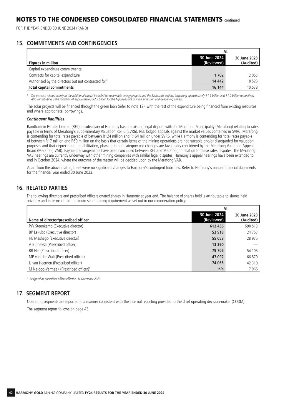 42 HARMONY GOLD MINING COMPANY LIMITED FY24 RESULTS FOR THE YEAR ENDED 30 JUNE 2024 NOTES TO THE CONDENSED CONSOLIDATED FINANCIAL STATEMENTS continued FOR THE YEAR ENDED 30 JUNE 2024 (RAND) 15. COMMITMENTS AND CONTINGENCIES At Figures in million 30 June 2024 (Reviewed) 30 June 2023 (Audited) Capital expenditure commitments: Contracts for capital expenditure 1 702 2 053 Authorised by the directors but not contracted for1 14 442 8 525 Total capital commitments 16 144 10 578 1 The increase relates mainly to the additional capital included for renewable energy projects and the Zaaiplaats project, increasing approximately R1.5 billion and R1.0 billion respectively. Also contributing is the inclusion of approximately R2.9 billion for the Mponeng life of mine extension and deepening project. The solar projects will be financed through the green loan (refer to note 12), with the rest of the expenditure being financed from existing resources and where appropriate, borrowings. Contingent liabilities Randfontein Estates Limited (REL), a subsidiary of Harmony has an existing legal dispute with the Merafong Municipality (Merafong) relating to rates payable in terms of Merafong's Supplementary Valuation Roll 6 (SVR6). REL lodged appeals against the market values contained in SVR6. Merafong is contending for total rates payable of between R124 million and R164 million under SVR6, while Harmony is contending for total rates payable of between R17 million and R69 million on the basis that certain items of the mining operations are not rateable and/or disregarded for valuation purposes and that depreciation, rehabilitation, phasing-in and category use changes are favourably considered by the Merafong Valuation Appeal Board (Merafong VAB). Payment arrangements have been concluded between REL and Merafong in relation to these rates disputes. The Merafong VAB hearings are currently underway with other mining companies with similar legal disputes. Harmony's appeal hearings have been extended to end in October 2024, where the outcome of the matter will be decided upon by the Merafong VAB. Apart from the above matter, there were no significant changes to Harmony's contingent liabilities. Refer to Harmony's annual financial statements for the financial year ended 30 June 2023. 16. RELATED PARTIES The following directors and prescribed officers owned shares in Harmony at year end. The balance of shares held is attributable to shares held privately and in terms of the minimum shareholding requirement as set out in our remuneration policy: At Name of director/prescribed officer 30 June 2024 (Reviewed) 30 June 2023 (Audited) PW Steenkamp (Executive director) 612 436 598 513 BP Lekubo (Executive director) 52 918 24 753 HE Mashego (Executive director) 55 053 28 975 A Buthelezi (Prescribed officer) 13 390 — BB Nel (Prescribed officer) 79 706 54 195 MP van der Walt (Prescribed officer) 47 092 66 870 JJ van Heerden (Prescribed officer) 74 065 42 310 M Naidoo-Vermaak (Prescribed officer)1 n/a 7 966 1 Resigned as prescribed officer effective 31 December 2023. 17. SEGMENT REPORT Operating segments are reported in a manner consistent with the internal reporting provided to the chief operating decision-maker (CODM). The segment report follows on page 45.