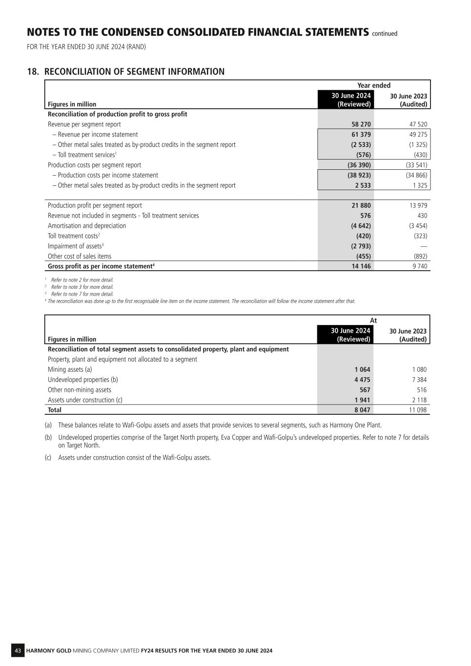 43 HARMONY GOLD MINING COMPANY LIMITED FY24 RESULTS FOR THE YEAR ENDED 30 JUNE 2024 NOTES TO THE CONDENSED CONSOLIDATED FINANCIAL STATEMENTS continued FOR THE YEAR ENDED 30 JUNE 2024 (RAND) 18. RECONCILIATION OF SEGMENT INFORMATION Year ended Figures in million 30 June 2024 (Reviewed) 30 June 2023 (Audited) Reconciliation of production profit to gross profit Revenue per segment report 58 270 47 520 – Revenue per income statement 61 379 49 275 – Other metal sales treated as by-product credits in the segment report (2 533) (1 325) – Toll treatment services1 (576) (430) Production costs per segment report (36 390) (33 541) – Production costs per income statement (38 923) (34 866) – Other metal sales treated as by-product credits in the segment report 2 533 1 325 Production profit per segment report 21 880 13 979 Revenue not included in segments - Toll treatment services 576 430 Amortisation and depreciation (4 642) (3 454) Toll treatment costs2 (420) (323) Impairment of assets3 (2 793) — Other cost of sales items (455) (892) Gross profit as per income statement4 14 146 9 740 1 Refer to note 2 for more detail. 2 Refer to note 3 for more detail. 3 Refer to note 7 for more detail. 4 The reconciliation was done up to the first recognisable line item on the income statement. The reconciliation will follow the income statement after that. At Figures in million 30 June 2024 (Reviewed) 30 June 2023 (Audited) Reconciliation of total segment assets to consolidated property, plant and equipment Property, plant and equipment not allocated to a segment Mining assets (a) 1 064 1 080 Undeveloped properties (b) 4 475 7 384 Other non-mining assets 567 516 Assets under construction (c) 1 941 2 118 Total 8 047 11 098 (a) These balances relate to Wafi-Golpu assets and assets that provide services to several segments, such as Harmony One Plant. (b) Undeveloped properties comprise of the Target North property, Eva Copper and Wafi-Golpu’s undeveloped properties. Refer to note 7 for details on Target North. (c) Assets under construction consist of the Wafi-Golpu assets.
