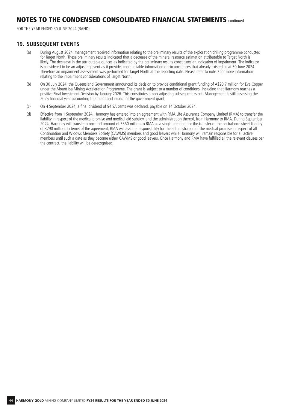 44 HARMONY GOLD MINING COMPANY LIMITED FY24 RESULTS FOR THE YEAR ENDED 30 JUNE 2024 NOTES TO THE CONDENSED CONSOLIDATED FINANCIAL STATEMENTS continued FOR THE YEAR ENDED 30 JUNE 2024 (RAND) 19. SUBSEQUENT EVENTS (a) During August 2024, management received information relating to the preliminary results of the exploration drilling programme conducted for Target North. These preliminary results indicated that a decrease of the mineral resource estimation attributable to Target North is likely. The decrease in the attributable ounces as indicated by the preliminary results constitutes an indication of impairment. The indicator is considered to be an adjusting event as it provides more reliable information of circumstances that already existed as at 30 June 2024. Therefore an impairment assessment was performed for Target North at the reporting date. Please refer to note 7 for more information relating to the impairment considerations of Target North. (b) On 30 July 2024, the Queensland Government announced its decision to provide conditional grant funding of A$20.7 million for Eva Copper under the Mount Isa Mining Acceleration Programme. The grant is subject to a number of conditions, including that Harmony reaches a positive Final Investment Decision by January 2026. This constitutes a non-adjusting subsequent event. Management is still assessing the 2025 financial year accounting treatment and impact of the government grant. (c) On 4 September 2024, a final dividend of 94 SA cents was declared, payable on 14 October 2024. (d) Effective from 1 September 2024, Harmony has entered into an agreement with RMA Life Assurance Company Limited (RMA) to transfer the liability in respect of the medical promise and medical aid subsidy, and the administration thereof, from Harmony to RMA. During September 2024, Harmony will transfer a once-off amount of R350 million to RMA as a single premium for the transfer of the on-balance sheet liability of R290 million. In terms of the agreement, RMA will assume responsibility for the administration of the medical promise in respect of all Continuation and Widows Members Society (CAWMS) members and good leavers while Harmony will remain responsible for all active members until such a date as they become either CAWMS or good leavers. Once Harmony and RMA have fulfilled all the relevant clauses per the contract, the liability will be derecognised.