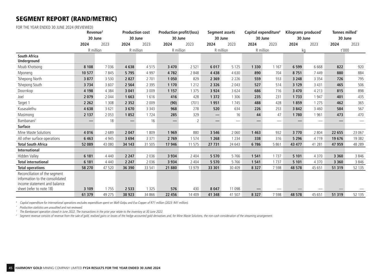 45 HARMONY GOLD MINING COMPANY LIMITED FY24 RESULTS FOR THE YEAR ENDED 30 JUNE 2024 Revenue2 Production cost Production profit/(loss) Segment assets Capital expenditure# Kilograms produced* Tonnes milled* 30 June 30 June 30 June 30 June 30 June 30 June 30 June 2024 2023 2024 2023 2024 2023 2024 2023 2024 2023 2024 2023 2024 2023 R million R million R million R million R million kg t'000 South Africa Underground Moab Khotsong 8 108 7 036 4 638 4 515 3 470 2 521 6 017 5 125 1 330 1 167 6 599 6 668 822 920 Mponeng 10 577 7 845 5 795 4 997 4 782 2 848 4 438 4 630 890 704 8 751 7 449 880 884 Tshepong North 3 877 3 530 2 827 2 701 1 050 829 2 369 2 226 559 553 3 248 3 354 726 795 Tshepong South 3 734 3 607 2 564 2 395 1 170 1 212 2 326 2 043 527 514 3 129 3 431 465 506 Doornkop 4 198 4 384 3 041 3 009 1 157 1 375 3 924 3 624 686 716 3 470 4 213 815 898 Joel 2 079 2 044 1 663 1 616 416 428 1 372 1 306 235 231 1 733 1 947 401 435 Target 1 2 262 1 308 2 352 2 009 (90) (701) 1 951 1 745 488 428 1 859 1 275 462 365 Kusasalethu 4 638 3 621 3 670 3 343 968 278 520 634 226 253 3 842 3 460 584 567 Masimong 2 137 2 053 1 852 1 724 285 329 — 16 44 47 1 780 1 961 473 470 Bambanani1 — 18 — 16 — 2 — — — — — — — — Surface Mine Waste Solutions 4 016 2 689 2 047 1 809 1 969 880 3 546 2 060 1 463 932 3 770 2 804 22 655 23 067 All other surface operations 6 463 4 945 3 694 3 371 2 769 1 574 1 268 1 234 338 316 5 296 4 719 19 676 19 382 Total South Africa 52 089 43 080 34 143 31 505 17 946 11 575 27 731 24 643 6 786 5 861 43 477 41 281 47 959 48 289 International Hidden Valley 6 181 4 440 2 247 2 036 3 934 2 404 5 570 5 766 1 541 1 737 5 101 4 370 3 360 3 846 Total international 6 181 4 440 2 247 2 036 3 934 2 404 5 570 5 766 1 541 1 737 5 101 4 370 3 360 3 846 Total operations 58 270 47 520 36 390 33 541 21 880 13 979 33 301 30 409 8 327 7 598 48 578 45 651 51 319 52 135 Reconciliation of the segment information to the consolidated income statement and balance sheet (refer to note 18) 3 109 1 755 2 533 1 325 576 430 8 047 11 098 — — — — — — 61 379 49 275 38 923 34 866 22 456 14 409 41 348 41 507 8 327 7 598 48 578 45 651 51 319 52 135 # Capital expenditure for international operations excludes expenditure spent on Wafi-Golpu and Eva Copper of R71 million (2023: R41 million). * Production statistics are unaudited and not reviewed. 1 The Bambanani operation closed in June 2022. The transactions in the prior year relate to the inventory at 30 June 2022. 2 Segment revenue consists of revenue from the sale of gold, realised gains or losses of the hedge-accounted gold derivatives and, for Mine Waste Solutions, the non-cash consideration of the streaming arrangement. SEGMENT REPORT (RAND/METRIC) FOR THE YEAR ENDED 30 JUNE 2024 (REVIEWED)