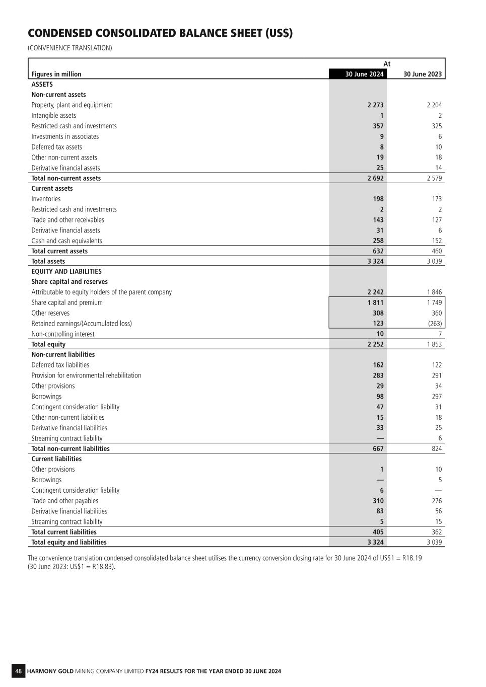 48 HARMONY GOLD MINING COMPANY LIMITED FY24 RESULTS FOR THE YEAR ENDED 30 JUNE 2024 CONDENSED CONSOLIDATED BALANCE SHEET (US$) (CONVENIENCE TRANSLATION) At Figures in million 30 June 2024 30 June 2023 ASSETS Non-current assets Property, plant and equipment 2 273 2 204 Intangible assets 1 2 Restricted cash and investments 357 325 Investments in associates 9 6 Deferred tax assets 8 10 Other non-current assets 19 18 Derivative financial assets 25 14 Total non-current assets 2 692 2 579 Current assets Inventories 198 173 Restricted cash and investments 2 2 Trade and other receivables 143 127 Derivative financial assets 31 6 Cash and cash equivalents 258 152 Total current assets 632 460 Total assets 3 324 3 039 EQUITY AND LIABILITIES Share capital and reserves Attributable to equity holders of the parent company 2 242 1 846 Share capital and premium 1 811 1 749 Other reserves 308 360 Retained earnings/(Accumulated loss) 123 (263) Non-controlling interest 10 7 Total equity 2 252 1 853 Non-current liabilities Deferred tax liabilities 162 122 Provision for environmental rehabilitation 283 291 Other provisions 29 34 Borrowings 98 297 Contingent consideration liability 47 31 Other non-current liabilities 15 18 Derivative financial liabilities 33 25 Streaming contract liability — 6 Total non-current liabilities 667 824 Current liabilities Other provisions 1 10 Borrowings — 5 Contingent consideration liability 6 — Trade and other payables 310 276 Derivative financial liabilities 83 56 Streaming contract liability 5 15 Total current liabilities 405 362 Total equity and liabilities 3 324 3 039 The convenience translation condensed consolidated balance sheet utilises the currency conversion closing rate for 30 June 2024 of US$1 = R18.19 (30 June 2023: US$1 = R18.83).
