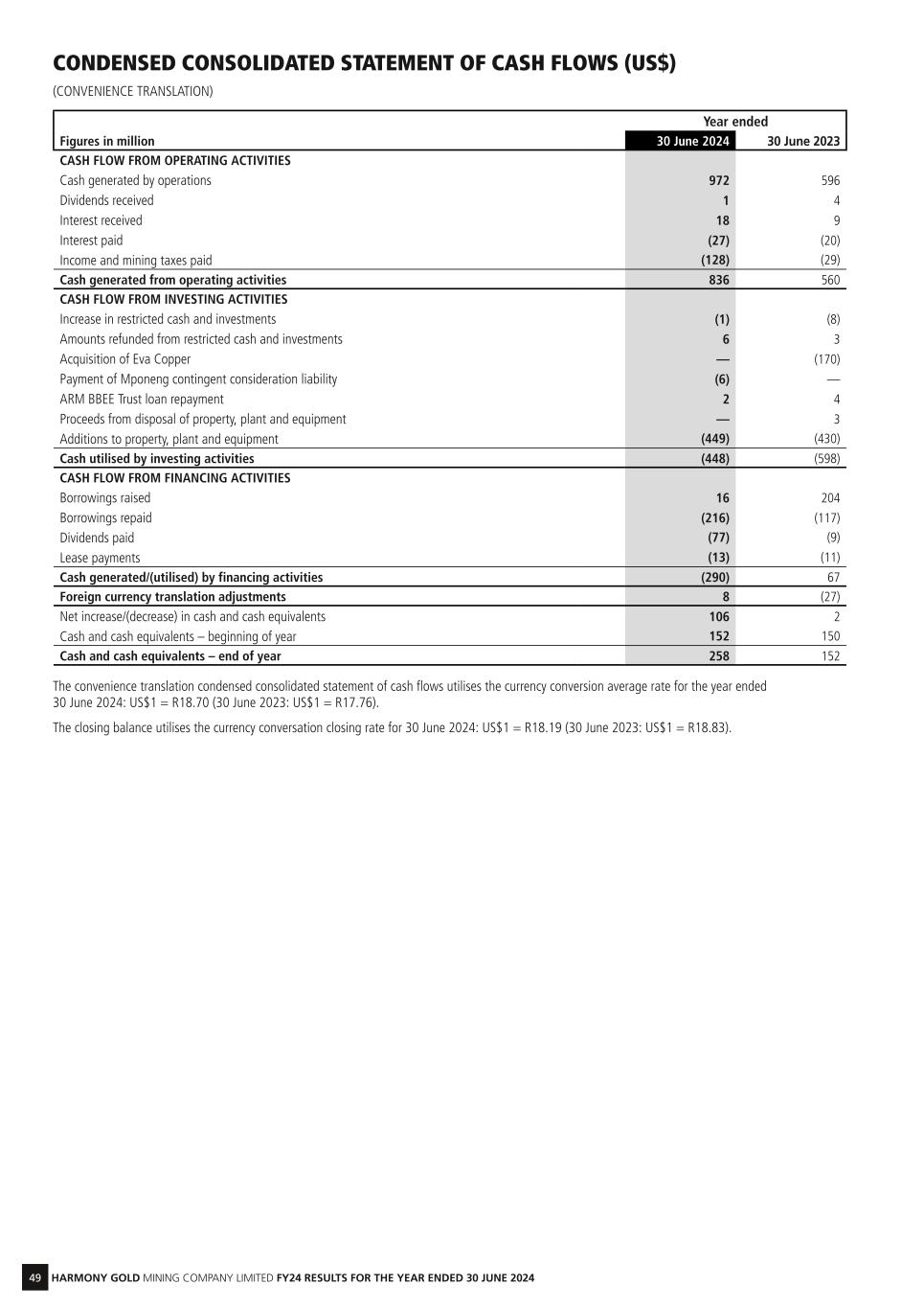 49 HARMONY GOLD MINING COMPANY LIMITED FY24 RESULTS FOR THE YEAR ENDED 30 JUNE 2024 CONDENSED CONSOLIDATED STATEMENT OF CASH FLOWS (US$) (CONVENIENCE TRANSLATION) Year ended Figures in million 30 June 2024 30 June 2023 CASH FLOW FROM OPERATING ACTIVITIES Cash generated by operations 972 596 Dividends received 1 4 Interest received 18 9 Interest paid (27) (20) Income and mining taxes paid (128) (29) Cash generated from operating activities 836 560 CASH FLOW FROM INVESTING ACTIVITIES Increase in restricted cash and investments (1) (8) Amounts refunded from restricted cash and investments 6 3 Acquisition of Eva Copper — (170) Payment of Mponeng contingent consideration liability (6) — ARM BBEE Trust loan repayment 2 4 Proceeds from disposal of property, plant and equipment — 3 Additions to property, plant and equipment (449) (430) Cash utilised by investing activities (448) (598) CASH FLOW FROM FINANCING ACTIVITIES Borrowings raised 16 204 Borrowings repaid (216) (117) Dividends paid (77) (9) Lease payments (13) (11) Cash generated/(utilised) by financing activities (290) 67 Foreign currency translation adjustments 8 (27) Net increase/(decrease) in cash and cash equivalents 106 2 Cash and cash equivalents – beginning of year 152 150 Cash and cash equivalents – end of year 258 152 The convenience translation condensed consolidated statement of cash flows utilises the currency conversion average rate for the year ended 30 June 2024: US$1 = R18.70 (30 June 2023: US$1 = R17.76). The closing balance utilises the currency conversation closing rate for 30 June 2024: US$1 = R18.19 (30 June 2023: US$1 = R18.83).