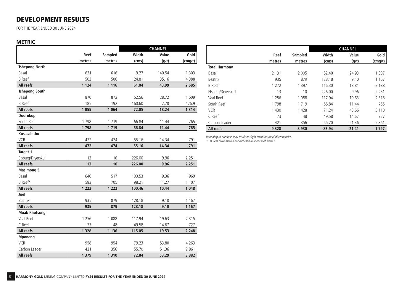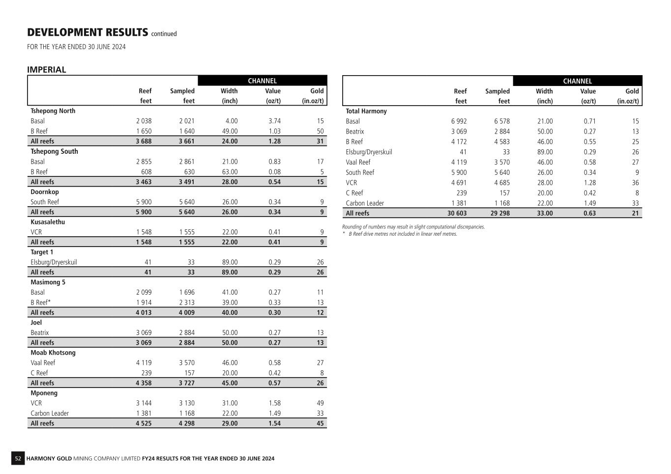 52 HARMONY GOLD MINING COMPANY LIMITED FY24 RESULTS FOR THE YEAR ENDED 30 JUNE 2024 DEVELOPMENT RESULTS continued FOR THE YEAR ENDED 30 JUNE 2024 IMPERIAL CHANNEL Reef Sampled Width Value Gold feet feet (inch) (oz/t) (in.oz/t) Tshepong North Basal 2 038 2 021 4.00 3.74 15 B Reef 1 650 1 640 49.00 1.03 50 All reefs 3 688 3 661 24.00 1.28 31 Tshepong South Basal 2 855 2 861 21.00 0.83 17 B Reef 608 630 63.00 0.08 5 All reefs 3 463 3 491 28.00 0.54 15 Doornkop South Reef 5 900 5 640 26.00 0.34 9 All reefs 5 900 5 640 26.00 0.34 9 Kusasalethu VCR 1 548 1 555 22.00 0.41 9 All reefs 1 548 1 555 22.00 0.41 9 Target 1 Elsburg/Dryerskuil 41 33 89.00 0.29 26 All reefs 41 33 89.00 0.29 26 Masimong 5 Basal 2 099 1 696 41.00 0.27 11 B Reef* 1 914 2 313 39.00 0.33 13 All reefs 4 013 4 009 40.00 0.30 12 Joel Beatrix 3 069 2 884 50.00 0.27 13 All reefs 3 069 2 884 50.00 0.27 13 Moab Khotsong Vaal Reef 4 119 3 570 46.00 0.58 27 C Reef 239 157 20.00 0.42 8 All reefs 4 358 3 727 45.00 0.57 26 Mponeng VCR 3 144 3 130 31.00 1.58 49 Carbon Leader 1 381 1 168 22.00 1.49 33 All reefs 4 525 4 298 29.00 1.54 45 CHANNEL Reef Sampled Width Value Gold feet feet (inch) (oz/t) (in.oz/t) Total Harmony Basal 6 992 6 578 21.00 0.71 15 Beatrix 3 069 2 884 50.00 0.27 13 B Reef 4 172 4 583 46.00 0.55 25 Elsburg/Dryerskuil 41 33 89.00 0.29 26 Vaal Reef 4 119 3 570 46.00 0.58 27 South Reef 5 900 5 640 26.00 0.34 9 VCR 4 691 4 685 28.00 1.28 36 C Reef 239 157 20.00 0.42 8 Carbon Leader 1 381 1 168 22.00 1.49 33 All reefs 30 603 29 298 33.00 0.63 21 Rounding of numbers may result in slight computational discrepancies. * B Reef drive metres not included in linear reef metres.