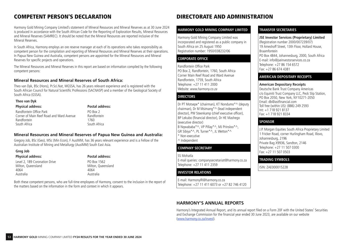 53 HARMONY GOLD MINING COMPANY LIMITED FY24 RESULTS FOR THE YEAR ENDED 30 JUNE 2024 Harmony Gold Mining Company Limited’s statement of Mineral Resources and Mineral Reserves as at 30 June 2024 is produced in accordance with the South African Code for the Reporting of Exploration Results, Mineral Resources and Mineral Reserves (SAMREC). It should be noted that the Mineral Resources are reported inclusive of the Mineral Reserves. In South Africa, Harmony employs an ore reserve manager at each of its operations who takes responsibility as competent person for the compilation and reporting of Mineral Resources and Mineral Reserves at their operations. In Papua New Guinea and Australia, competent persons are appointed for the Mineral Resources and Mineral Reserves for specific projects and operations. The Mineral Resources and Mineral Reserves in this report are based on information compiled by the following competent persons: Mineral Resources and Mineral Reserves of South Africa: Theo van Dyk, BSc (Hons), Pr.Sci.Nat, MGSSA, has 26 years relevant experience and is registered with the South African Council for Natural Scientific Professions (SACNASP) and a member of the Geological Society of South Africa (GSSA). Theo van Dyk Physical address: Postal address: Randfontein Office Park Corner of Main Reef Road and Ward Avenue Randfontein South Africa PO Box 2 Randfontein 1760 South Africa Mineral Resources and Mineral Reserves of Papua New Guinea and Australia: Gregory Job, BSc (Geo), MSc (Min Econ), F AusIMM, has 36 years relevant experience and is a Fellow of the Australian Institute of Mining and Metallurgy (AusIMM) South East Asia. Greg Job Physical address: Postal address: Level 2, 189 Coronation Drive Milton, Queensland 4064 Australia PO Box 1562 Milton, Queensland 4064 Australia Both these competent persons, who are full-time employees of Harmony, consent to the inclusion in the report of the matters based on the information in the form and context in which it appears. COMPETENT PERSON'S DECLARATION HARMONY GOLD MINING COMPANY LIMITED Harmony Gold Mining Company Limited was incorporated and registered as a public company in South Africa on 25 August 1950 Registration number: 1950/038232/06 CORPORATE OFFICE Randfontein Office Park PO Box 2, Randfontein, 1760, South Africa Corner Main Reef Road and Ward Avenue Randfontein, 1759, South Africa Telephone: +27 11 411 2000 Website: www.harmony.co.za DIRECTORS Dr PT Motsepe* (chairman), KT Nondumo*^ (deputy chairman), Dr M Msimang*^ (lead independent director), PW Steenkamp (chief executive officer), BP Lekubo (financial director), Dr HE Mashego (executive director) B Nqwababa*^, VP Pillay*^, MJ Prinsloo*^, GR Sibiya*^, PL Turner*^, JL Wetton*^ * Non-executive ^ Independent COMPANY SECRETARY SS Mohatla E-mail queries: companysecretariat@harmony.co.za Telephone: +27 11 411 2359 INVESTOR RELATIONS E-mail: HarmonyIR@harmony.co.za Telephone: +27 11 411 6073 or +27 82 746 4120 DIRECTORATE AND ADMINISTRATION TRANSFER SECRETARIES JSE Investor Services (Proprietary) Limited (Registration number 2000/007239/07) 19 Ameshoff Street, 13th Floor, Hollard House, Braamfontein PO Box 4844, Johannesburg, 2000, South Africa E-mail: info@jseinvestorservices.co.za Telephone: +27 86 154 6572 Fax: +27 86 674 4381 AMERICAN DEPOSITARY RECEIPTS American Depositary Receipts Deutsche Bank Trust Company Americas c/o Equiniti Trust Company LLC, Peck Slip Station, PO Box 2050, New York, NY10271-2050 Email: db@astfinancial.com Toll free (within US): (886) 249 2593 Int: +1 718 921 8137 Fax: +1 718 921 8334 SPONSOR J.P. Morgan Equities South Africa Proprietary Limited 1 Fricker Road, corner Hurlingham Road, Illovo, Johannesburg, 2196 Private Bag X9936, Sandton, 2146 Telephone: +27 11 507 0300 Fax: +27 11 507 0503 TRADING SYMBOLS ISIN: ZAE000015228 HARMONY’S ANNUAL REPORTS Harmony’s Integrated Annual Report, and its annual report filed on a Form 20F with the United States’ Securities and Exchange Commission for the financial year ended 30 June 2023, are available on our website (www.harmony.co.za/invest).