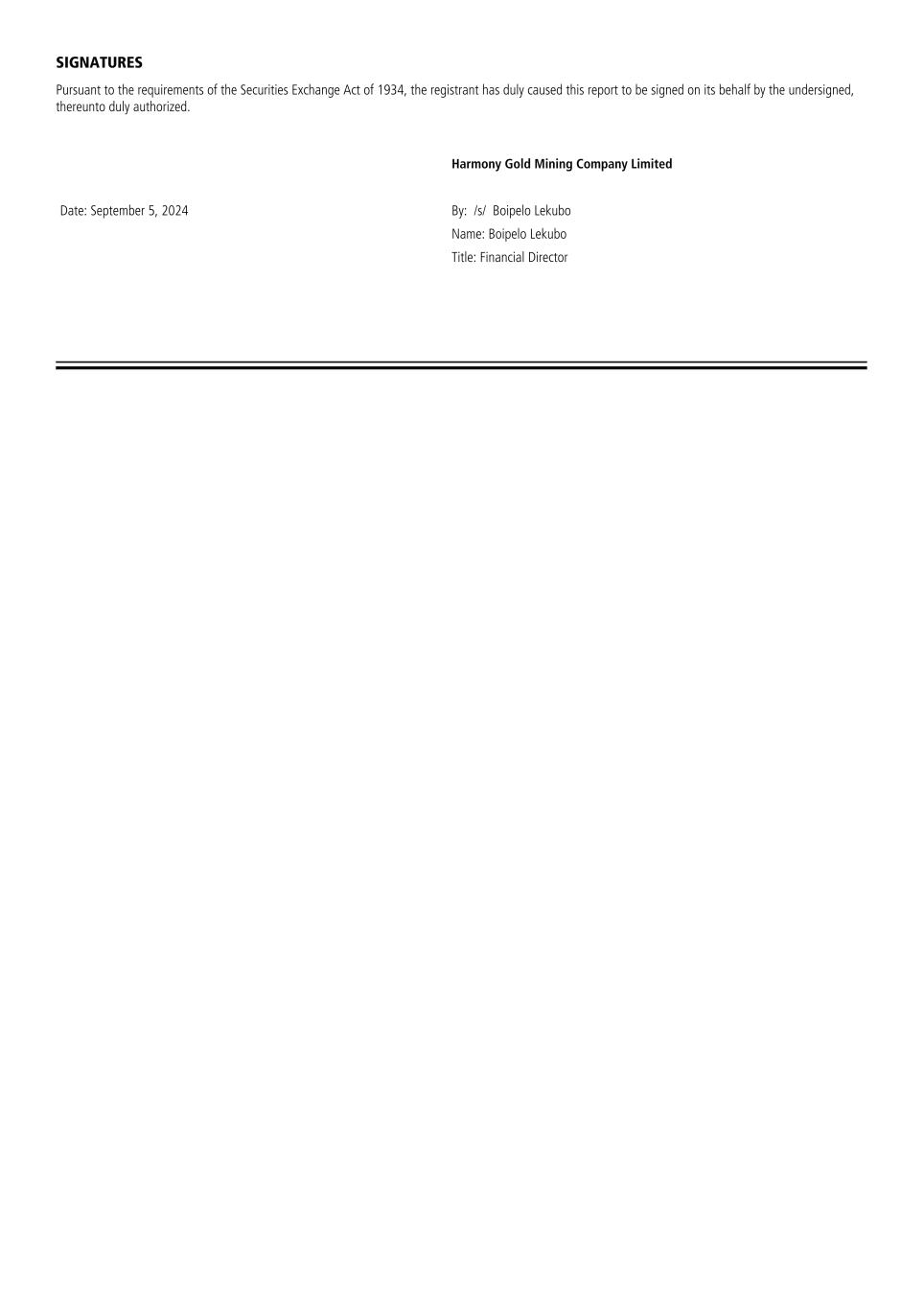SIGNATURES Pursuant to the requirements of the Securities Exchange Act of 1934, the registrant has duly caused this report to be signed on its behalf by the undersigned, thereunto duly authorized. Harmony Gold Mining Company Limited Date: September 5, 2024 By: /s/ Boipelo Lekubo Name: Boipelo Lekubo Title: Financial Director