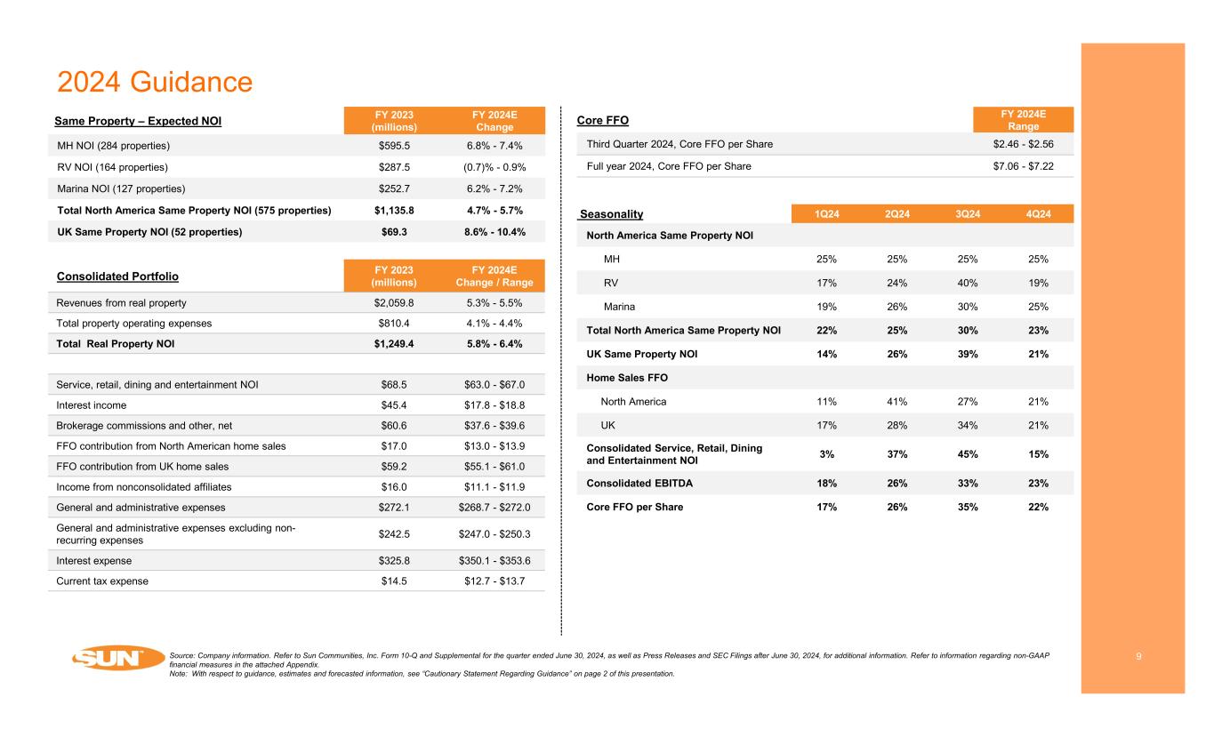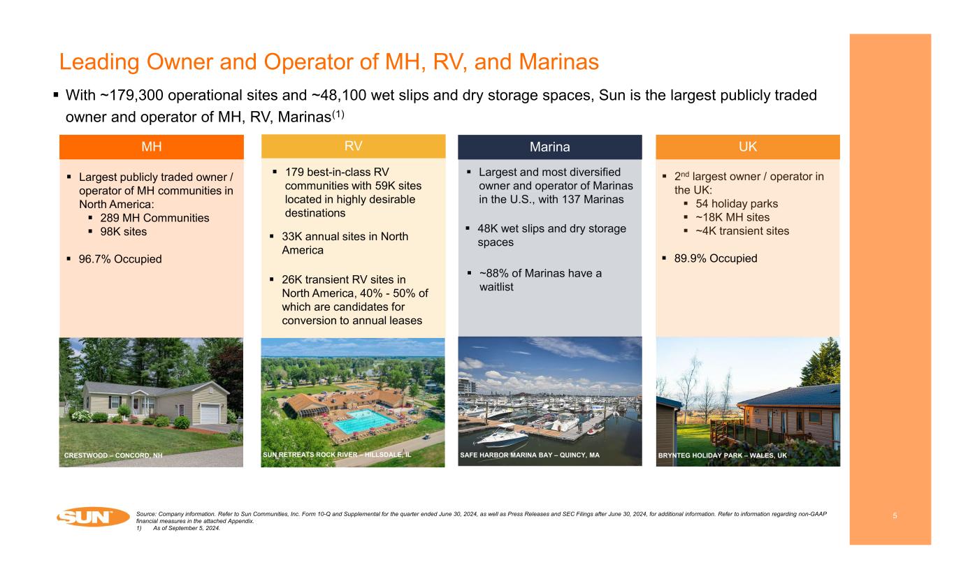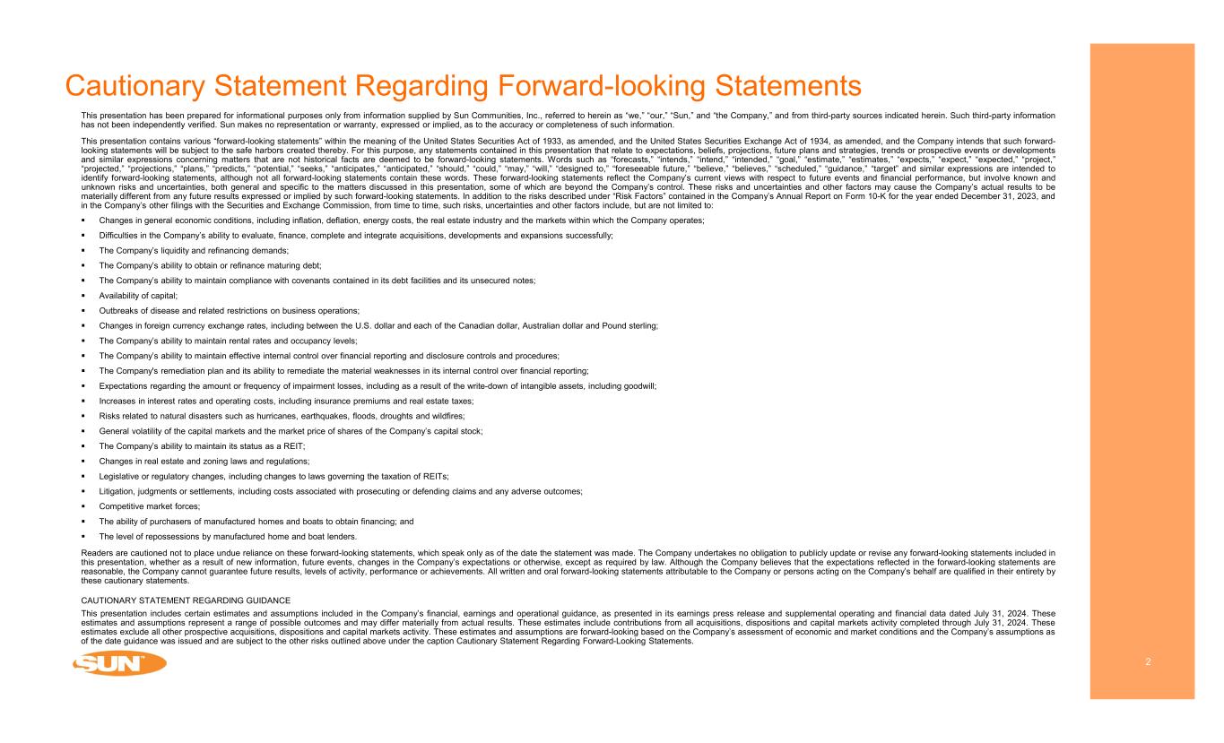 Cautionary Statement Regarding Forward-looking Statements 2 This presentation has been prepared for informational purposes only from information supplied by Sun Communities, Inc., referred to herein as “we,” “our,” “Sun,” and “the Company,” and from third-party sources indicated herein. Such third-party information has not been independently verified. Sun makes no representation or warranty, expressed or implied, as to the accuracy or completeness of such information. This presentation contains various “forward-looking statements” within the meaning of the United States Securities Act of 1933, as amended, and the United States Securities Exchange Act of 1934, as amended, and the Company intends that such forward- looking statements will be subject to the safe harbors created thereby. For this purpose, any statements contained in this presentation that relate to expectations, beliefs, projections, future plans and strategies, trends or prospective events or developments and similar expressions concerning matters that are not historical facts are deemed to be forward-looking statements. Words such as “forecasts,” “intends,” “intend,” “intended,” “goal,” “estimate,” “estimates,” “expects,” “expect,” “expected,” “project,” “projected,” “projections,” “plans,” “predicts,” “potential,” “seeks,” “anticipates,” “anticipated,” “should,” “could,” “may,” “will,” “designed to,” “foreseeable future,” “believe,” “believes,” “scheduled,” “guidance,” “target” and similar expressions are intended to identify forward-looking statements, although not all forward-looking statements contain these words. These forward-looking statements reflect the Company’s current views with respect to future events and financial performance, but involve known and unknown risks and uncertainties, both general and specific to the matters discussed in this presentation, some of which are beyond the Company’s control. These risks and uncertainties and other factors may cause the Company’s actual results to be materially different from any future results expressed or implied by such forward-looking statements. In addition to the risks described under “Risk Factors” contained in the Company’s Annual Report on Form 10-K for the year ended December 31, 2023, and in the Company’s other filings with the Securities and Exchange Commission, from time to time, such risks, uncertainties and other factors include, but are not limited to: Changes in general economic conditions, including inflation, deflation, energy costs, the real estate industry and the markets within which the Company operates; Difficulties in the Company’s ability to evaluate, finance, complete and integrate acquisitions, developments and expansions successfully; The Company’s liquidity and refinancing demands; The Company’s ability to obtain or refinance maturing debt; The Company’s ability to maintain compliance with covenants contained in its debt facilities and its unsecured notes; Availability of capital; Outbreaks of disease and related restrictions on business operations; Changes in foreign currency exchange rates, including between the U.S. dollar and each of the Canadian dollar, Australian dollar and Pound sterling; The Company’s ability to maintain rental rates and occupancy levels; The Company’s ability to maintain effective internal control over financial reporting and disclosure controls and procedures; The Company's remediation plan and its ability to remediate the material weaknesses in its internal control over financial reporting; Expectations regarding the amount or frequency of impairment losses, including as a result of the write-down of intangible assets, including goodwill; Increases in interest rates and operating costs, including insurance premiums and real estate taxes; Risks related to natural disasters such as hurricanes, earthquakes, floods, droughts and wildfires; General volatility of the capital markets and the market price of shares of the Company’s capital stock; The Company’s ability to maintain its status as a REIT; Changes in real estate and zoning laws and regulations; Legislative or regulatory changes, including changes to laws governing the taxation of REITs; Litigation, judgments or settlements, including costs associated with prosecuting or defending claims and any adverse outcomes; Competitive market forces; The ability of purchasers of manufactured homes and boats to obtain financing; and The level of repossessions by manufactured home and boat lenders. Readers are cautioned not to place undue reliance on these forward-looking statements, which speak only as of the date the statement was made. The Company undertakes no obligation to publicly update or revise any forward-looking statements included in this presentation, whether as a result of new information, future events, changes in the Company’s expectations or otherwise, except as required by law. Although the Company believes that the expectations reflected in the forward-looking statements are reasonable, the Company cannot guarantee future results, levels of activity, performance or achievements. All written and oral forward-looking statements attributable to the Company or persons acting on the Company’s behalf are qualified in their entirety by these cautionary statements. CAUTIONARY STATEMENT REGARDING GUIDANCE This presentation includes certain estimates and assumptions included in the Company’s financial, earnings and operational guidance, as presented in its earnings press release and supplemental operating and financial data dated July 31, 2024. These estimates and assumptions represent a range of possible outcomes and may differ materially from actual results. These estimates include contributions from all acquisitions, dispositions and capital markets activity completed through July 31, 2