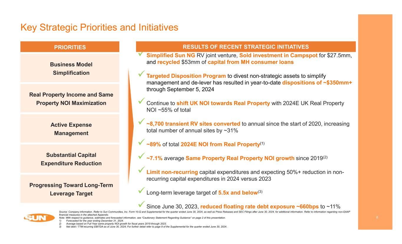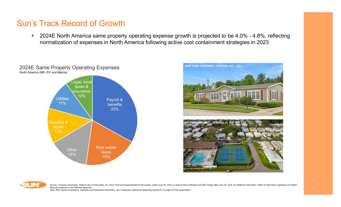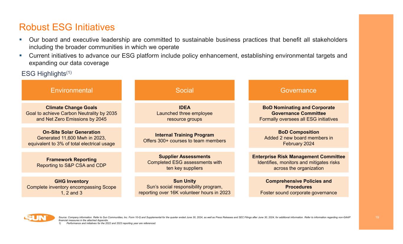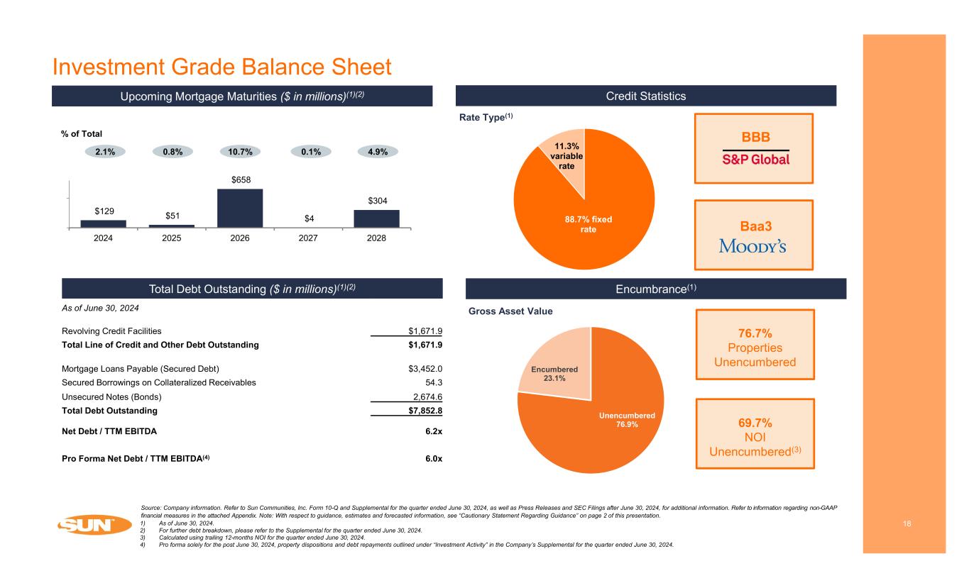 Cautionary Statement Regarding Forward-looking Statements 2 This presentation has been prepared for informational purposes only from information supplied by Sun Communities, Inc., referred to herein as “we,” “our,” “Sun,” and “the Company,” and from third-party sources indicated herein. Such third-party information has not been independently verified. Sun makes no representation or warranty, expressed or implied, as to the accuracy or completeness of such information. This presentation contains various “forward-looking statements” within the meaning of the United States Securities Act of 1933, as amended, and the United States Securities Exchange Act of 1934, as amended, and the Company intends that such forward- looking statements will be subject to the safe harbors created thereby. For this purpose, any statements contained in this presentation that relate to expectations, beliefs, projections, future plans and strategies, trends or prospective events or developments and similar expressions concerning matters that are not historical facts are deemed to be forward-looking statements. Words such as “forecasts,” “intends,” “intend,” “intended,” “goal,” “estimate,” “estimates,” “expects,” “expect,” “expected,” “project,” “projected,” “projections,” “plans,” “predicts,” “potential,” “seeks,” “anticipates,” “anticipated,” “should,” “could,” “may,” “will,” “designed to,” “foreseeable future,” “believe,” “believes,” “scheduled,” “guidance,” “target” and similar expressions are intended to identify forward-looking statements, although not all forward-looking statements contain these words. These forward-looking statements reflect the Company’s current views with respect to future events and financial performance, but involve known and unknown risks and uncertainties, both general and specific to the matters discussed in this presentation, some of which are beyond the Company’s control. These risks and uncertainties and other factors may cause the Company’s actual results to be materially different from any future results expressed or implied by such forward-looking statements. In addition to the risks described under “Risk Factors” contained in the Company’s Annual Report on Form 10-K for the year ended December 31, 2023, and in the Company’s other filings with the Securities and Exchange Commission, from time to time, such risks, uncertainties and other factors include, but are not limited to: Changes in general economic conditions, including inflation, deflation, energy costs, the real estate industry and the markets within which the Company operates; Difficulties in the Company’s ability to evaluate, finance, complete and integrate acquisitions, developments and expansions successfully; The Company’s liquidity and refinancing demands; The Company’s ability to obtain or refinance maturing debt; The Company’s ability to maintain compliance with covenants contained in its debt facilities and its unsecured notes; Availability of capital; Outbreaks of disease and related restrictions on business operations; Changes in foreign currency exchange rates, including between the U.S. dollar and each of the Canadian dollar, Australian dollar and Pound sterling; The Company’s ability to maintain rental rates and occupancy levels; The Company’s ability to maintain effective internal control over financial reporting and disclosure controls and procedures; The Company's remediation plan and its ability to remediate the material weaknesses in its internal control over financial reporting; Expectations regarding the amount or frequency of impairment losses, including as a result of the write-down of intangible assets, including goodwill; Increases in interest rates and operating costs, including insurance premiums and real estate taxes; Risks related to natural disasters such as hurricanes, earthquakes, floods, droughts and wildfires; General volatility of the capital markets and the market price of shares of the Company’s capital stock; The Company’s ability to maintain its status as a REIT; Changes in real estate and zoning laws and regulations; Legislative or regulatory changes, including changes to laws governing the taxation of REITs; Litigation, judgments or settlements, including costs associated with prosecuting or defending claims and any adverse outcomes; Competitive market forces; The ability of purchasers of manufactured homes and boats to obtain financing; and The level of repossessions by manufactured home and boat lenders. Readers are cautioned not to place undue reliance on these forward-looking statements, which speak only as of the date the statement was made. The Company undertakes no obligation to publicly update or revise any forward-looking statements included in this presentation, whether as a result of new information, future events, changes in the Company’s expectations or otherwise, except as required by law. Although the Company believes that the expectations reflected in the forward-looking statements are reasonable, the Company cannot guarantee future results, levels of activity, performance or achievements. All written and oral forward-looking statements attributable to the Company or persons acting on the Company’s behalf are qualified in their entirety by these cautionary statements. CAUTIONARY STATEMENT REGARDING GUIDANCE This presentation includes certain estimates and assumptions included in the Company’s financial, earnings and operational guidance, as presented in its earnings press release and supplemental operating and financial data dated July 31, 2024. These estimates and assumptions represent a range of possible outcomes and may differ materially from actual results. These estimates include contributions from all acquisitions, dispositions and capital markets activity completed through July 31, 2