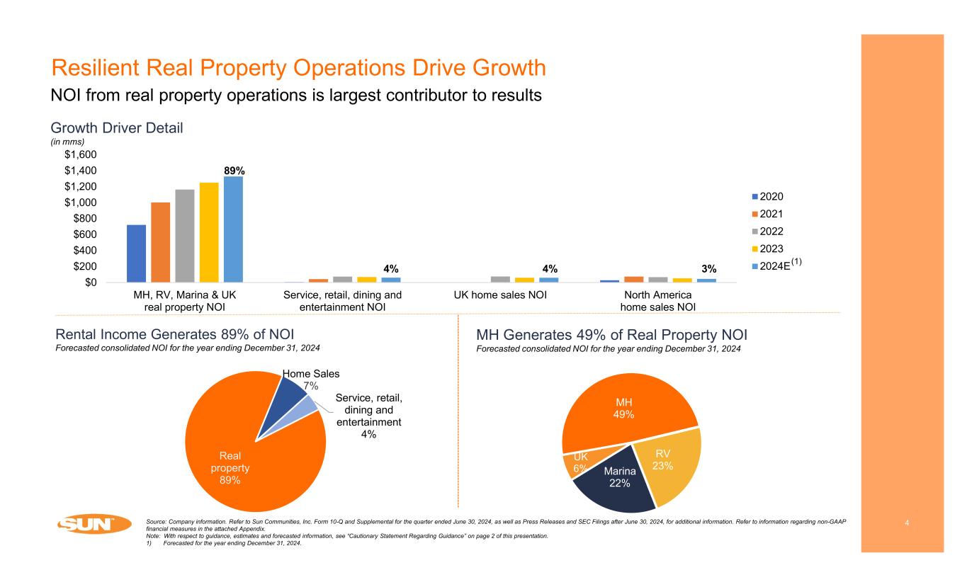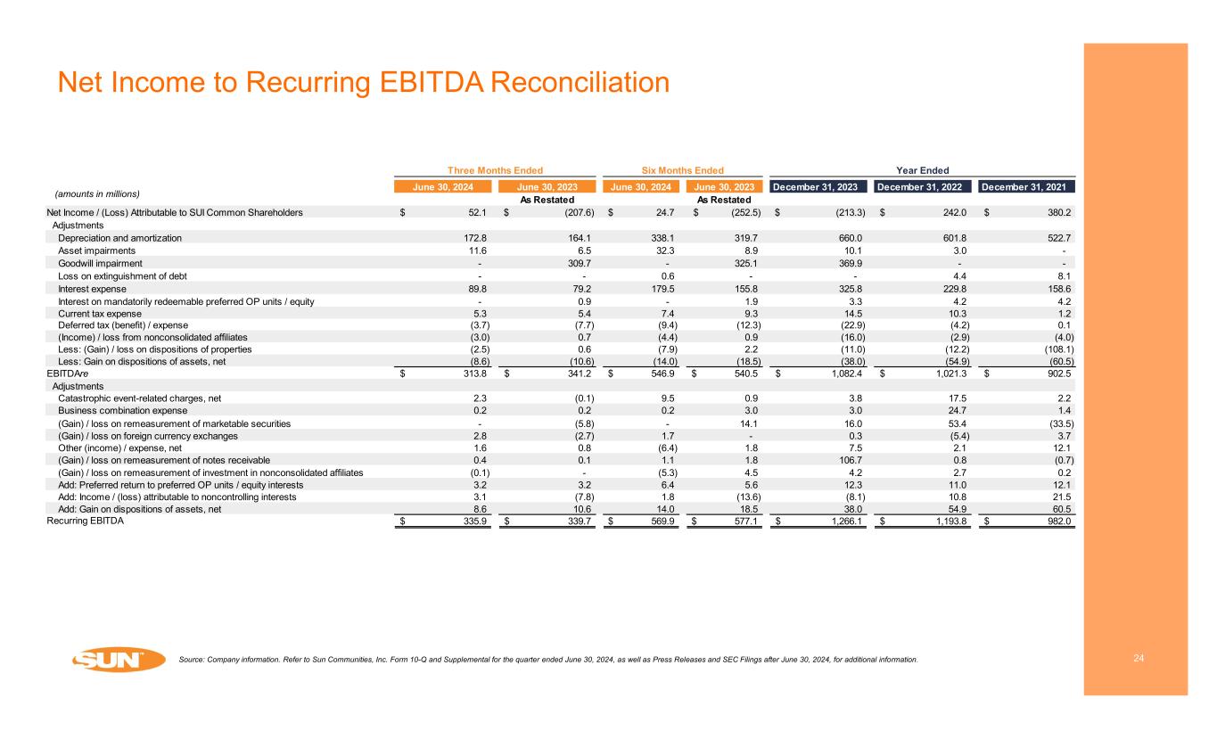 June 30, 2024 June 30, 2023 June 30, 2024 June 30, 2023 December 31, 2023 December 31, 2022 December 31, 2021 As Restated As Restated Net Income / (Loss) Attributable to SUI Common Shareholders 52.1$ (207.6)$ 24.7$ (252.5)$ (213.3)$ 242.0$ 380.2$ Interest income (5.3) (14.0) (9.9) (25.4) (45.4) (35.2) (12.2) Brokerage commissions and other revenues, net (11.2) (9.8) (14.2) (19.3) (60.6) (34.9) (30.2) General and administrative 65.3 62.7 143.8 126.8 272.1 257.4 181.2 Catastrophic event-related charges, net 2.3 (0.1) 9.5 0.9 3.8 17.5 2.2 Business combination expense 0.2 0.2 0.2 3.0 3.0 24.7 1.4 Depreciation and amortization 172.8 164.1 338.1 319.7 660.0 601.8 522.7 Asset impairments 11.6 6.5 32.3 8.9 10.1 3.0 - Goodwill impairment - 309.7 - 325.1 369.9 - - Loss on extinguishment of debt - - 0.6 - - 4.4 8.1 Interest expense 89.8 79.2 179.5 155.8 325.8 229.8 158.6 Interest on mandatorily redeemable preferred OP units / equity - 0.9 - 1.9 3.3 4.2 4.2 (Gain) / loss on remeasurement of marketable securities - (5.8) - 14.1 16.0 53.4 (33.5) (Gain) / loss on foreign currency exchanges 2.8 (2.7) 1.7 - 0.3 (5.4) 3.7 (Gain) / loss on disposition of properties (2.5) 0.6 (7.9) 2.2 (11.0) (12.2) (108.1) Other (income) / expense, net 1.6 0.8 (6.4) 1.8 7.5 2.1 12.1 (Gain) / loss on remeasurement of notes receivable 0.4 0.1 1.1 1.8 106.7 0.8 (0.7) (Income) / loss from nonconsolidated affiliates (3.0) 0.7 (4.4) 0.9 (16.0) (2.9) (4.0) (Gain) / loss on remeasurement of investment in nonconsolidated affiliates (0.1) - (5.3) 4.5 4.2 2.7 0.2 Current tax expense 5.3 5.4 7.4 9.3 14.5 10.3 1.2 Deferred tax (benefit) / expense (3.7) (7.7) (9.4) (12.3) (22.9) (4.2) 0.1 Add: Preferred return to preferred OP units / equity interests 3.2 3.2 6.4 5.6 12.3 11.0 12.1 Add: Income / (loss) attributable to noncontrolling interests 3.1 (7.8) 1.8 (13.6) (8.1) 10.8 21.5 NOI 384.7$ 378.6$ 689.6$ 659.2$ 1,432.2$ 1,381.1$ 1,120.8$ June 30, 2024 June 30, 2023 June 30, 2024 June 30, 2023 December 31, 2023 December 31, 2022 December 31, 2021 As Restated As Restated Real Property NOI 331.3$ 316.4$ 617.2$ 570.7$ 1,249.4$ 1,163.0$ 978.7$ Home Sales NOI 30.7 36.2 47.7 59.9 114.3 143.4 70.0 Service, retail dining and entertainment NOI 22.7 26.0 24.7 28.6 68.5 74.7 72.1 NOI 384.7$ 378.6$ 689.6$ 659.2$ 1,432.2$ 1,381.1$ 1,120.8$ Year Ended Year Ended Three Months Ended Three Months Ended Six Months Ended Six Months Ended Net Income to NOI Reconciliation 23 (amounts in millions) Source: Company information. Refer to Sun Communities, Inc. Form 10-Q and Supplemental for the quarter ended June 30, 2024, as well as Press Releases and SEC Filings after June 30, 2024, for additional information.