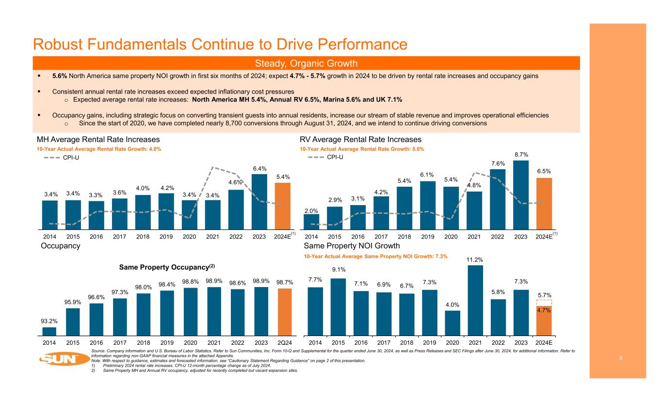 5 With ~179,300 operational sites and ~48,100 wet slips and dry storage spaces, Sun is the largest publicly traded owner and operator of MH, RV, Marinas(1) Leading Owner and Operator of MH, RV, and Marinas MH Largest publicly traded owner / operator of MH communities in North America: 289 MH Communities 98K sites 96.7% Occupied 2nd largest owner / operator in the UK: 54 holiday parks ~18K MH sites ~4K transient sites RV 179 best-in-class RV communities with 59K sites located in highly desirable destinations 33K annual sites in North America 26K transient RV sites in North America, 40% - 50% of which are candidates for conversion to annual leases SUN RETREATS ROCK RIVER – HILLSDALE, IL Largest and most diversified owner and operator of Marinas in the U.S., with 137 Marinas Marina 48K wet slips and dry storage spaces ~88% of Marinas have a waitlist CRESTWOOD – CONCORD, NH Source: Company information. Refer to Sun Communities, Inc. Form 10-Q and Supplemental for the quarter ended June 30, 2024, as well as Press Releases and SEC Filings after June 30, 2024, for additional information. Refer to information regarding non-GAAP financial measures in the attached Appendix. 1) As of September 5, 2024. UK BRYNTEG HOLIDAY PARK – WALES, UK 89.9% Occupied SAFE HARBOR MARINA BAY – QUINCY, MA