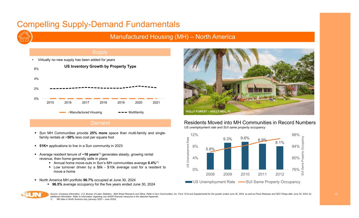 2024 Guidance 9 Seasonality 1Q24 2Q24 3Q24 4Q24 North America Same Property NOI MH 25% 25% 25% 25% RV 17% 24% 40% 19% Marina 19% 26% 30% 25% Total North America Same Property NOI 22% 25% 30% 23% UK Same Property NOI 14% 26% 39% 21% Home Sales FFO North America 11% 41% 27% 21% UK 17% 28% 34% 21% Consolidated Service, Retail, Dining and Entertainment NOI 3% 37% 45% 15% Consolidated EBITDA 18% 26% 33% 23% Core FFO per Share 17% 26% 35% 22% Core FFO FY 2024E Range Third Quarter 2024, Core FFO per Share $2.46 - $2.56 Full year 2024, Core FFO per Share $7.06 - $7.22 Same Property – Expected NOI FY 2023 (millions) FY 2024E Change MH NOI (284 properties) $595.5 6.8% - 7.4% RV NOI (164 properties) $287.5 (0.7)% - 0.9% Marina NOI (127 properties) $252.7 6.2% - 7.2% Total North America Same Property NOI (575 properties) $1,135.8 4.7% - 5.7% UK Same Property NOI (52 properties) $69.3 8.6% - 10.4% Consolidated Portfolio FY 2023 (millions) FY 2024E Change / Range Revenues from real property $2,059.8 5.3% - 5.5% Total property operating expenses $810.4 4.1% - 4.4% Total Real Property NOI $1,249.4 5.8% - 6.4% Service, retail, dining and entertainment NOI $68.5 $63.0 - $67.0 Interest income $45.4 $17.8 - $18.8 Brokerage commissions and other, net $60.6 $37.6 - $39.6 FFO contribution from North American home sales $17.0 $13.0 - $13.9 FFO contribution from UK home sales $59.2 $55.1 - $61.0 Income from nonconsolidated affiliates $16.0 $11.1 - $11.9 General and administrative expenses $272.1 $268.7 - $272.0 General and administrative expenses excluding non- recurring expenses $242.5 $247.0 - $250.3 Interest expense $325.8 $350.1 - $353.6 Current tax expense $14.5 $12.7 - $13.7 Source: Company information. Refer to Sun Communities, Inc. Form 10-Q and Supplemental for the quarter ended June 30, 2024, as well as Press Releases and SEC Filings after June 30, 2024, for additional information. Refer to information regarding non-GAAP financial measures in the attached Appendix. Note: With respect to guidance, estimates and forecasted information, see “Cautionary Statement Regarding Guidance” on page 2 of this presentation.