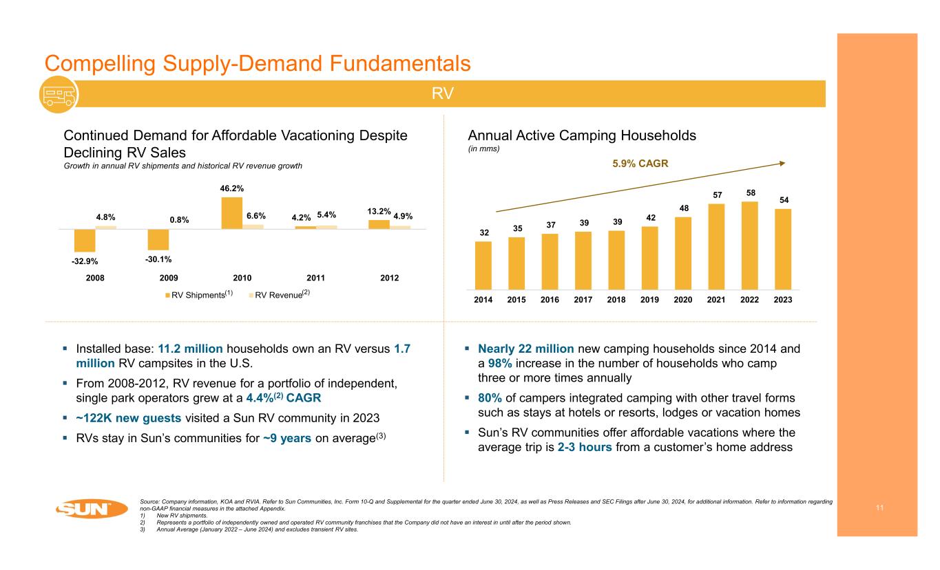 Compelling Supply-Demand Fundamentals 10 Manufactured Housing (MH) – North America Source: Company information, U.S. Bureau of Labor Statistics., Wall Street Research and Zillow. Refer to Sun Communities, Inc. Form 10-Q and Supplemental for the quarter ended June 30, 2024, as well as Press Releases and SEC Filings after June 30, 2024, for additional information. Refer to information regarding non-GAAP financial measures in the attached Appendix. 1) MH sites in North America only (January 2022 – June 2024). 0% 2% 4% 6% 2015 2016 2017 2018 2019 2020 2021 US Inventory Growth by Property Type Manufactured Housing Multifamily BOWLAND FELL- YORKSHIRE, UK • Virtually no new supply has been added for years Sun MH Communities provide 25% more space than multi-family and single- family rentals at ~50% less cost per square foot 51K+ applications to live in a Sun community in 2023 Average resident tenure of ~16 years(1) generates steady, growing rental revenue, then home generally sells in place Annual home move-outs in Sun’s MH communities average 0.4%(1) Low turnover driven by a $6k - $10k average cost for a resident to move a home North America MH portfolio 96.7% occupied at June 30, 2024 96.5% average occupancy for the five years ended June 30, 2024 Demand Supply Residents Moved into MH Communities in Record Numbers US unemployment rate and SUI same property occupancy HOLLY FOREST – HOLLY HILL, FL 5.8% 9.3% 9.6% 8.9% 8.1% 76% 80% 84% 88% 0% 4% 8% 12% 2008 2009 2010 2011 2012 US Unemployment Rate SUI Same Property Occupancy