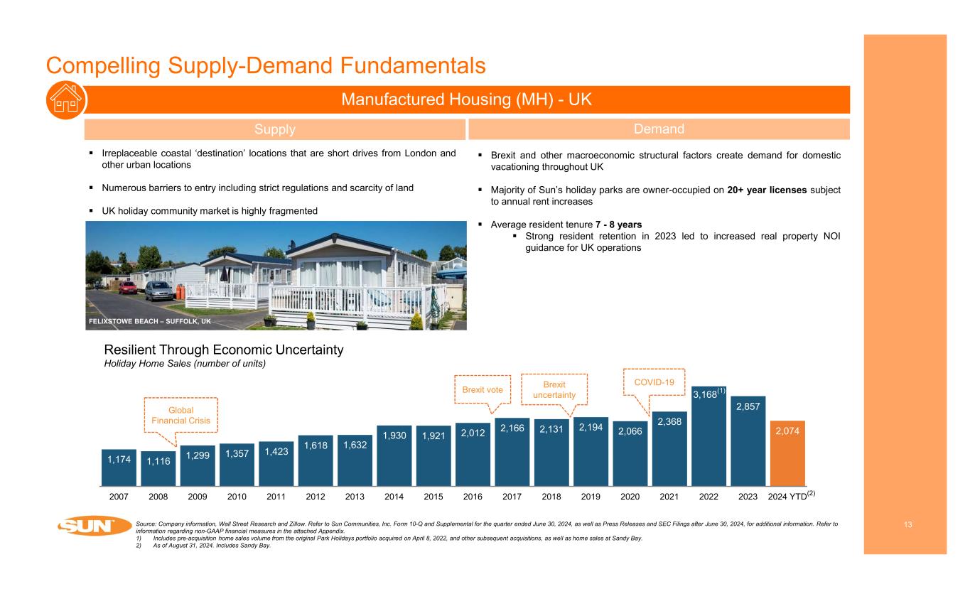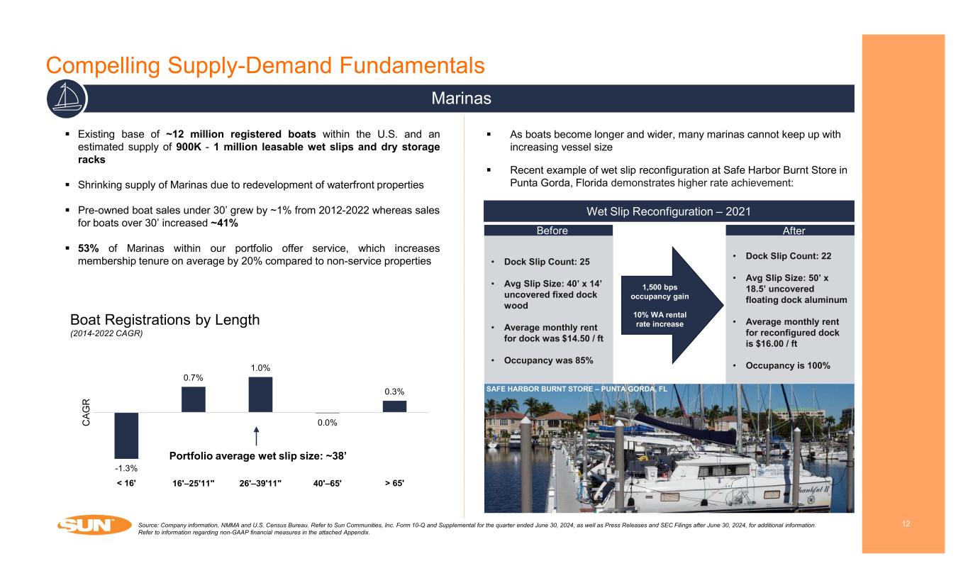 Marinas Compelling Supply-Demand Fundamentals 12Source: Company information, NMMA and U.S. Census Bureau. Refer to Sun Communities, Inc. Form 10-Q and Supplemental for the quarter ended June 30, 2024, as well as Press Releases and SEC Filings after June 30, 2024, for additional information. Refer to information regarding non-GAAP financial measures in the attached Appendix. Existing base of ~12 million registered boats within the U.S. and an estimated supply of 900K - 1 million leasable wet slips and dry storage racks Shrinking supply of Marinas due to redevelopment of waterfront properties Pre-owned boat sales under 30’ grew by ~1% from 2012-2022 whereas sales for boats over 30’ increased ~41% 53% of Marinas within our portfolio offer service, which increases membership tenure on average by 20% compared to non-service properties Boat Registrations by Length (2014-2022 CAGR) -1.3% 0.7% 1.0% 0.0% 0.3% < 16' 16'–25'11" 26'–39'11" 40'–65' > 65' Portfolio average wet slip size: ~38’ As boats become longer and wider, many marinas cannot keep up with increasing vessel size Recent example of wet slip reconfiguration at Safe Harbor Burnt Store in Punta Gorda, Florida demonstrates higher rate achievement: • Dock Slip Count: 22 • Avg Slip Size: 50’ x 18.5’ uncovered floating dock aluminum • Average monthly rent for reconfigured dock is $16.00 / ft • Occupancy is 100% Wet Slip Reconfiguration – 2021 • Dock Slip Count: 25 • Avg Slip Size: 40’ x 14’ uncovered fixed dock wood • Average monthly rent for dock was $14.50 / ft • Occupancy was 85% 1,500 bps occupancy gain 10% WA rental rate increase Before After SAFE HARBOR BURNT STORE – PUNTA GORDA, FL