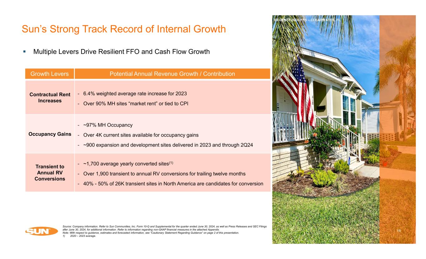 Sun’s Track Record of Growth 15 Multifamily REITsSun Communities Resilient demand, high barriers to entry, and Sun’s investment and operational platform have resulted in consistent, and cycle tested organic cash flow growth For more than 20 years, every individual year or rolling 4-quarter period, Sun has recorded positive same property NOI growth Over the same period, Sun’s average annual same property NOI growth was 5.2%, which is ~210bps greater than that of multifamily REITs of 3.1% Same Property NOI Growth Quarterly Year-over-Year Growth Since 2000 Source: Citi Research, June 2024. Refer to Sun Communities, Inc. Form 10-Q and Supplemental for the quarter ended June 30, 2024, as well as Press Releases and SEC Filings after June 30, 2024, for additional information. Refer to information regarding non- GAAP financial measures in the attached Appendix. 1) Multifamily REITs includes AIRC, AVB, CPT, EQR, ESS, IRT, MAA and UDR. 2) REIT Industry includes Healthcare, Industrial, Manufactured Housing, Multifamily, Mall, Office, Self Storage, Shopping Center, Single Family Rental, Student Housing and Diversified REITs. (1) CAGR Since 2000 Sun Communities Multifamily REITs REIT Industry(1) (2) (15.0%) (10.0%) (5.0%) 0.0% 5.0% 10.0% 15.0% 20.0% 25.0% 5.2% 3.1% 3.2%