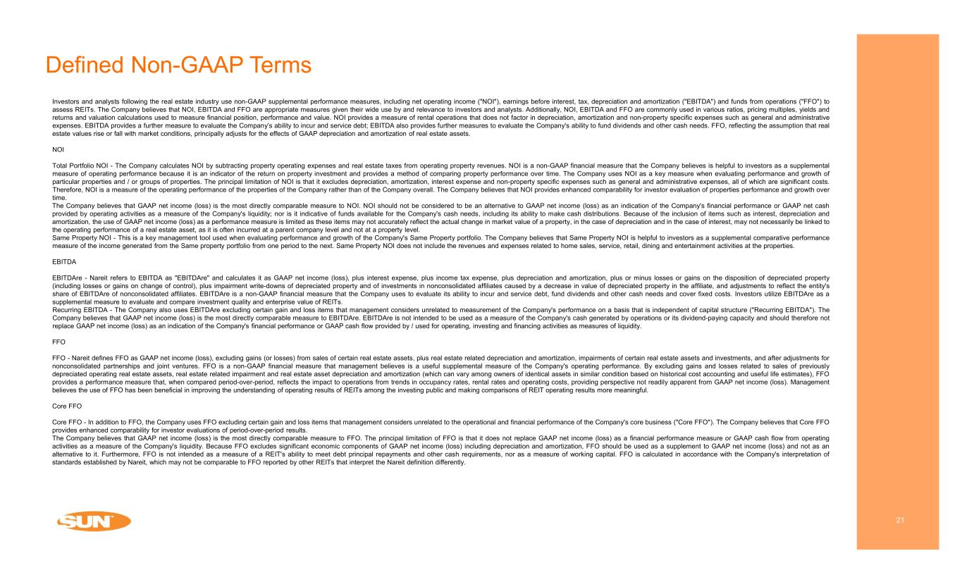 Defined Non-GAAP Terms 21 Investors and analysts following the real estate industry use non-GAAP supplemental performance measures, including net operating income ("NOI"), earnings before interest, tax, depreciation and amortization ("EBITDA") and funds from operations ("FFO") to assess REITs. The Company believes that NOI, EBITDA and FFO are appropriate measures given their wide use by and relevance to investors and analysts. Additionally, NOI, EBITDA and FFO are commonly used in various ratios, pricing multiples, yields and returns and valuation calculations used to measure financial position, performance and value. NOI provides a measure of rental operations that does not factor in depreciation, amortization and non-property specific expenses such as general and administrative expenses. EBITDA provides a further measure to evaluate the Company’s ability to incur and service debt; EBITDA also provides further measures to evaluate the Company's ability to fund dividends and other cash needs. FFO, reflecting the assumption that real estate values rise or fall with market conditions, principally adjusts for the effects of GAAP depreciation and amortization of real estate assets. NOI Total Portfolio NOI - The Company calculates NOI by subtracting property operating expenses and real estate taxes from operating property revenues. NOI is a non-GAAP financial measure that the Company believes is helpful to investors as a supplemental measure of operating performance because it is an indicator of the return on property investment and provides a method of comparing property performance over time. The Company uses NOI as a key measure when evaluating performance and growth of particular properties and / or groups of properties. The principal limitation of NOI is that it excludes depreciation, amortization, interest expense and non-property specific expenses such as general and administrative expenses, all of which are significant costs. Therefore, NOI is a measure of the operating performance of the properties of the Company rather than of the Company overall. The Company believes that NOI provides enhanced comparability for investor evaluation of properties performance and growth over time. The Company believes that GAAP net income (loss) is the most directly comparable measure to NOI. NOI should not be considered to be an alternative to GAAP net income (loss) as an indication of the Company's financial performance or GAAP net cash provided by operating activities as a measure of the Company's liquidity; nor is it indicative of funds available for the Company's cash needs, including its ability to make cash distributions. Because of the inclusion of items such as interest, depreciation and amortization, the use of GAAP net income (loss) as a performance measure is limited as these items may not accurately reflect the actual change in market value of a property, in the case of depreciation and in the case of interest, may not necessarily be linked to the operating performance of a real estate asset, as it is often incurred at a parent company level and not at a property level. Same Property NOI - This is a key management tool used when evaluating performance and growth of the Company's Same Property portfolio. The Company believes that Same Property NOI is helpful to investors as a supplemental comparative performance measure of the income generated from the Same property portfolio from one period to the next. Same Property NOI does not include the revenues and expenses related to home sales, service, retail, dining and entertainment activities at the properties. EBITDA EBITDAre - Nareit refers to EBITDA as "EBITDAre" and calculates it as GAAP net income (loss), plus interest expense, plus income tax expense, plus depreciation and amortization, plus or minus losses or gains on the disposition of depreciated property (including losses or gains on change of control), plus impairment write-downs of depreciated property and of investments in nonconsolidated affiliates caused by a decrease in value of depreciated property in the affiliate, and adjustments to reflect the entity's share of EBITDAre of nonconsolidated affiliates. EBITDAre is a non-GAAP financial measure that the Company uses to evaluate its ability to incur and service debt, fund dividends and other cash needs and cover fixed costs. Investors utilize EBITDAre as a supplemental measure to evaluate and compare investment quality and enterprise value of REITs. Recurring EBITDA - The Company also uses EBITDAre excluding certain gain and loss items that management considers unrelated to measurement of the Company's performance on a basis that is independent of capital structure ("Recurring EBITDA"). The Company believes that GAAP net income (loss) is the most directly comparable measure to EBITDAre. EBITDAre is not intended to be used as a measure of the Company's cash generated by operations or its dividend-paying capacity and should therefore not replace GAAP net income (loss) as an indication of the Company's financial performance or GAAP cash flow provided by / used for operating, investing and financing activities as measures of liquidity. FFO FFO - Nareit defines FFO as GAAP net income (loss), excluding gains (or losses) from sales of certain real estate assets, plus real estate related depreciation and amortization, impairments of certain real estate assets and investments, and after adjustments for nonconsolidated partnerships and joint ventures. FFO is a non-GAAP financial measure that management believes is a useful supplemental measure of the Company's operating performance. By excluding gains and losses related to sales of previously depreciated operating real estate assets, real estate related impairment and real estate asset depreciation and amortization (which can vary among owners of identical assets in similar condition based on historical cost accounting and useful life estimates), FFO provides a performance measure that,