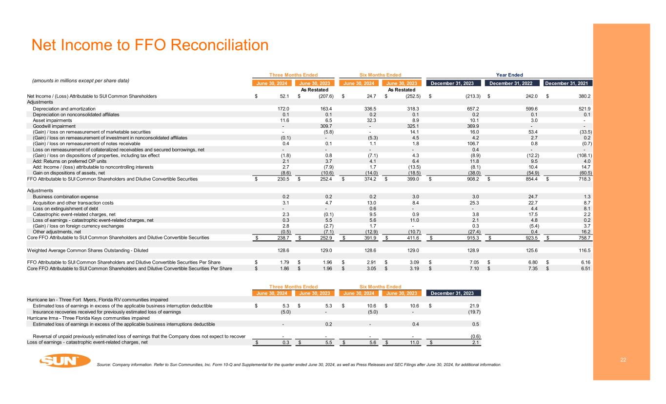 June 30, 2024 June 30, 2023 June 30, 2024 June 30, 2023 December 31, 2023 December 31, 2022 December 31, 2021 As Restated As Restated Net Income / (Loss) Attributable to SUI Common Shareholders 52.1$ (207.6)$ 24.7$ (252.5)$ (213.3)$ 242.0$ 380.2$ Adjustments Depreciation and amortization 172.0 163.4 336.5 318.3 657.2 599.6 521.9 Depreciation on nonconsolidated affiliates 0.1 0.1 0.2 0.1 0.2 0.1 0.1 Asset impairments 11.6 6.5 32.3 8.9 10.1 3.0 - Goodwill impairment - 309.7 - 325.1 369.9 - - (Gain) / loss on remeasurement of marketable securities - (5.8) - 14.1 16.0 53.4 (33.5) (Gain) / loss on remeasurement of investment in nonconsolidated affiliates (0.1) - (5.3) 4.5 4.2 2.7 0.2 (Gain) / loss on remeasurement of notes receivable 0.4 0.1 1.1 1.8 106.7 0.8 (0.7) Loss on remeasurement of collateralized receivables and secured borrowings, net - - - - 0.4 - - (Gain) / loss on dispositions of properties, including tax effect (1.8) 0.8 (7.1) 4.3 (8.9) (12.2) (108.1) Add: Returns on preferred OP units 2.1 3.7 4.1 6.4 11.8 9.5 4.0 Add: Income / (loss) attributable to noncontrolling interests 2.7 (7.9) 1.7 (13.5) (8.1) 10.4 14.7 Gain on dispositions of assets, net (8.6) (10.6) (14.0) (18.5) (38.0) (54.9) (60.5) FFO Attributable to SUI Common Shareholders and Dilutive Convertible Securities 230.5$ 252.4$ 374.2$ 399.0$ 908.2$ 854.4$ 718.3$ Adjustments Business combination expense 0.2 0.2 0.2 3.0 3.0 24.7 1.3 Acquisition and other transaction costs 3.1 4.7 13.0 8.4 25.3 22.7 8.7 Loss on extinguishment of debt - - 0.6 - - 4.4 8.1 Catastrophic event-related charges, net 2.3 (0.1) 9.5 0.9 3.8 17.5 2.2 Loss of earnings - catastrophic event-related charges, net 0.3 5.5 5.6 11.0 2.1 4.8 0.2 (Gain) / loss on foreign currency exchanges 2.8 (2.7) 1.7 - 0.3 (5.4) 3.7 Other adjustments, net (0.5) (7.1) (12.9) (10.7) (27.4) 0.4 16.2 Core FFO Attributable to SUI Common Shareholders and Dilutive Convertible Securities 238.7$ 252.9$ 391.9$ 411.6$ 915.3$ 923.5$ 758.7$ Weighted Average Common Shares Outstanding - Diluted 128.6 129.0 128.6 129.0 128.9 125.6 116.5 FFO Attributable to SUI Common Shareholders and Dilutive Convertible Securities Per Share 1.79$ 1.96$ 2.91$ 3.09$ 7.05$ 6.80$ 6.16$ Core FFO Attributable to SUI Common Shareholders and Dilutive Convertible Securities Per Share 1.86$ 1.96$ 3.05$ 3.19$ 7.10$ 7.35$ 6.51$ June 30, 2024 June 30, 2023 June 30, 2024 June 30, 2023 December 31, 2023 Hurricane Ian - Three Fort Myers, Florida RV communities impaired Estimated loss of earnings in excess of the applicable business interruption deductible 5.3$ 5.3$ 10.6$ 10.6$ 21.9$ Insurance recoveries received for previously estimated loss of earnings (5.0) - (5.0) - (19.7) Hurricane Irma - Three Florida Keys communities impaired Estimated loss of earnings in excess of the applicable business interruptions deductible - 0.2 - 0.4 0.5 Reversal of unpaid previously estimated loss of earnings that the Company does not expect to recover - - - - (0.6) Loss of earnings - catastrophic event-related charges, net 0.3$ 5.5$ 5.6$ 11.0$ 2.1$ Year EndedSix Months EndedThree Months Ended Three Months Ended Six Months Ended Net Income to FFO Reconciliation 22 Source: Company information. Refer to Sun Communities, Inc. Form 10-Q and Supplemental for the quarter ended June 30, 2024, as well as Press Releases and SEC Filings after June 30, 2024, for additional information. (amounts in millions except per share data)